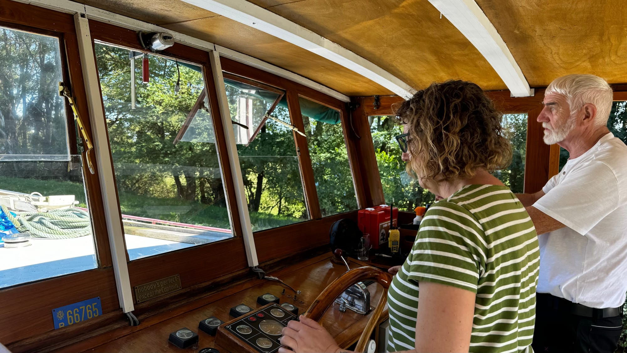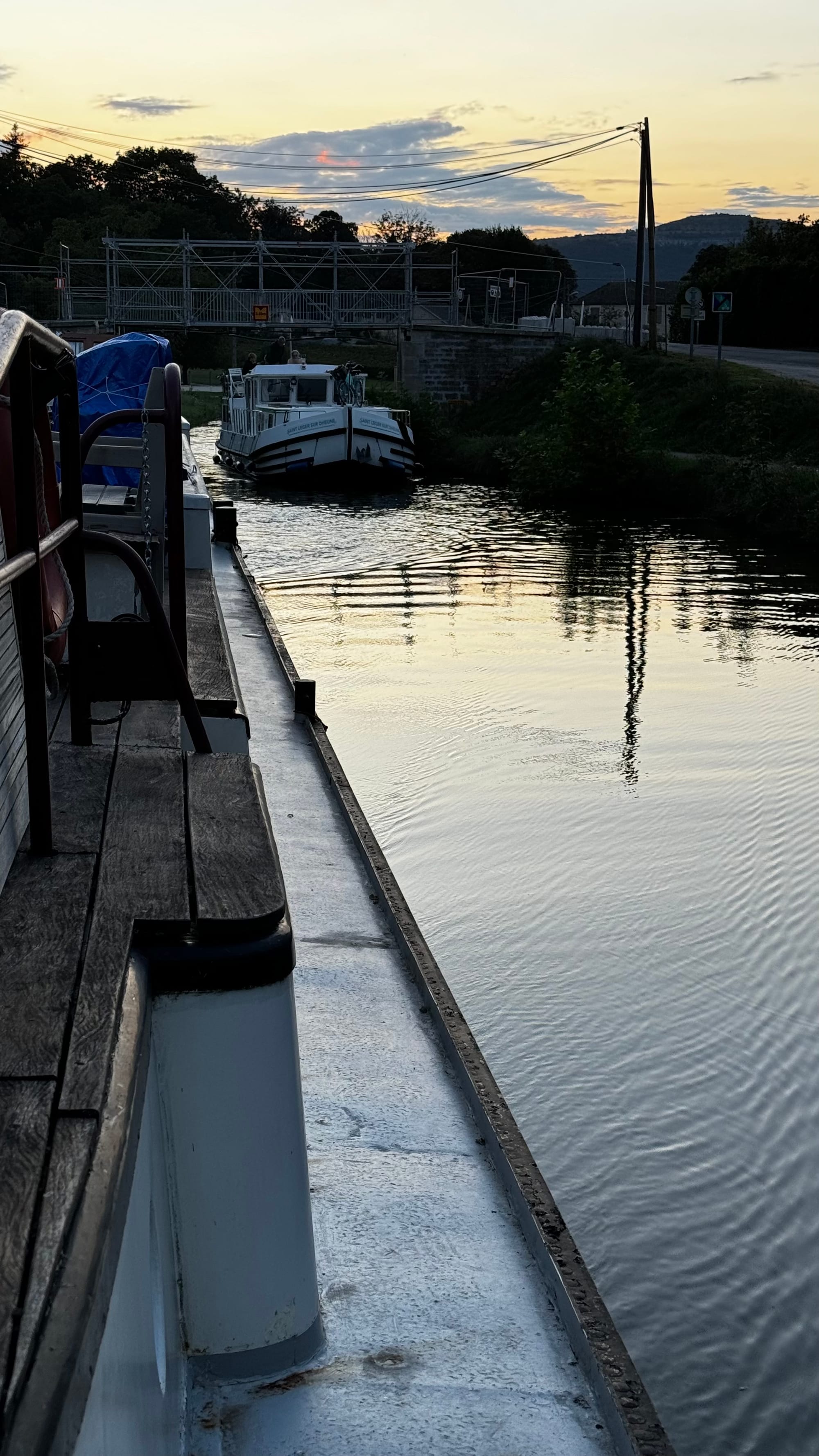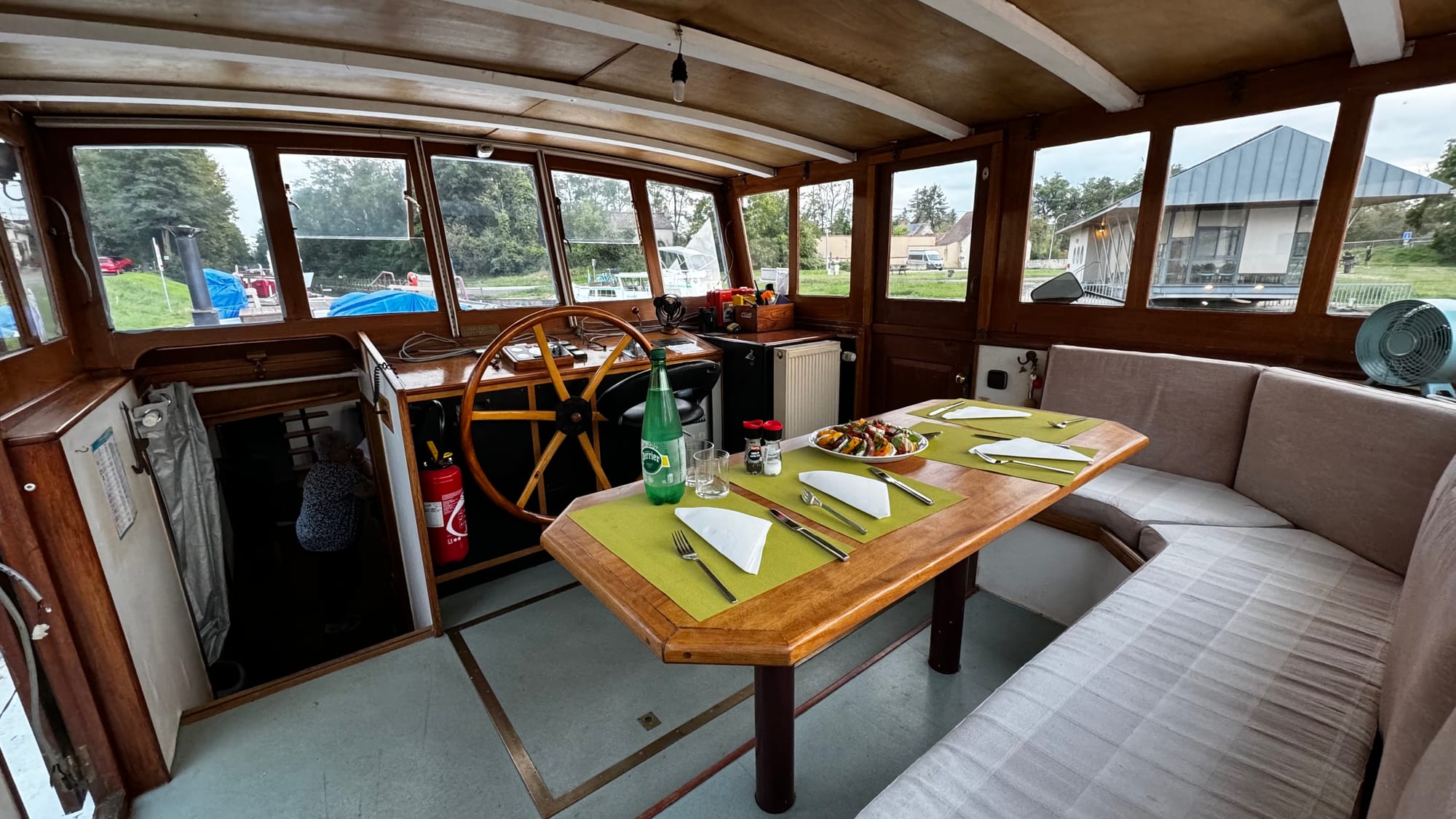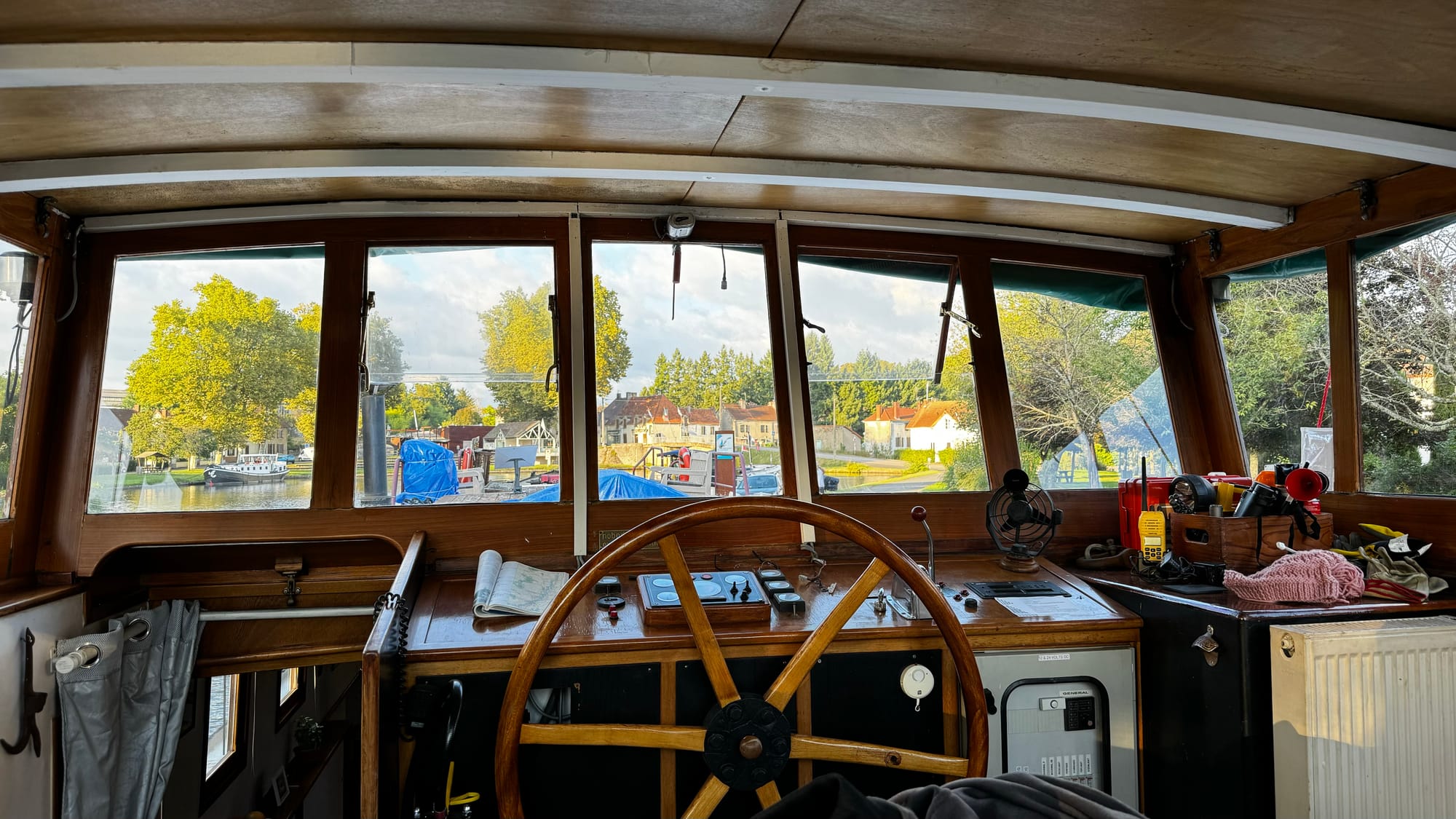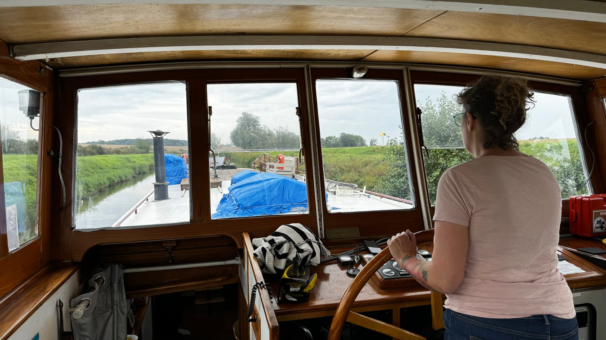 Paul took over steering to save us time as darkness was approaching. With the wheelhouse disassembled, our nav lights didn't work, and we needed to get onto the quay. A smaller plastic rental boat overtook us on a slow corner and immediately stopped and moored, causing extra stress and an emergency break on our part. Clair de Lune is NOT an easy boat to stop. When she's going forward, she will happily continue in that direction for a very long time. If you're navigating in close quarters with a 100-ton steel boat on a narrow waterway, be patient! It's not us that's going to get squashed.