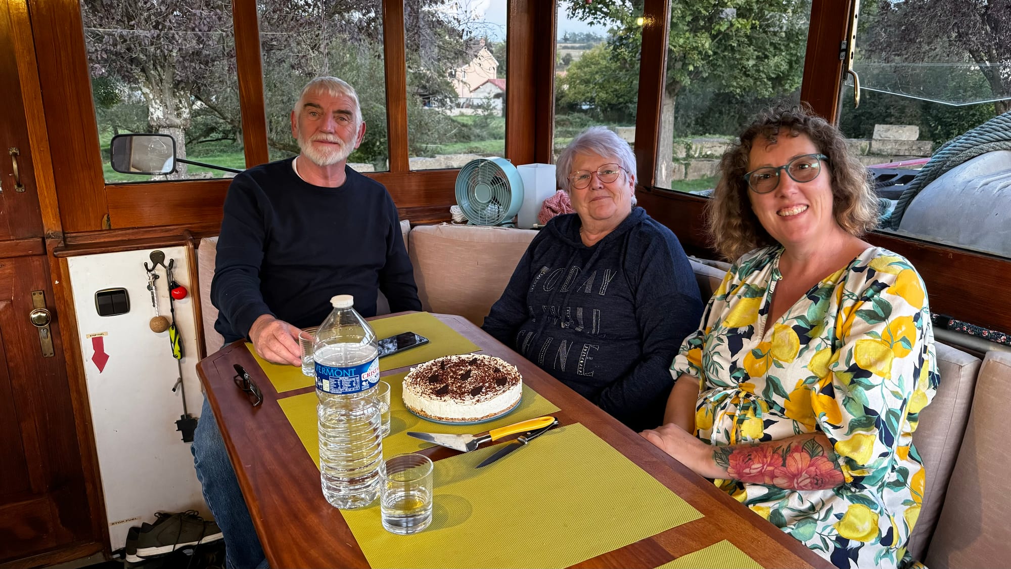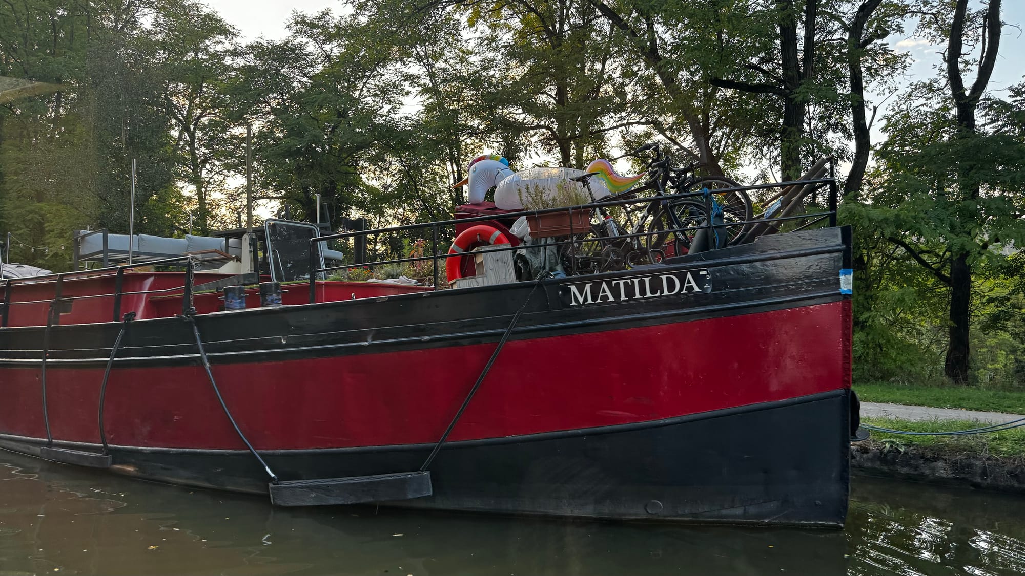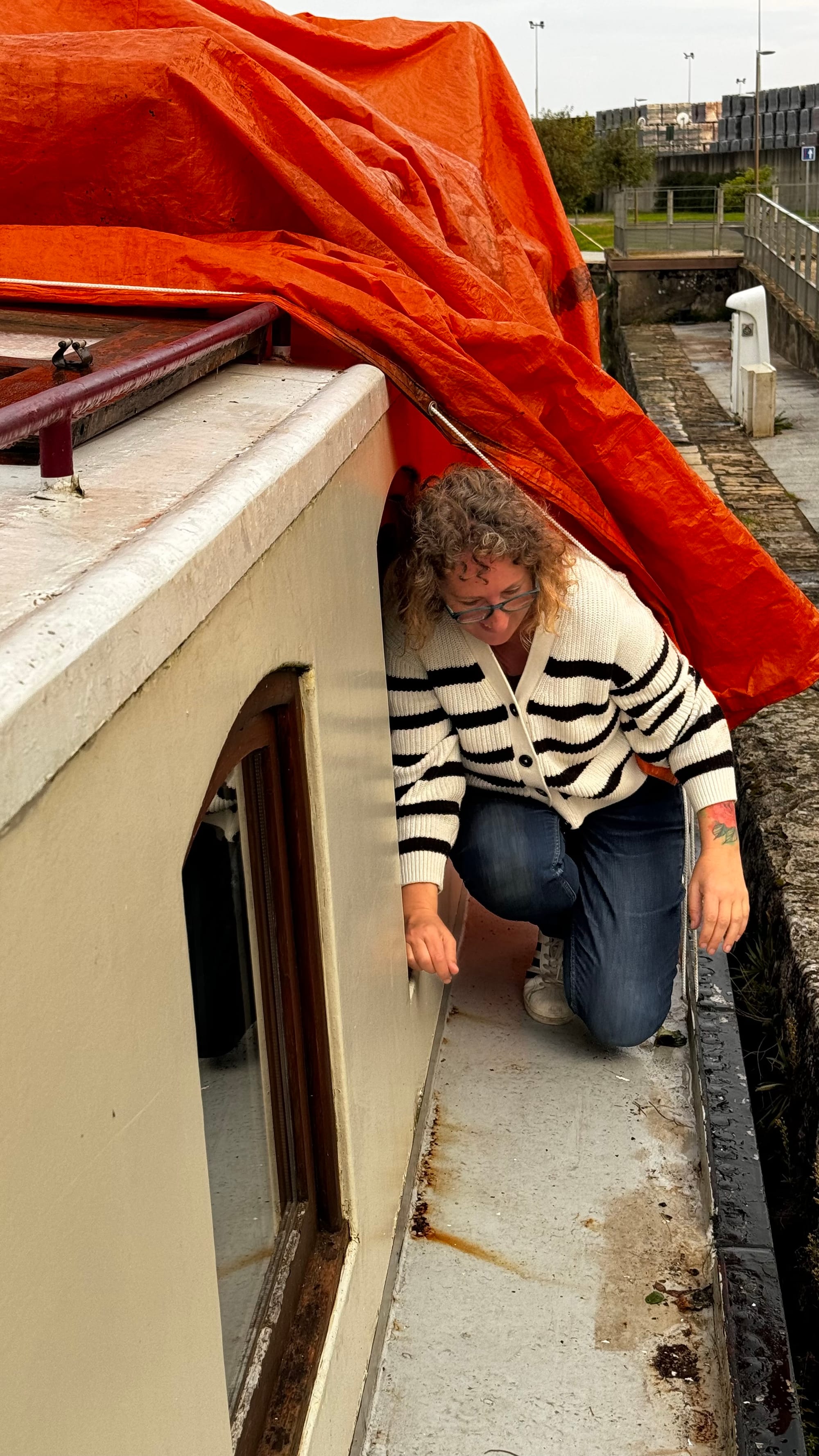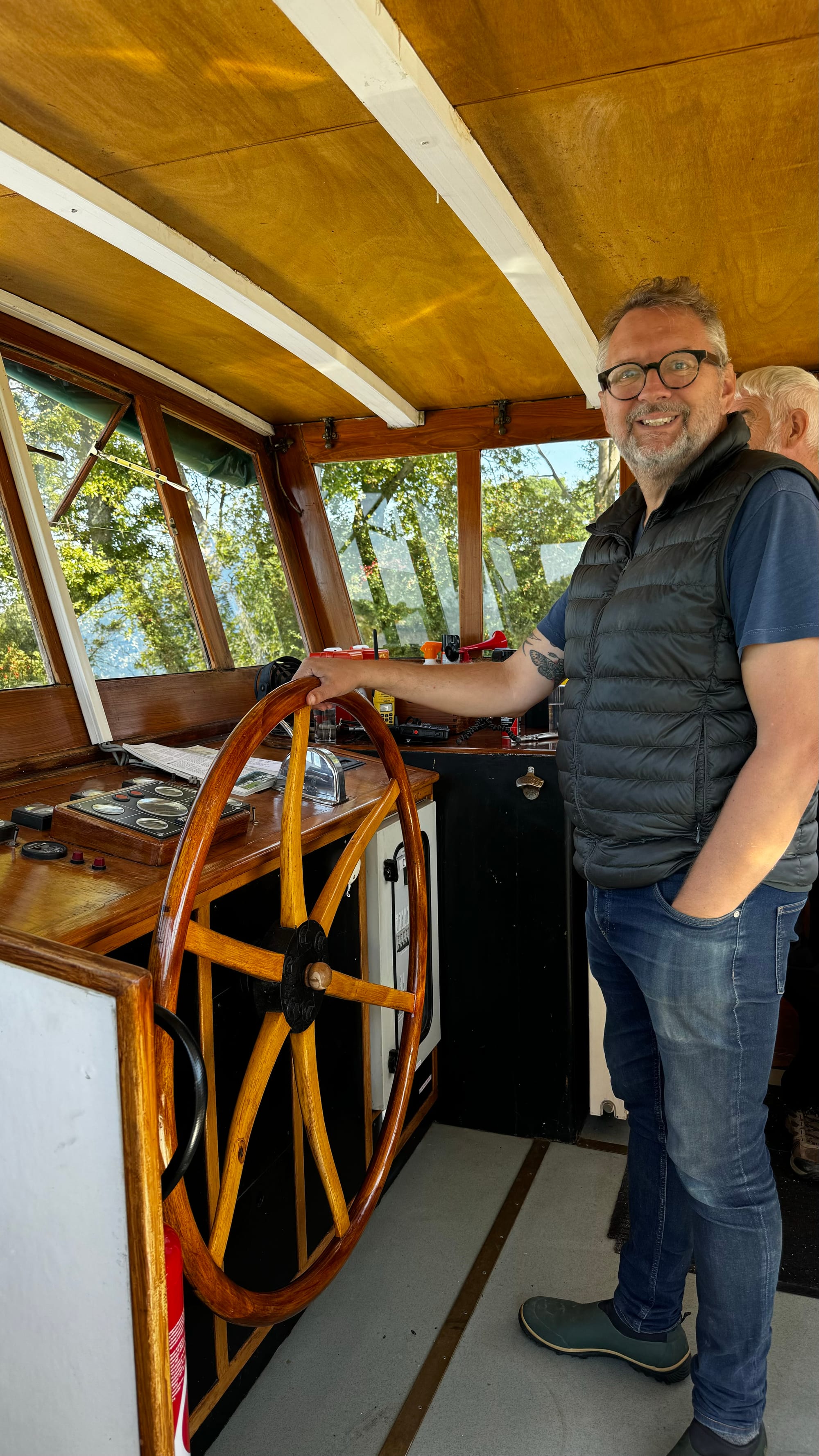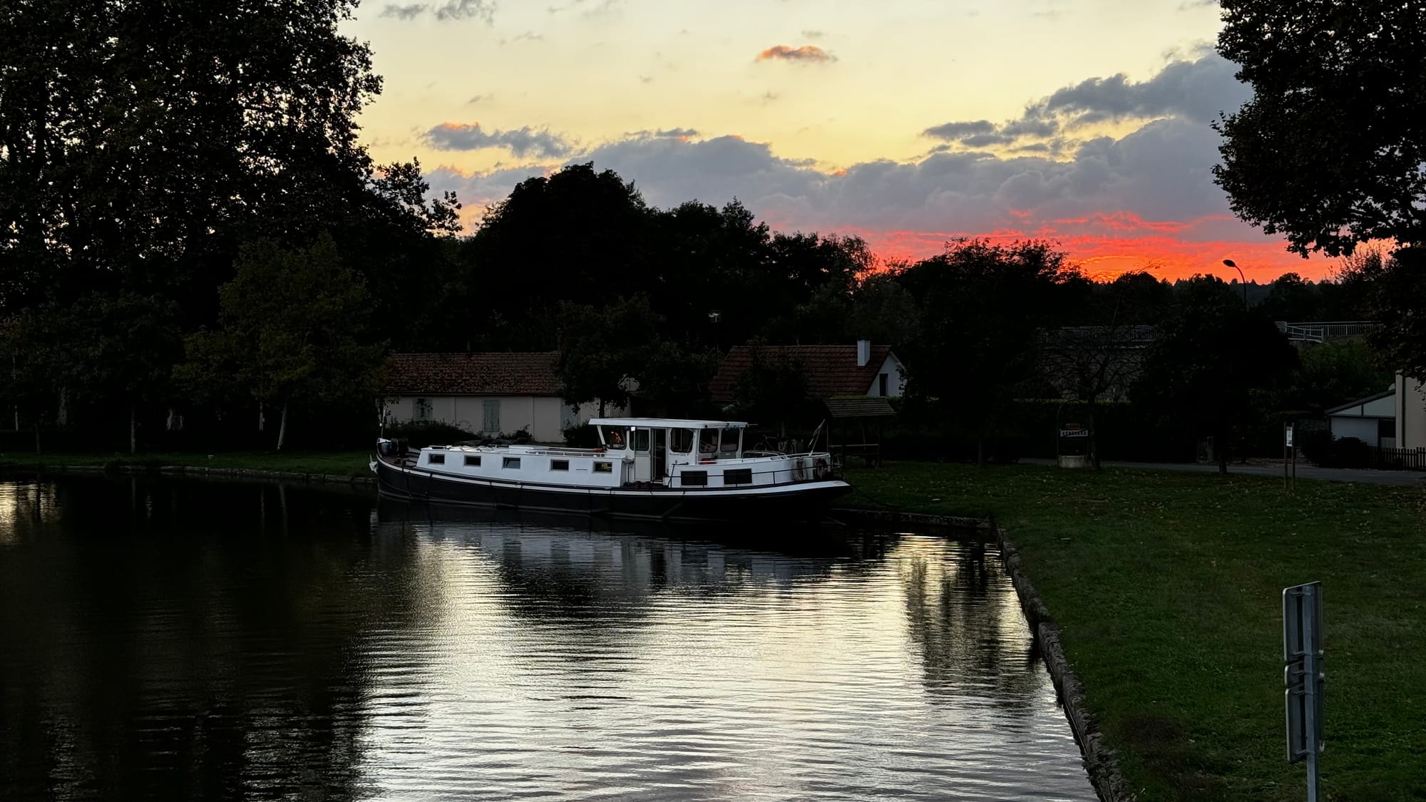 Paul took over steering to save us time as darkness was approaching. With the wheelhouse disassembled, our nav lights didn't work, and we needed to get onto the quay. A smaller plastic rental boat overtook us on a slow corner and immediately stopped and moored, causing extra stress and an emergency break on our part. Clair de Lune is NOT an easy boat to stop. When she's going forward, she will happily continue in that direction for a very long time. If you're navigating in close quarters with a 100-ton steel boat on a narrow waterway, be patient! It's not us that's going to get squashed.