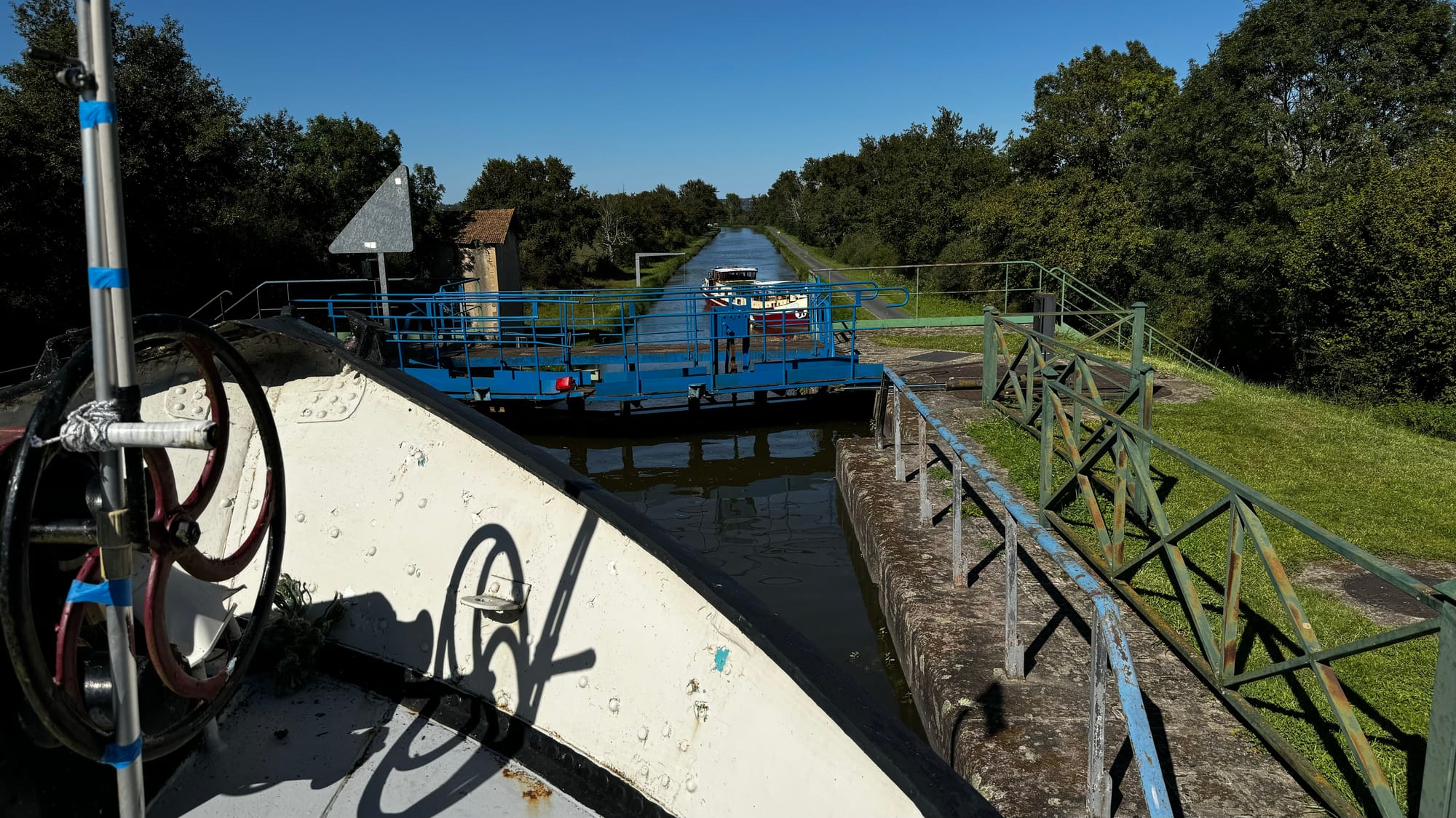 Thursday morning, I connected the dedicated engine starter batteries. Before the engine had been starting off the house batteries. Slowly, Clair de Lune continues to improve. This simple change seems to have stabilised our charging underway a little, too. Then we crossed the top of the hill! As we headed uphill, the water behind us ran toward the Atlantic Ocean. Once we crossed the hill, the water started running toward the Mediterranean. As friends pointed out, that's the wrong direction for Belgium! But we must make the Saône River to head upriver in the right direction.
