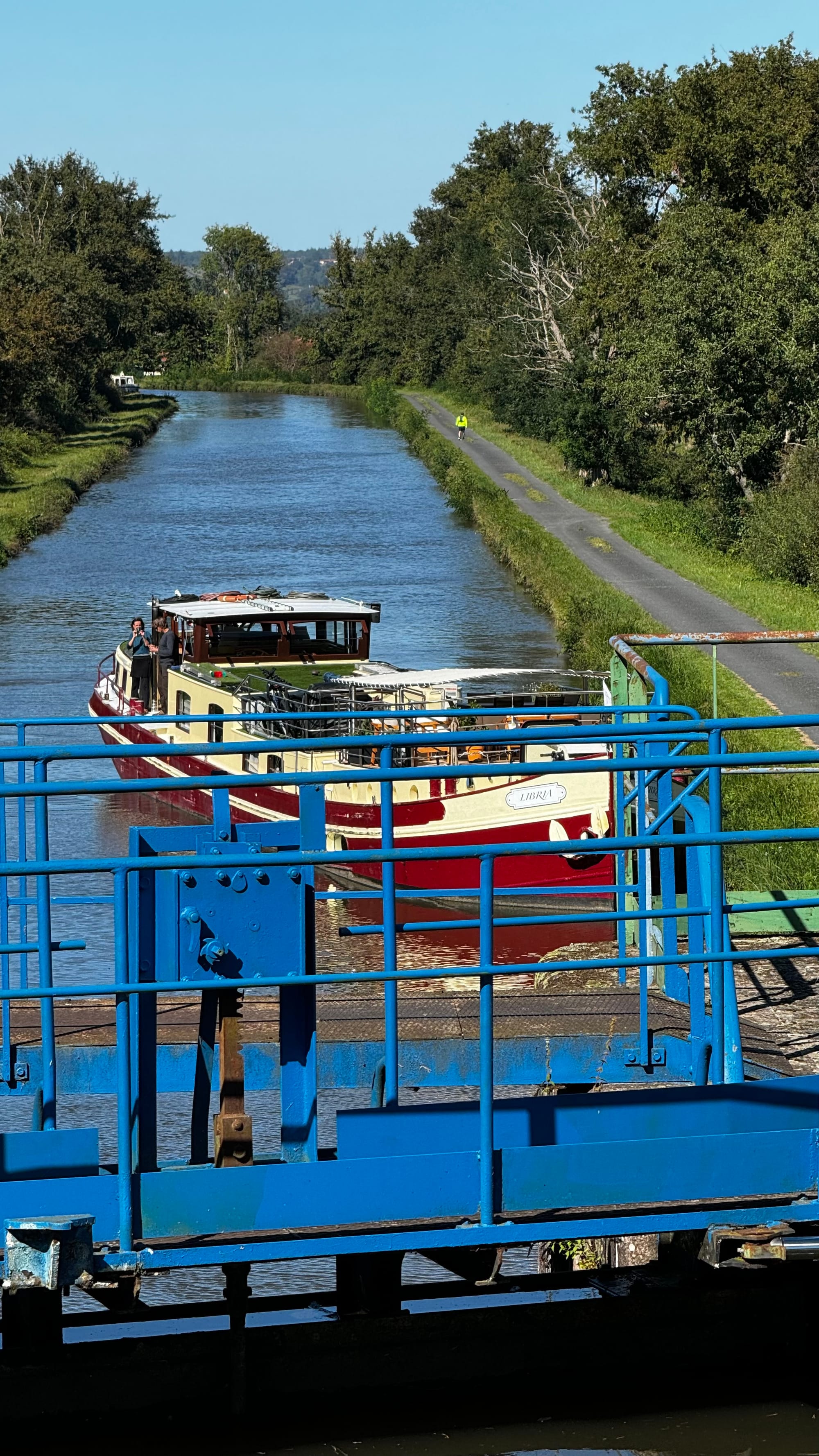 There are other differences in cruising on the canals, too. It's much more scenic. We are in a beautiful part of France, where several hotel barges are cruising. The shore is only ever five meters away. The towpath is now a cycle and hiking route, so endless people are walking by, filming us as we pull into a lock or cruise past sedately.