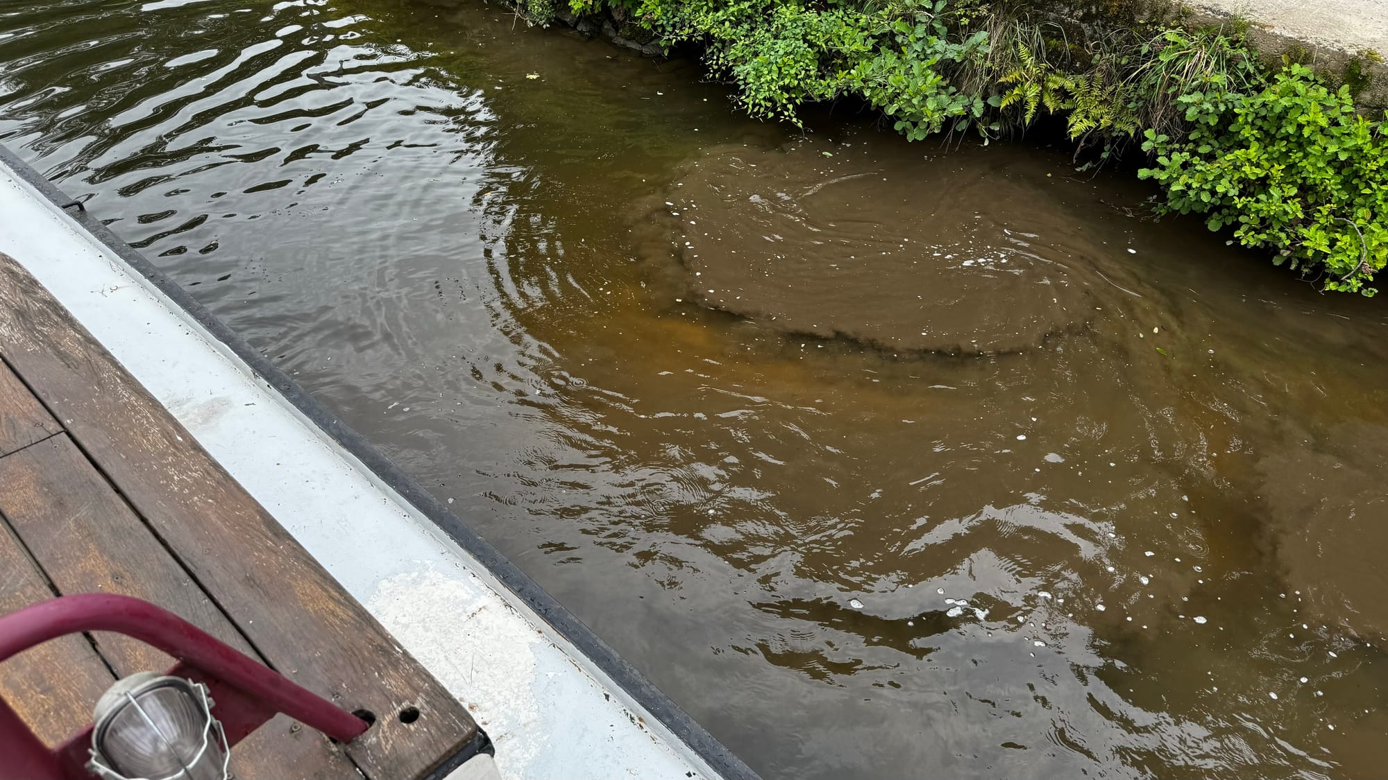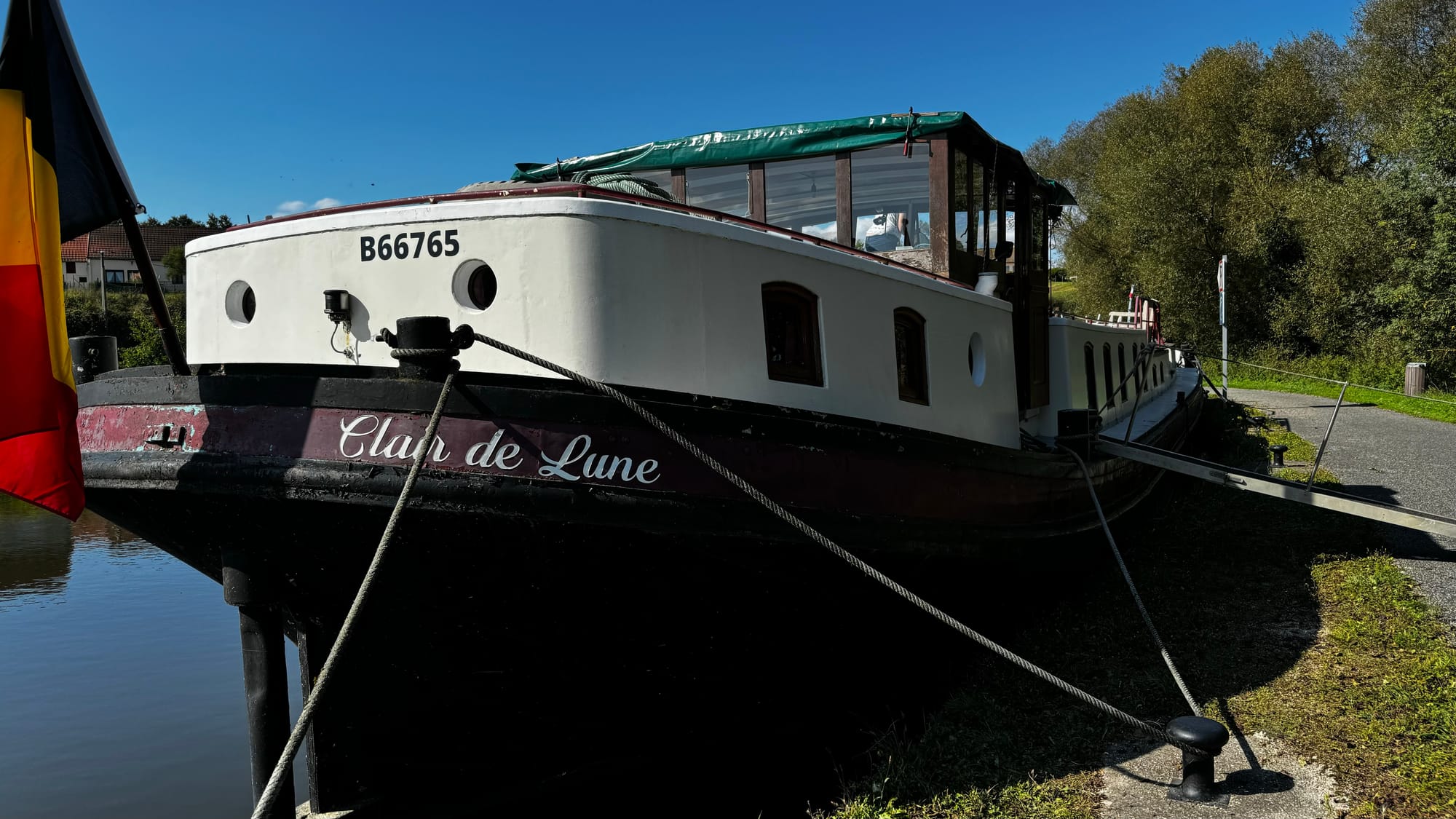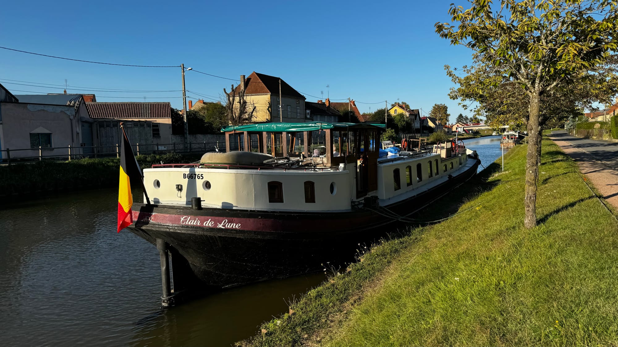 The narrow width means that touching the edge is unavoidable. But Clair de Lune is built to bounce off and continue. In some parts of the canal, bigger barges than us (a 38-meter commercial) might have no option when navigating a tight bend other than planting the bow into a bank and pressing against it to spin the stern.