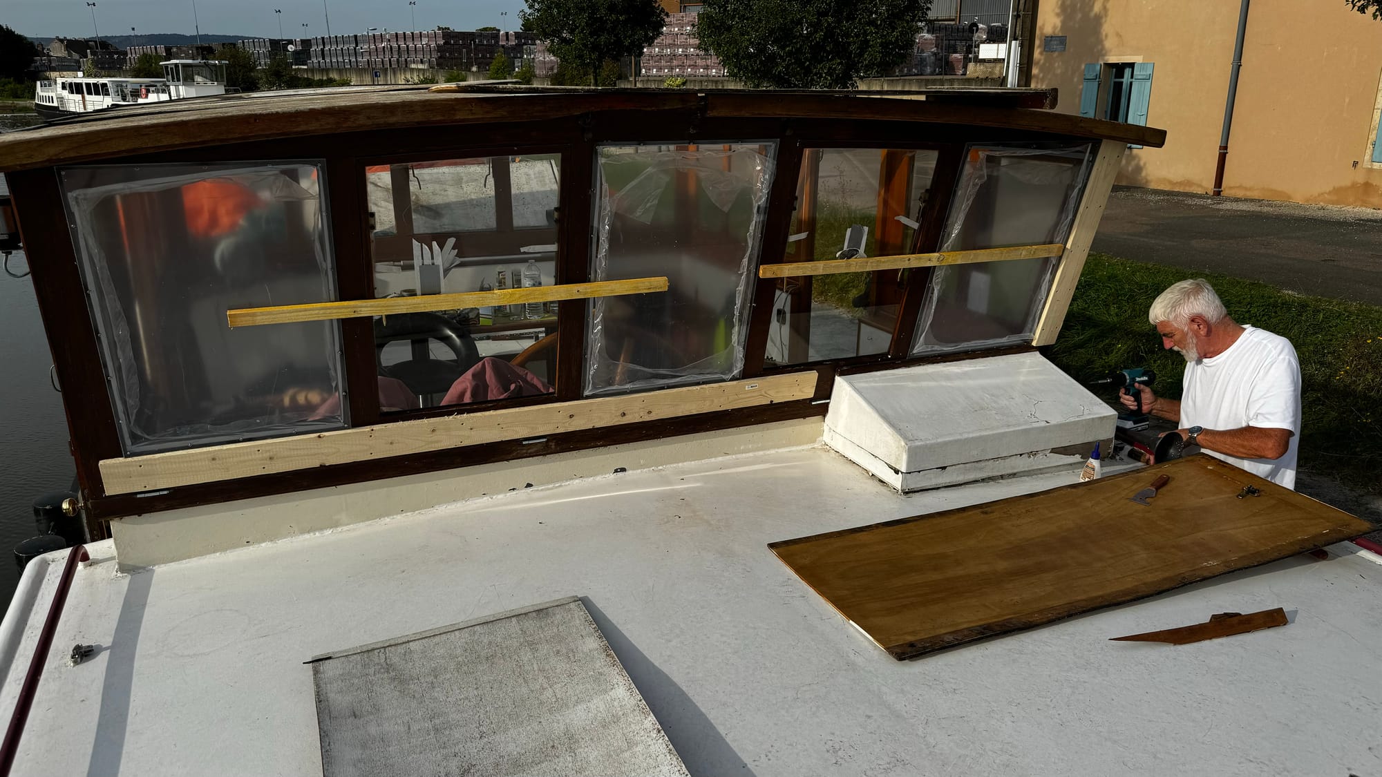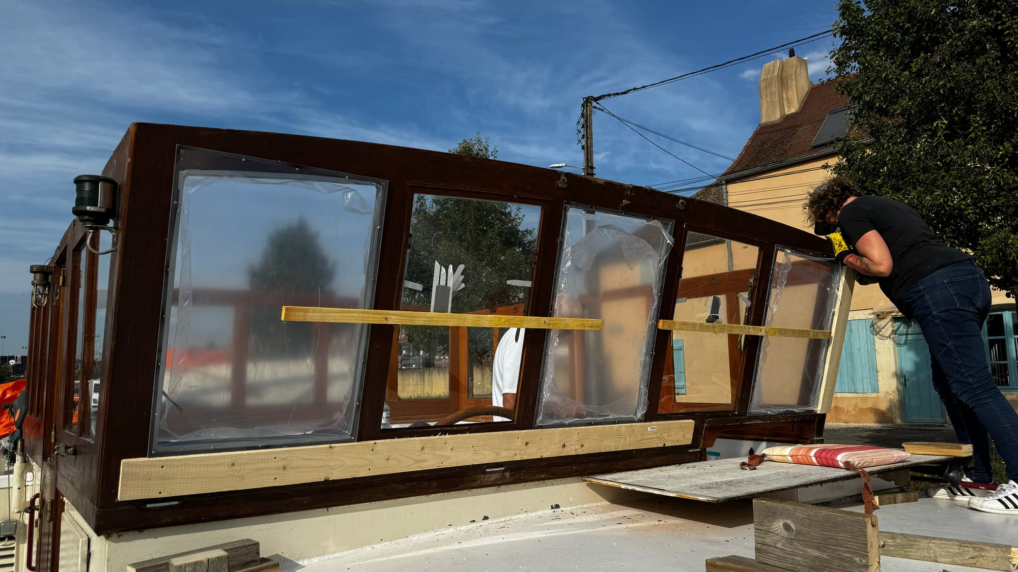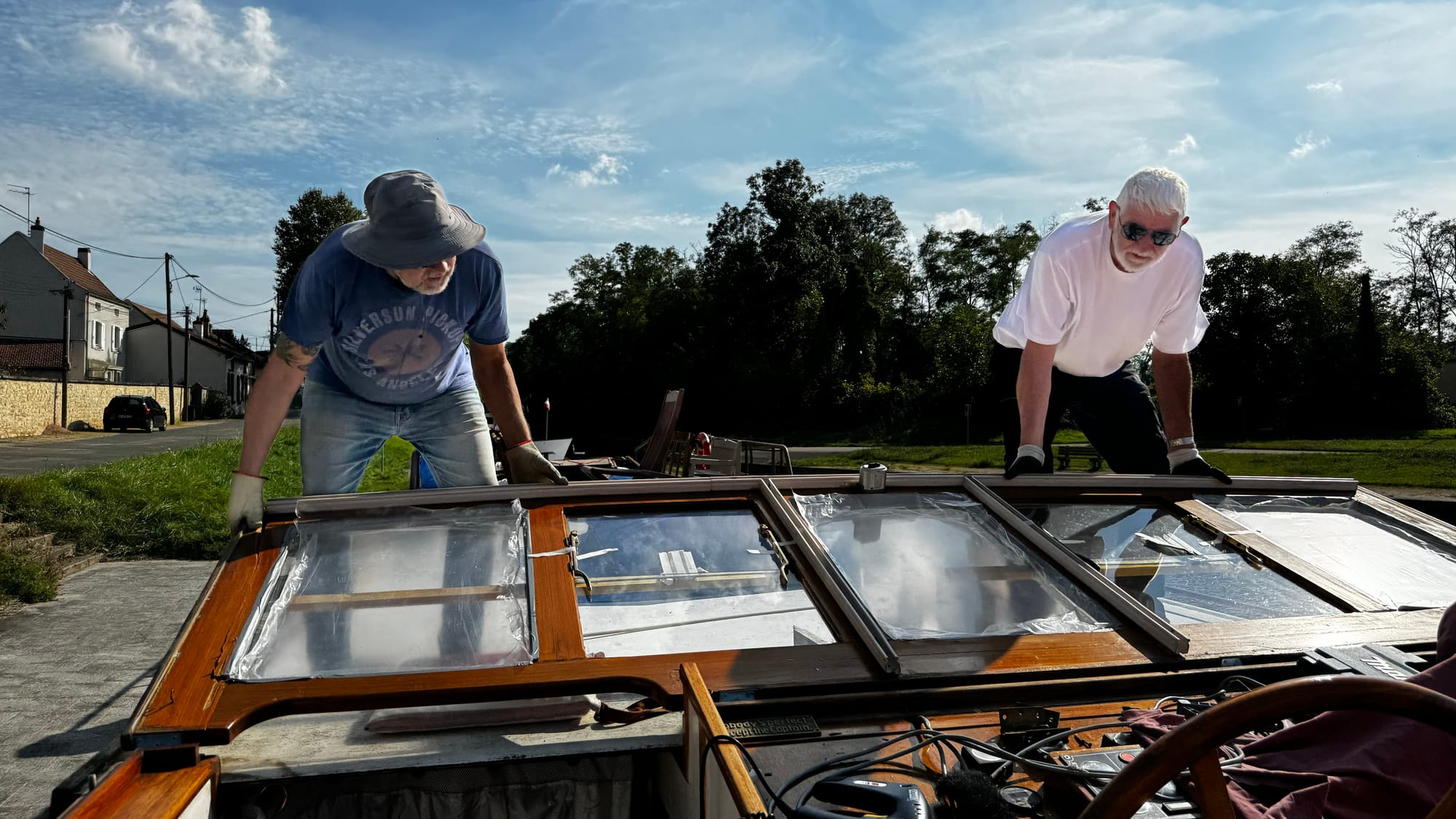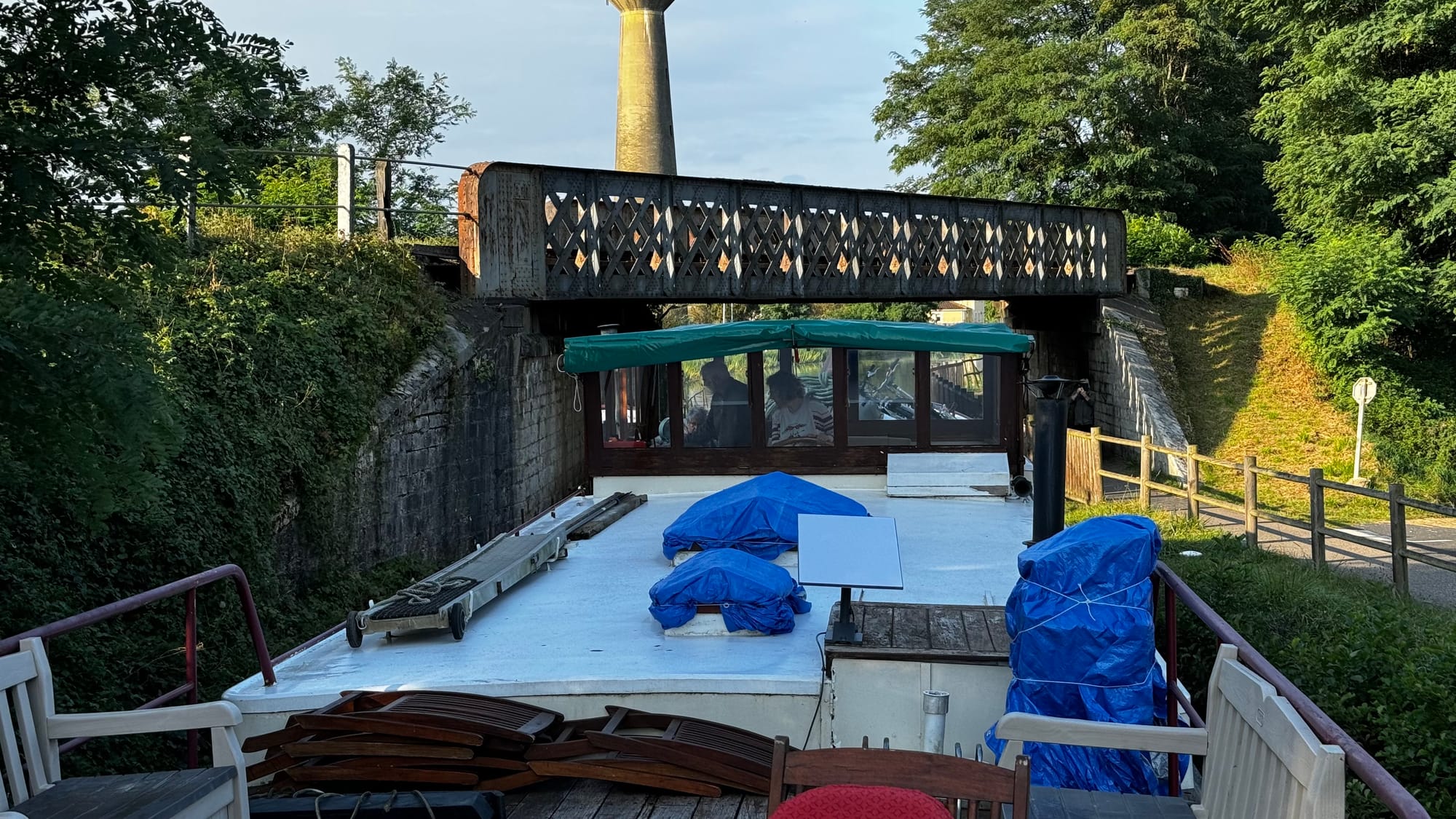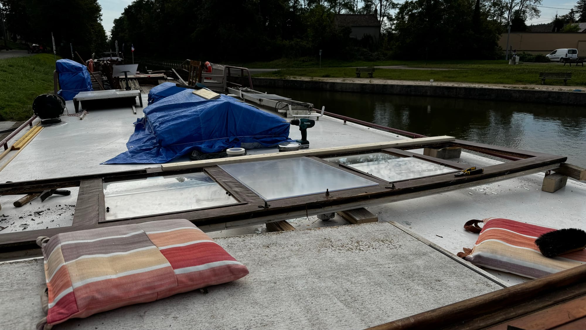 We continued forward to the next lock and then stopped to clean up. It was a disheartening experience. The wheelhouse roof had also lifted, sitting even higher now, and the tarp brushed against several bridges. There was a very low bridge at the next town, the lowest on the canal, and the safety flag at the front brushed it. We slammed into reverse, and I backed down the canal until we could tie off on the town quay. We decided the best course of action was to drop the wheelhouse.