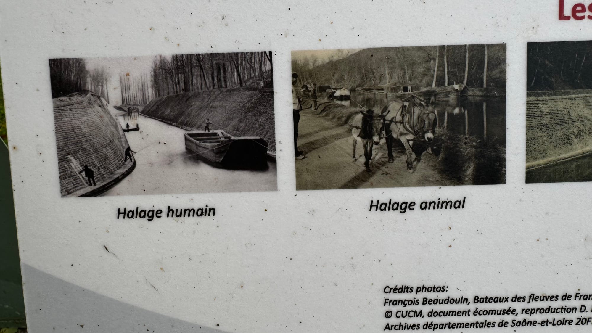 Génelard information sign showing people and horses pulling barges