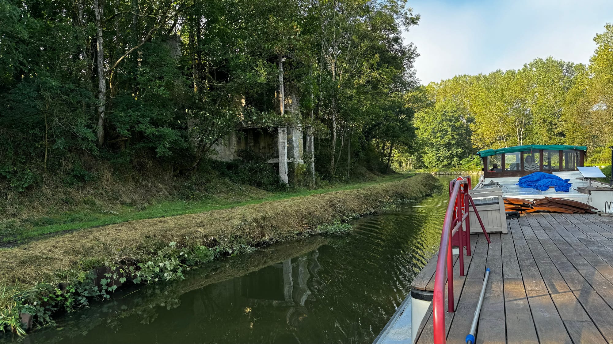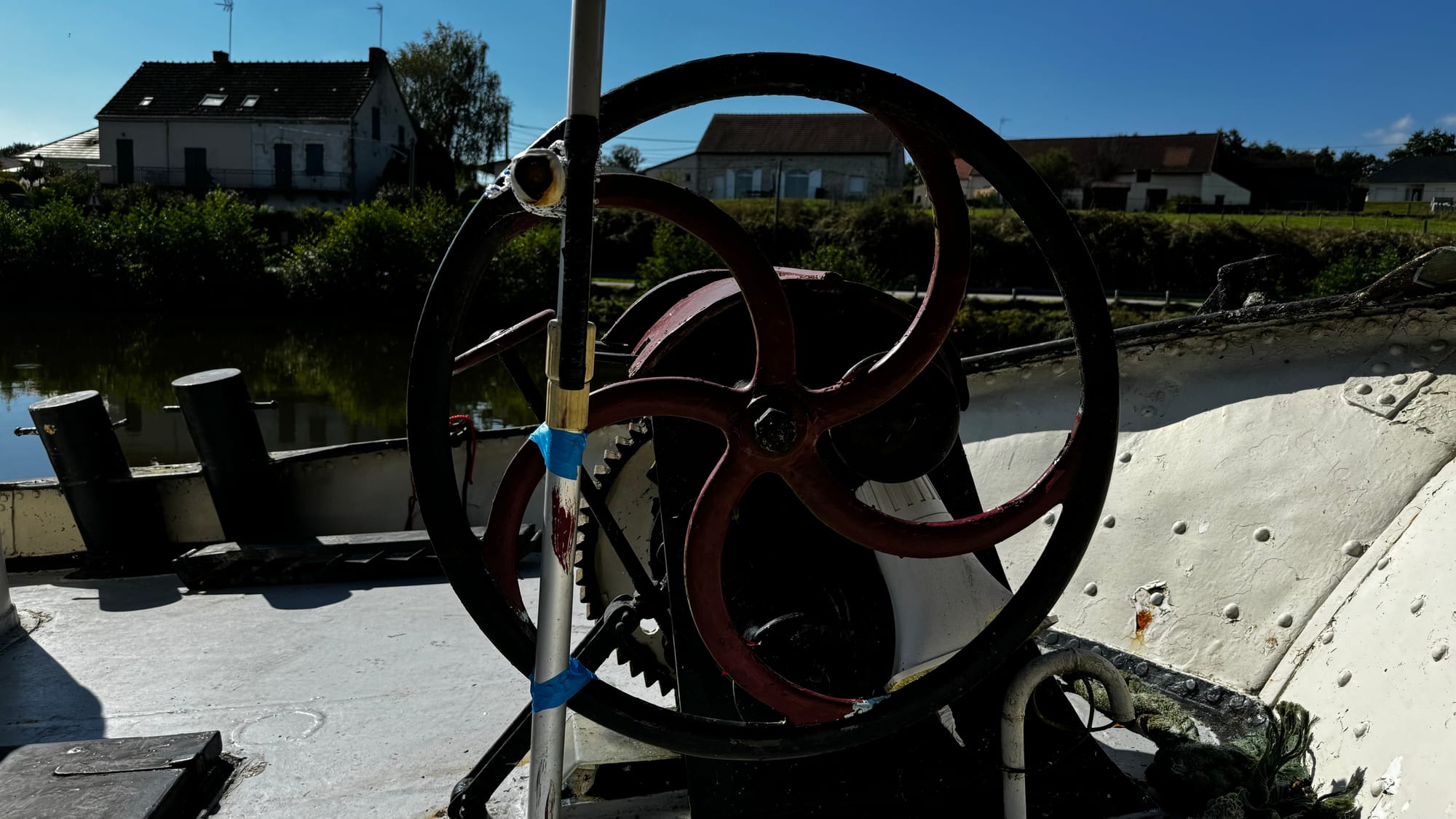 Setting off, the first and strangest difference was the very physical nature of navigating a narrow canal. Whereas Matilda has never (in our time) touched the ground or a shore, with Clair de Lune, it's a contact sport. Depth gauges don't exist – after all, the canal is 1.6 meters deep (or thereabouts), and we draw 1.1 (or thereabouts). With silt and debris on the bottom, that's a tiny gap. The depth gauge wouldn't tell us anything we don't already know – you're close to hitting the bottom.