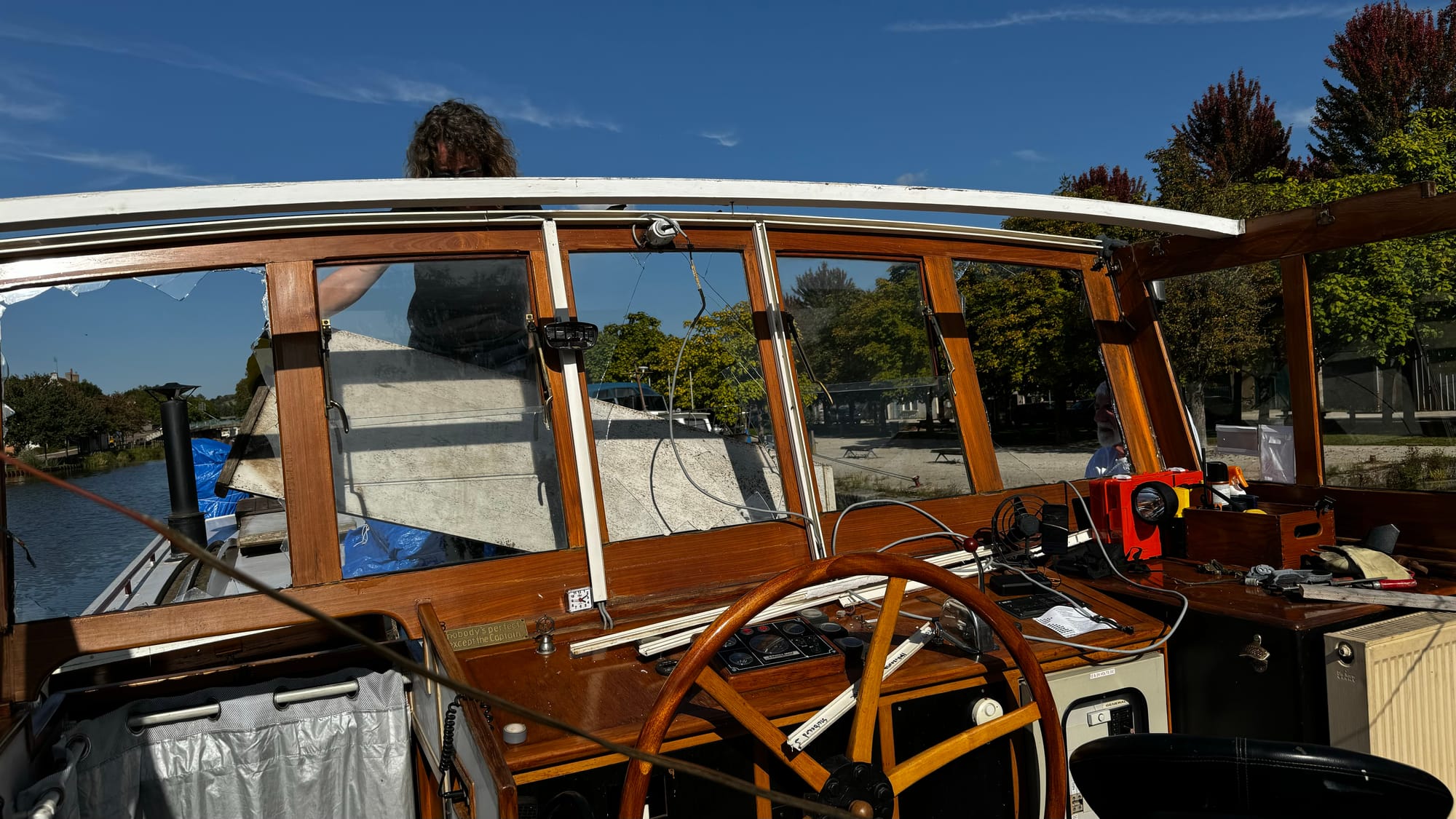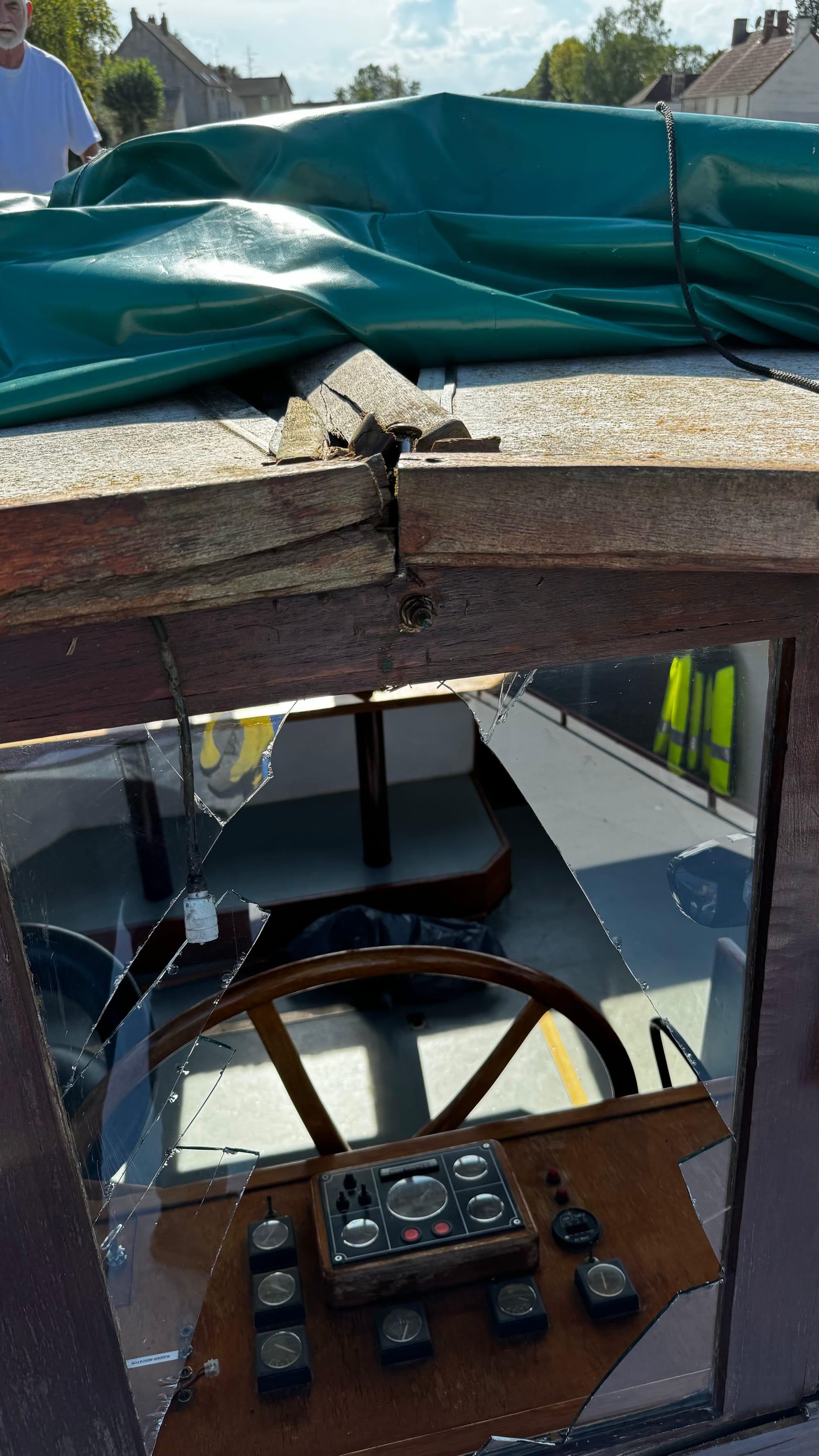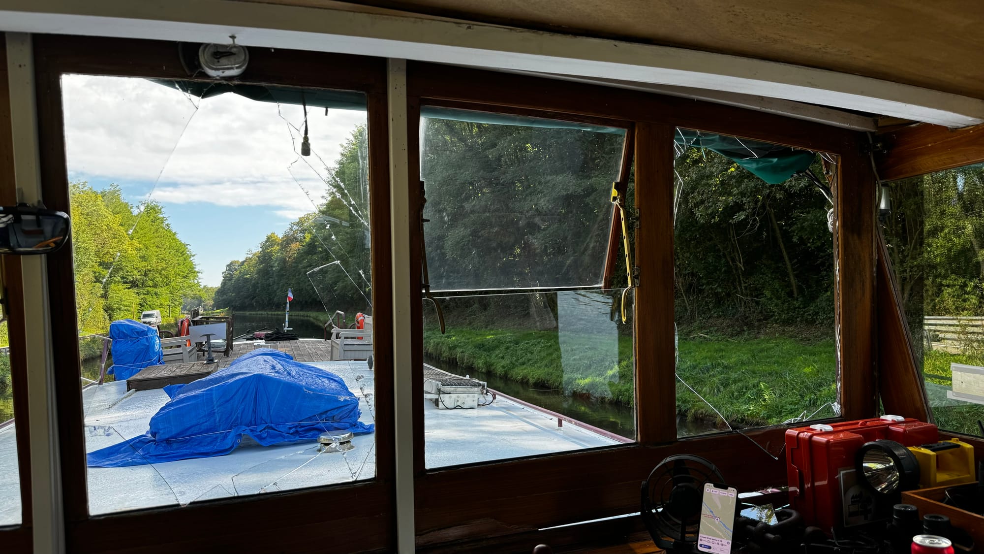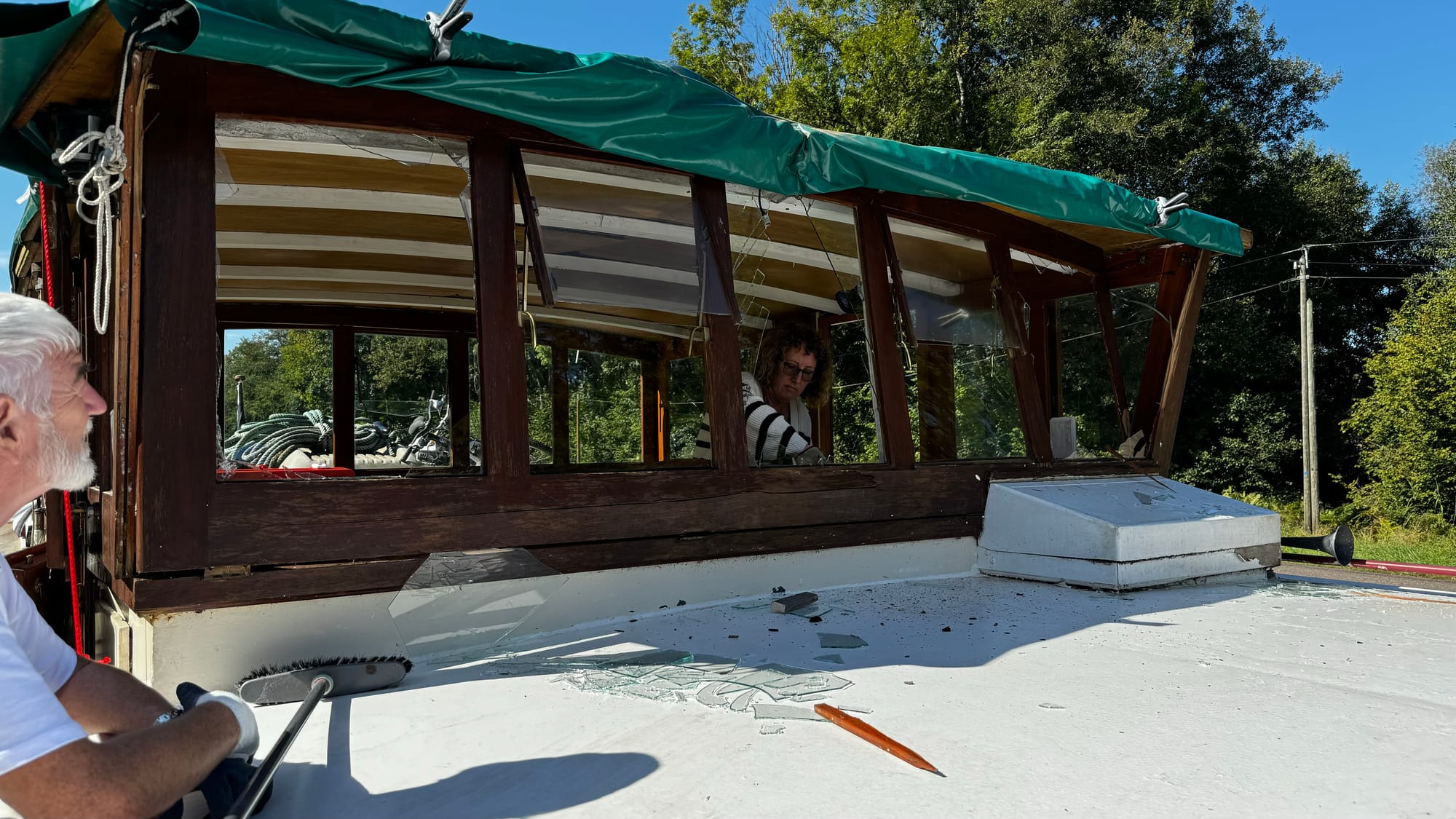 Often, the locks have road bridges at one end. This one was a little shorter than others, and when the lock wave hit us, the stern of the boat lifted, and the wheelhouse crashed into the bridge. I was on the helm, and there was a slow, inexorable sense of impending disaster. I hoped the wheelhouse would sneak under, but the lock wave lifted us. A shattering of glass followed a massive crunch. The F clamp we had holding the tarp on the roof had hit. As the windows shattered, I was showered with broken glass. I ducked and covered. As it stopped, I hit the throttle – this is counter-intuitive, but it drags the stern lower and apart from the first section at the front of the wheelhouse, everything escaped unscathed. The windows were not laminated, and giant, sharp shards of glass were everywhere.