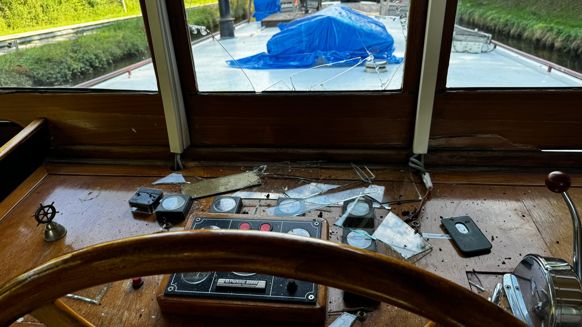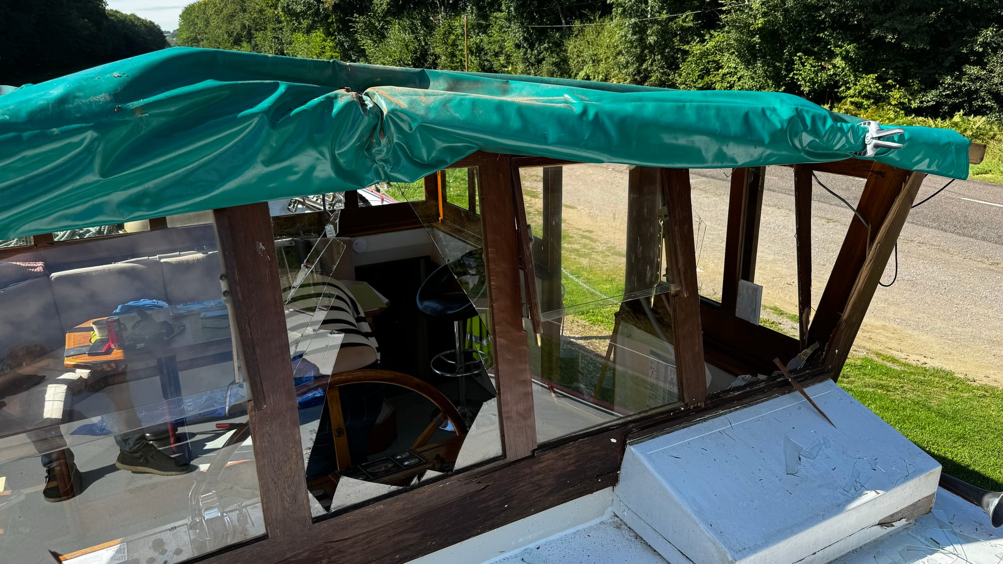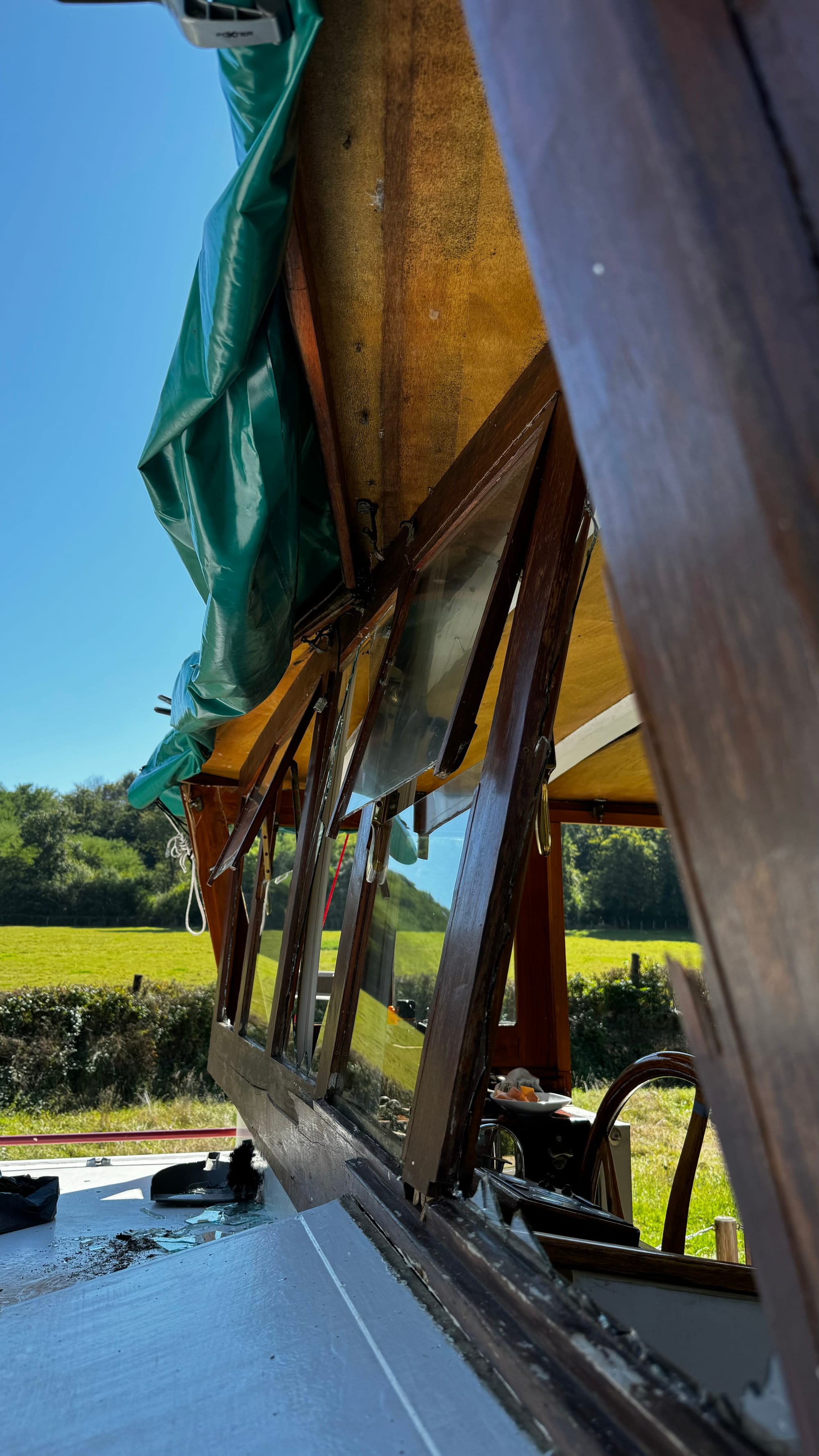 Often, the locks have road bridges at one end. This one was a little shorter than others, and when the lock wave hit us, the stern of the boat lifted, and the wheelhouse crashed into the bridge. I was on the helm, and there was a slow, inexorable sense of impending disaster. I hoped the wheelhouse would sneak under, but the lock wave lifted us. A shattering of glass followed a massive crunch. The F clamp we had holding the tarp on the roof had hit. As the windows shattered, I was showered with broken glass. I ducked and covered. As it stopped, I hit the throttle – this is counter-intuitive, but it drags the stern lower and apart from the first section at the front of the wheelhouse, everything escaped unscathed. The windows were not laminated, and giant, sharp shards of glass were everywhere.
