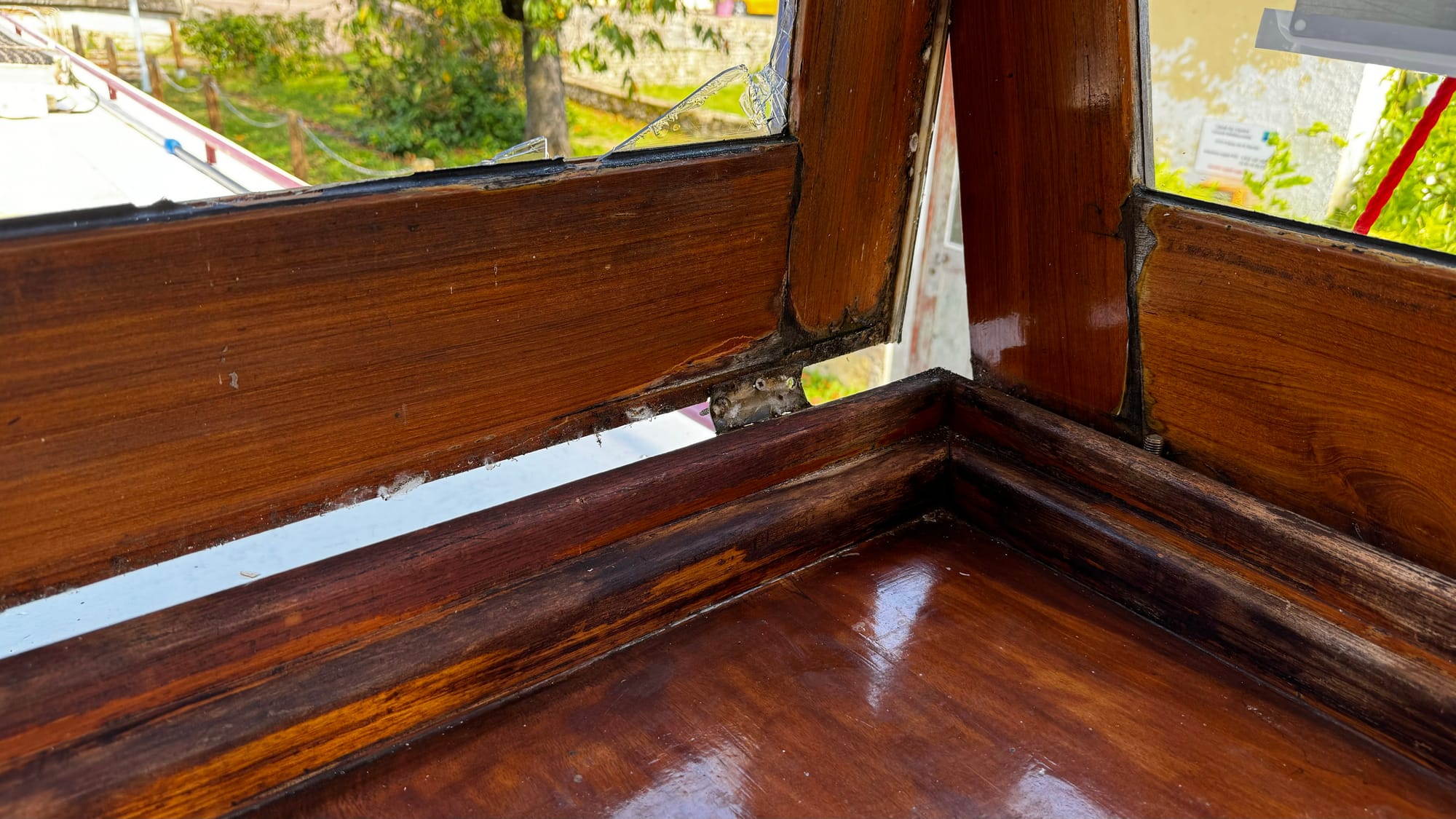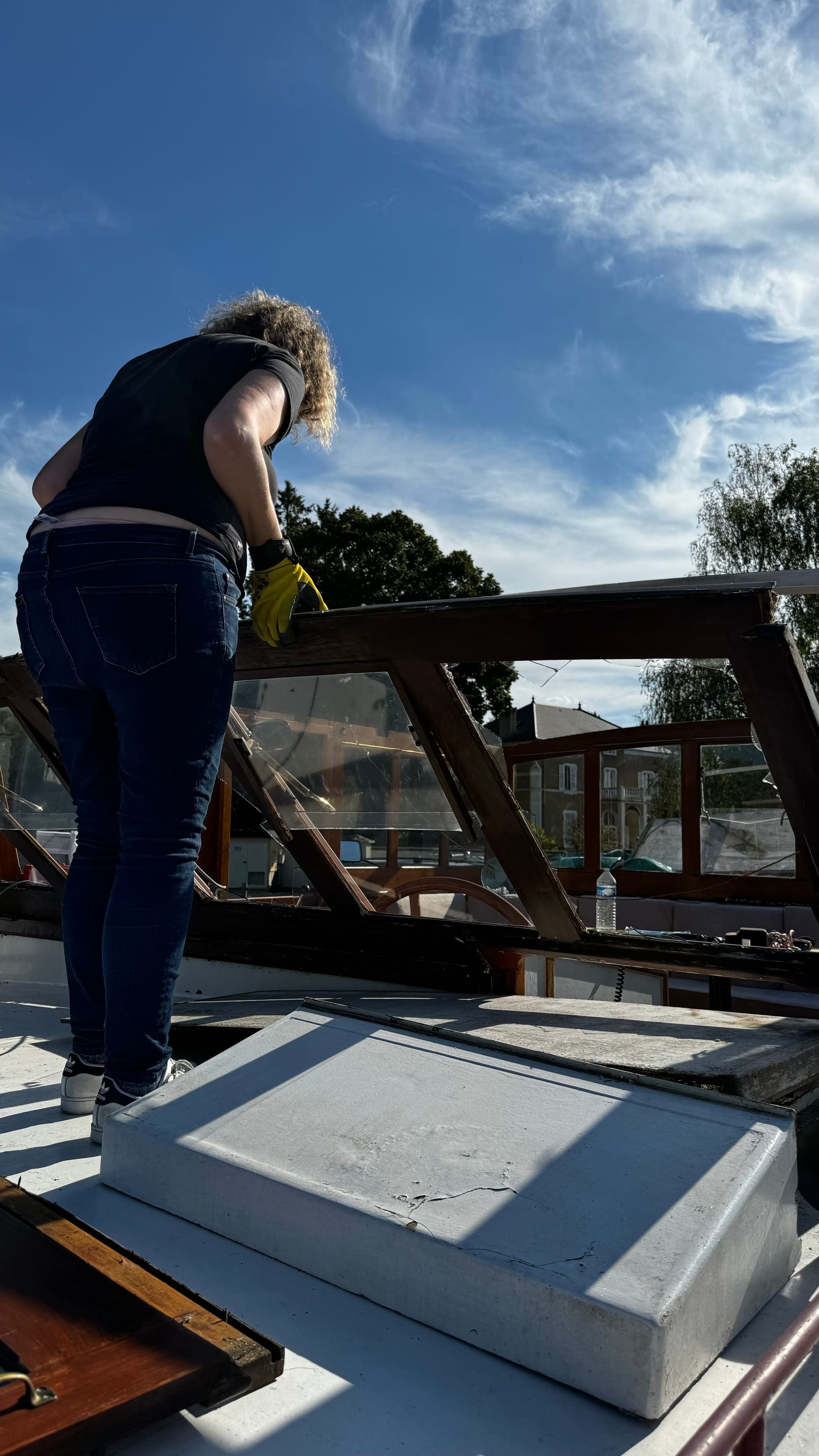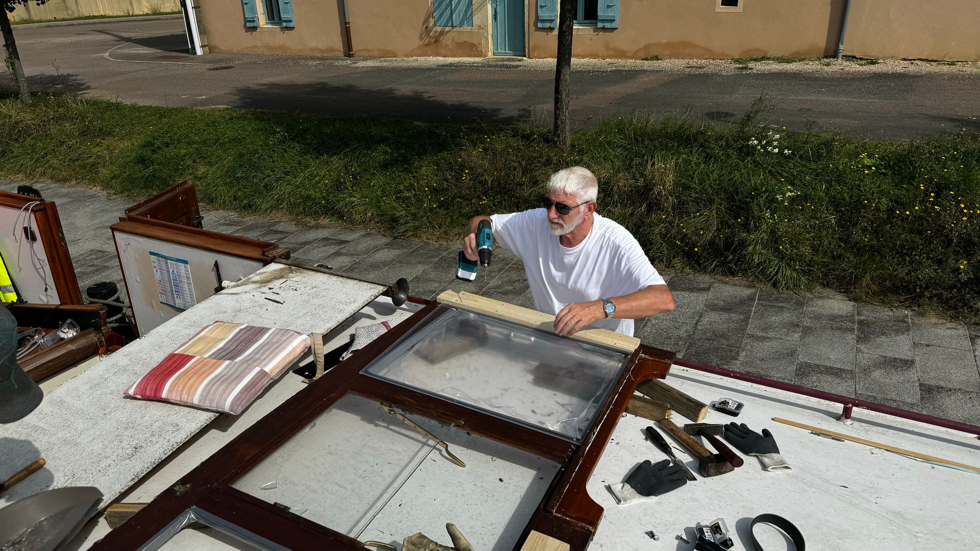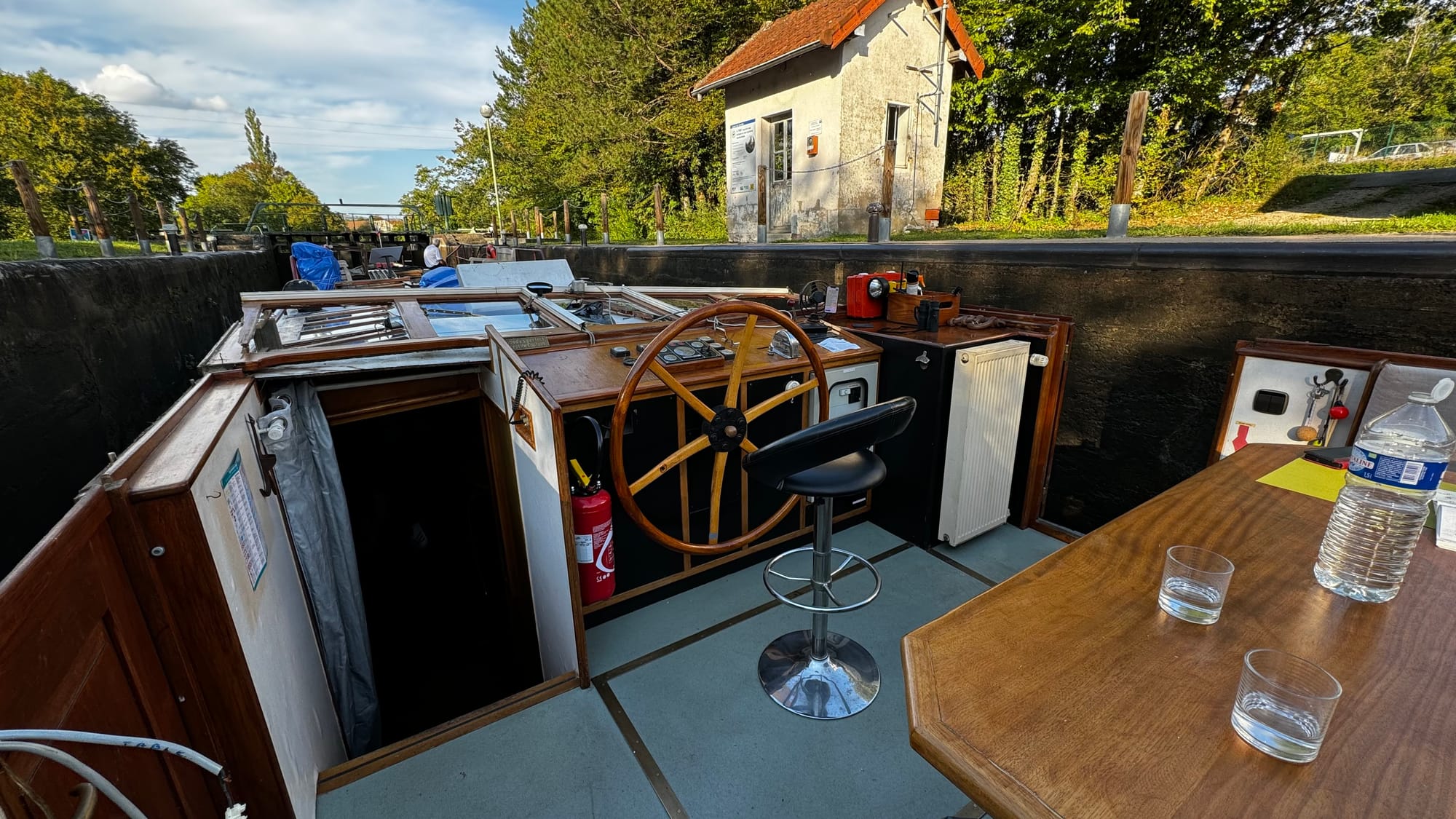 Often, the locks have road bridges at one end. This one was a little shorter than others, and when the lock wave hit us, the stern of the boat lifted, and the wheelhouse crashed into the bridge. I was on the helm, and there was a slow, inexorable sense of impending disaster. I hoped the wheelhouse would sneak under, but the lock wave lifted us. A shattering of glass followed a massive crunch. The F clamp we had holding the tarp on the roof had hit. As the windows shattered, I was showered with broken glass. I ducked and covered. As it stopped, I hit the throttle – this is counter-intuitive, but it drags the stern lower and apart from the first section at the front of the wheelhouse, everything escaped unscathed. The windows were not laminated, and giant, sharp shards of glass were everywhere.