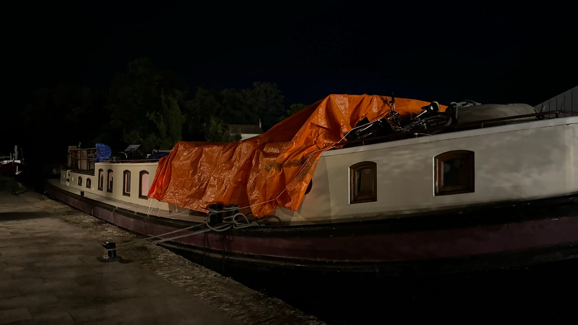 On the quay, we finally had time to eat dinner, which finished around 10 pm, and then Karina and I secured the wheelhouse with a tarp. We finally made it into bed and collapsed to sleep.