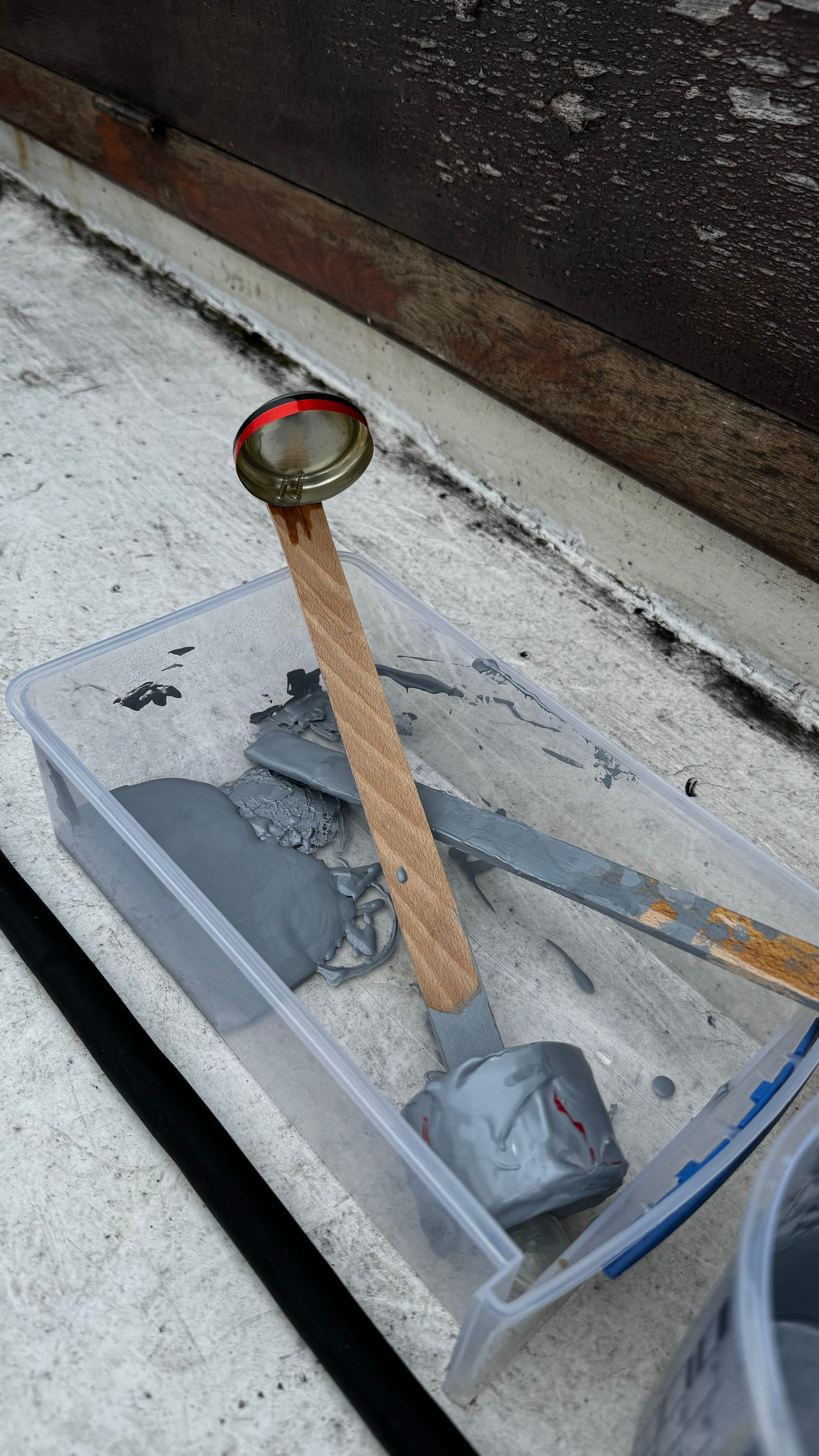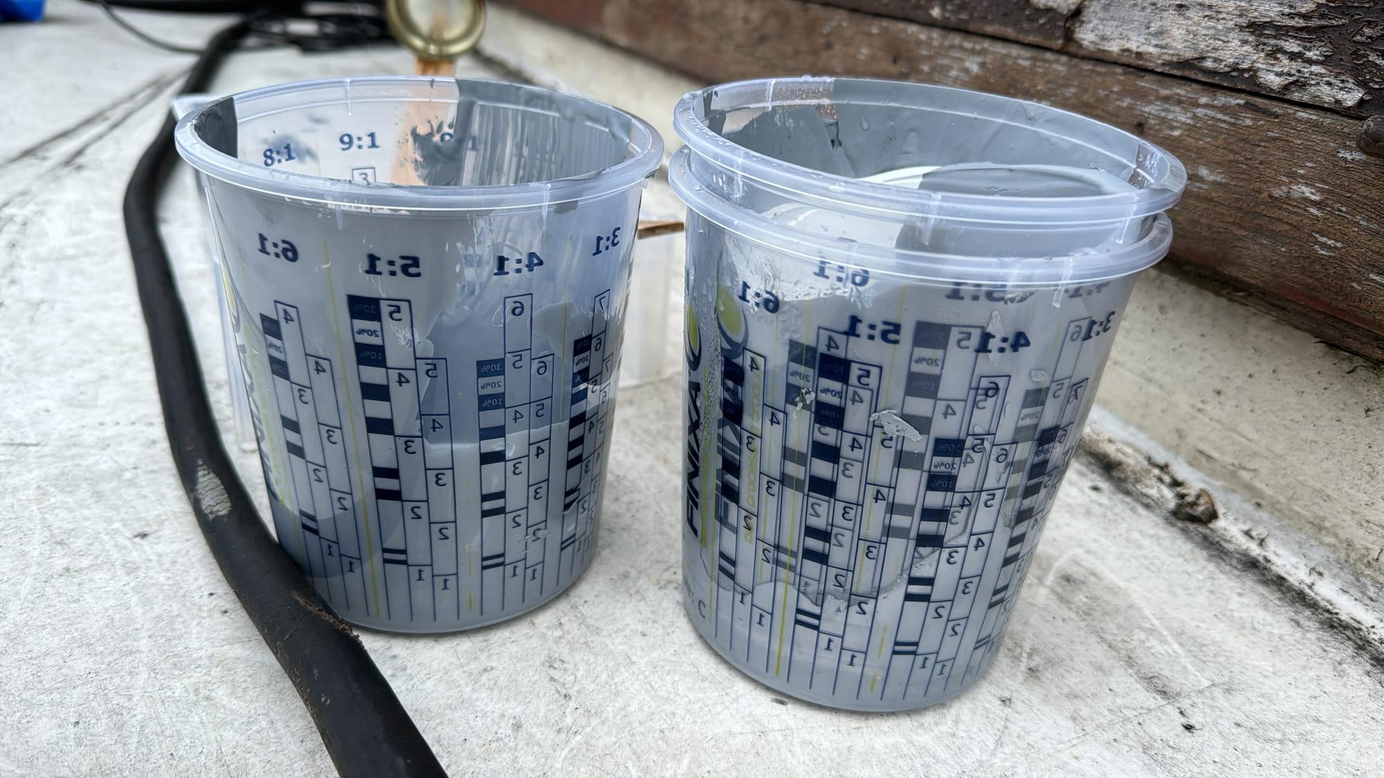 The commerical primer has been an interesting experience. It's a two-part paint, the paint itself, an epoxy hardener and then a dash of thinners. It feels like a mad science experiment mixing it all. Of course our challenge is that we're using very small quantities (a single window frame at the moment), so the measuring tools make too much. I created a set of measuring cups from old aluminium cans that does the job well enough.