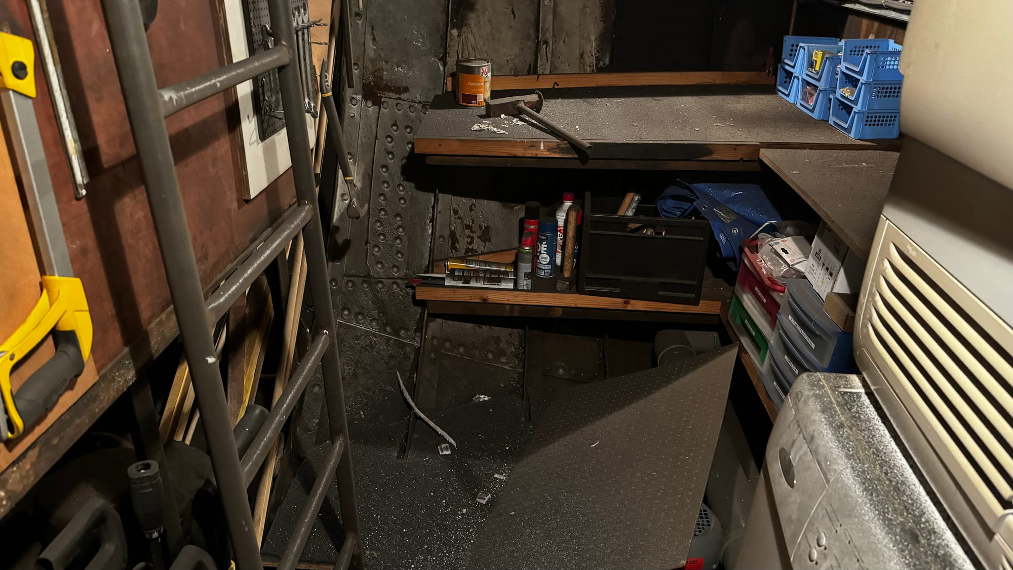 Friday was a chilly ride to the shipyard, with the temperature hovering around freezing. Ice was on the ground in the yard, and we felt winter starting to close in. Our goal was to clean. Now that the sandblasting is completed, we need to eliminate all the sand accumulated everywhere! The interior was filthy. Any tiny crack, including gaps around windows, rust holes, air vents, etc... the sand infiltrates everything. It took several hours, but Clair de Lune now looks respectable again. It's a losing battle in some ways. After all, we're demolishing parts of the interior as fast as we can clean it, digging holes in walls, and removing parts of the bathrooms, but it makes us happy to keep the site safe and tidy.