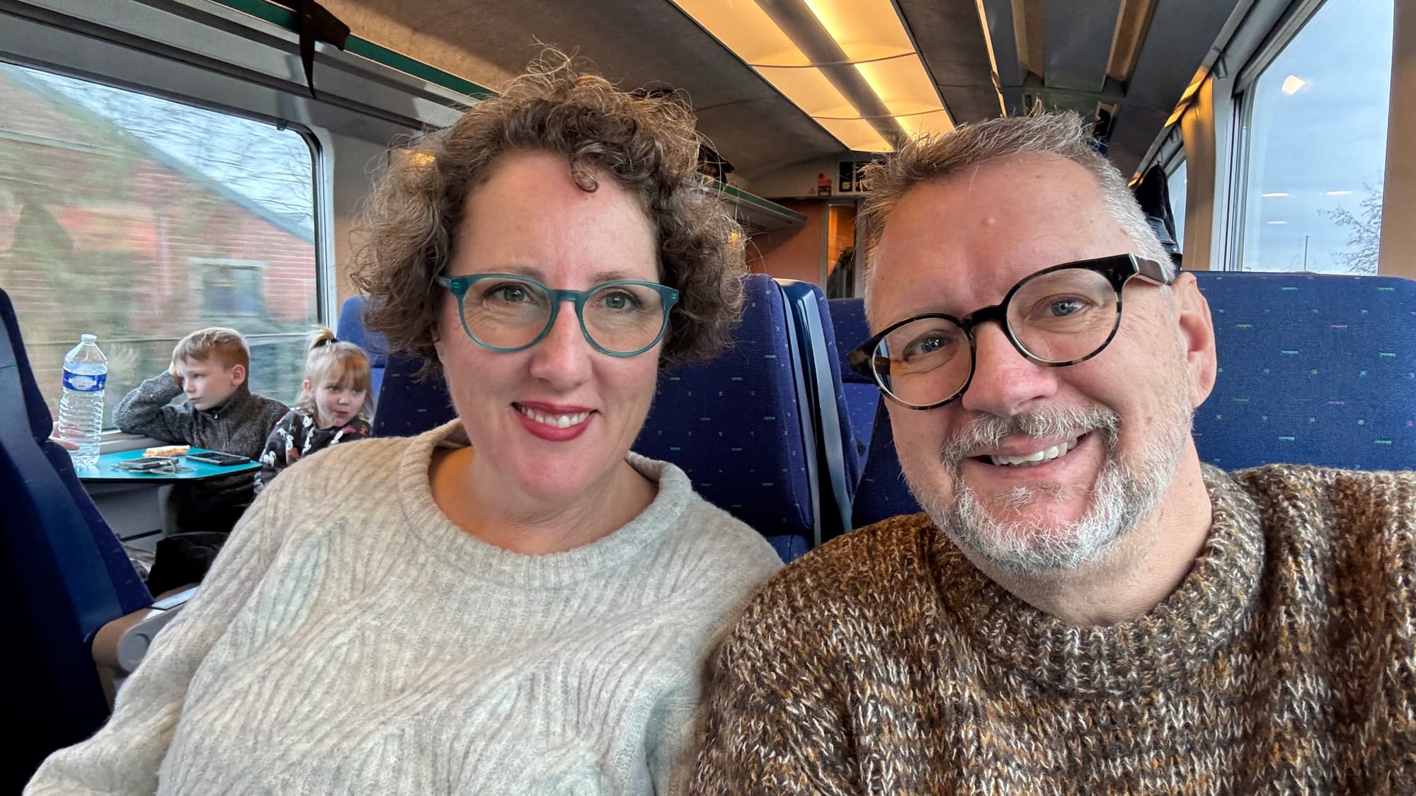 Scenes around Antwerp. Us on the train, looking clean for a change!