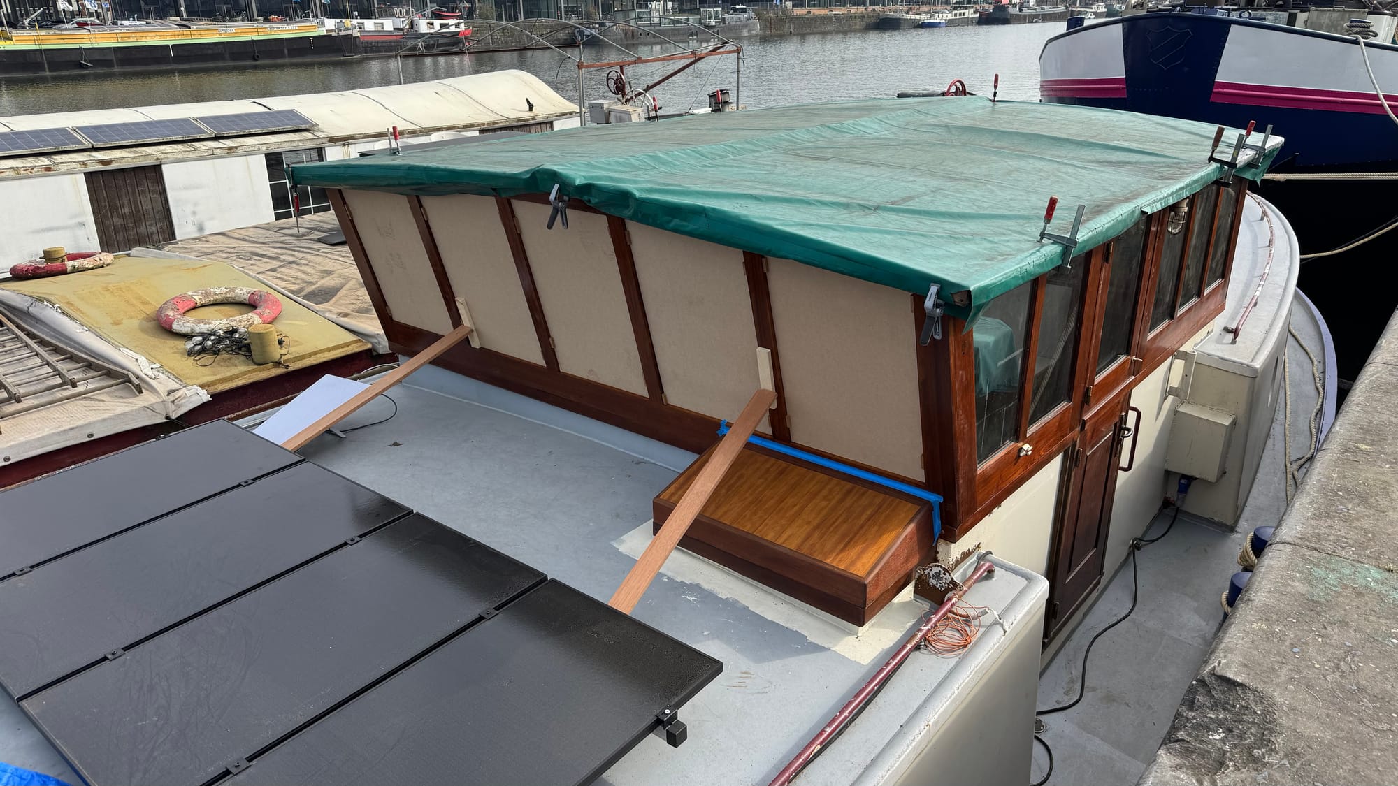 On Delfine, things are moving quickly. When we return to Belgium, Simon expects to have completed the roof panels, and I'll paint them ready to be fitted for real. We focussed on some small jobs on Monday, putting some more hardware back in place and tidying things in case work was to be done while we were off in Greece. We finished up around 3pm and left Delfine to her own devices while we headed home.