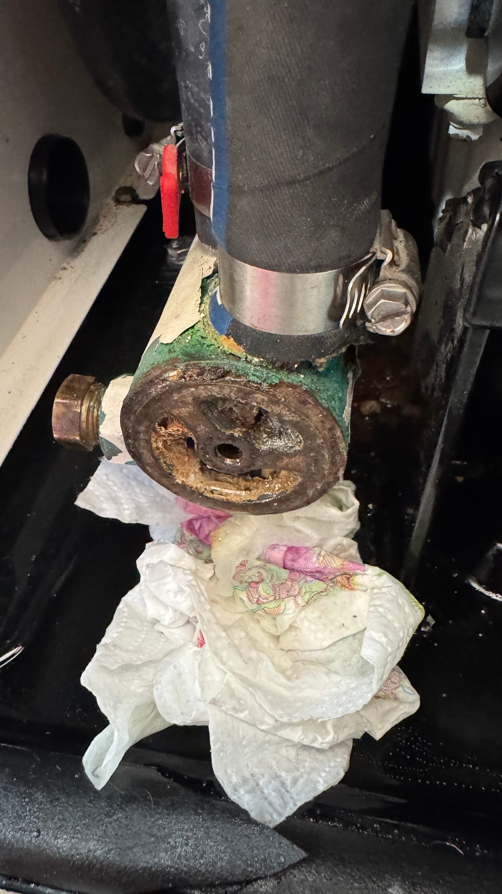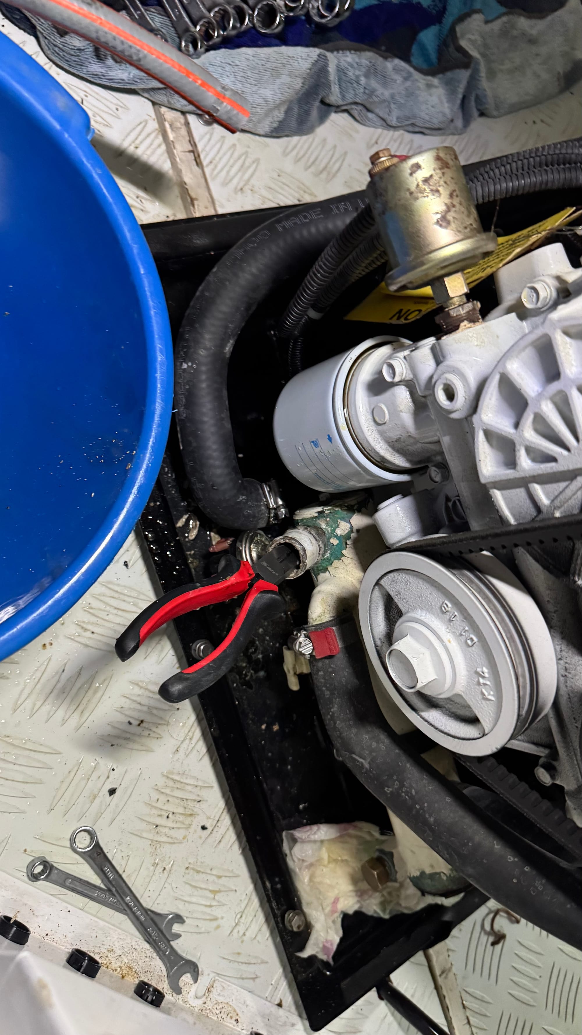 It was trivial to clean them out and flush the system again. Plug it back together, and there you go! Working generator again. Of course, there's always something else. The cover on the heat exchanger has a small crack, and the gasket is shot. I tried to jerry-rig a new one with some cork, which works "kind of" and will let us run and test the generator for the sea trial, but it needs to be replaced (which should be a €50 part... a trivial exercise, but I can't get one on the weekend). At the moment, there's a small drip when it's running. Nothing tragic, but not right either.