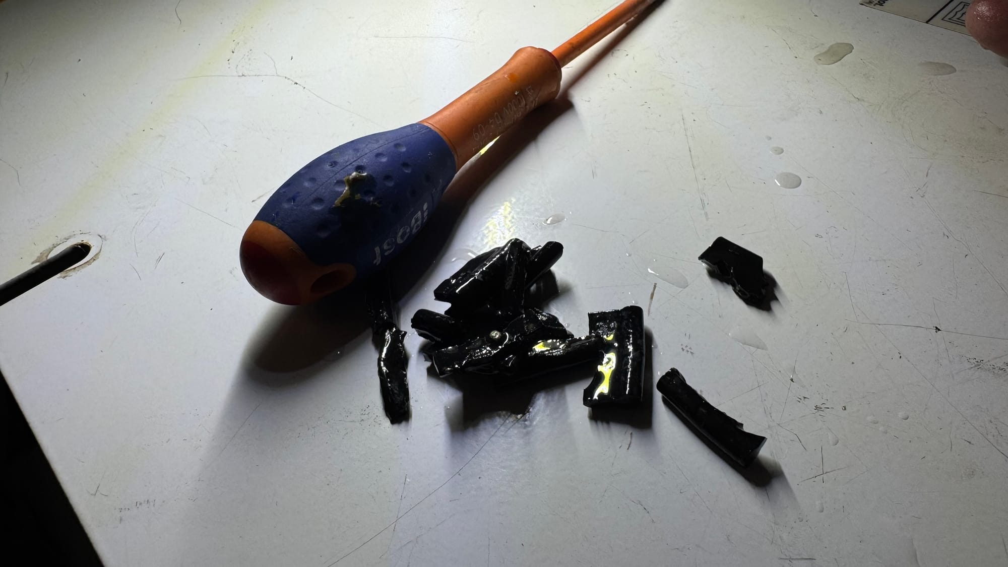 I disconnected the end of the hose from the heat exchanger, and lo and behold, there was the issue. It was FULL of old impeller parts. This is very frustrating. For those unfamiliar with an impeller, it's part of the seawater pump. It's a little rubber "cog" or "starfish" with arms. It sits inside a housing, and the rotation of the impeller pushes the water through the system. Over time, they wear out. No biggie. It happens all the time; you replace them each year, and they are fine. Sometimes, when you go to replace them, the bits of the arms have broken off. A decent mechanic will go, "Oh, if the arm broke off, it went somewhere", but instead, a lot of them seem to just replace the old impeller with a new one and test it, then decide, "She'll be right."