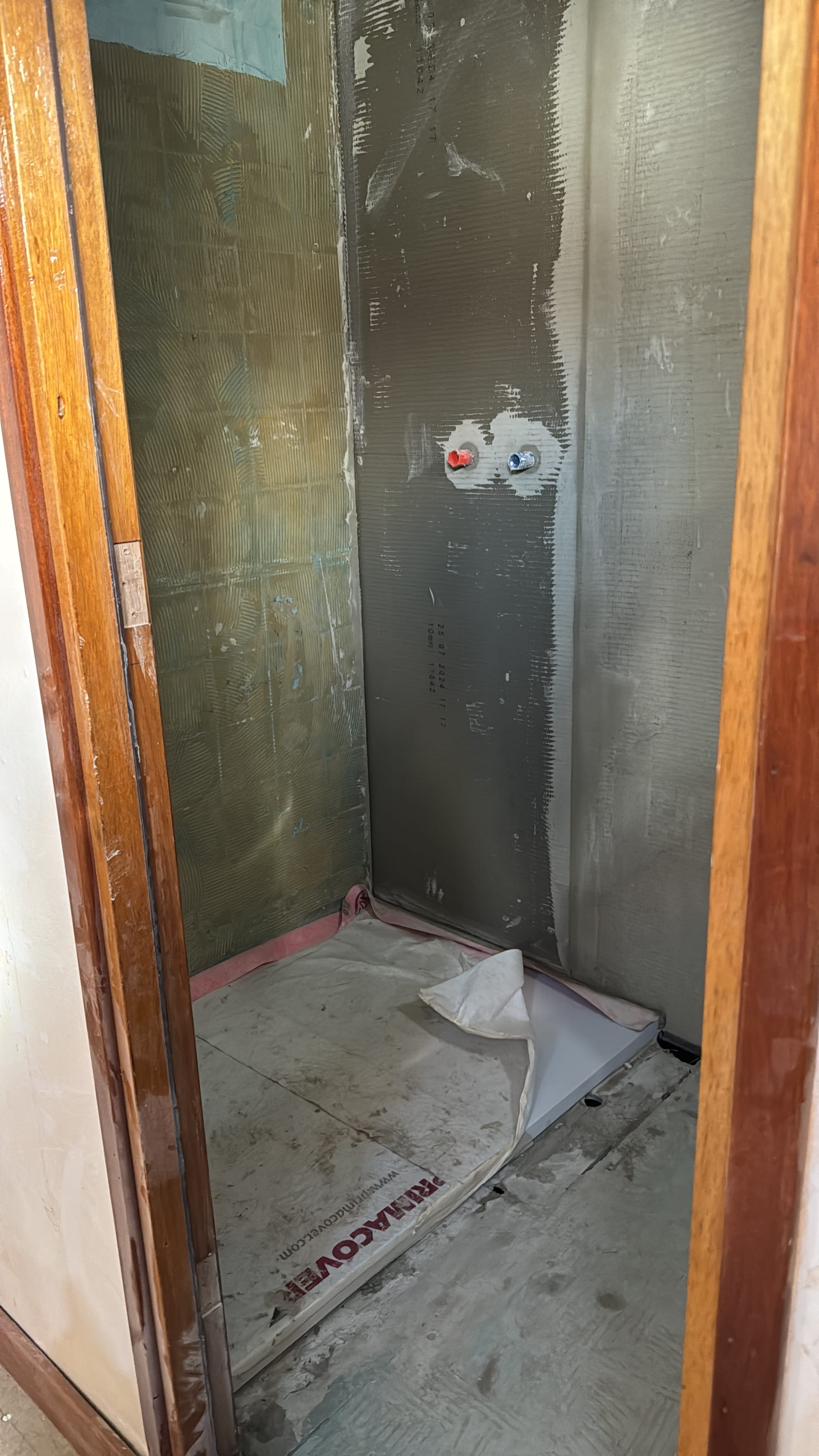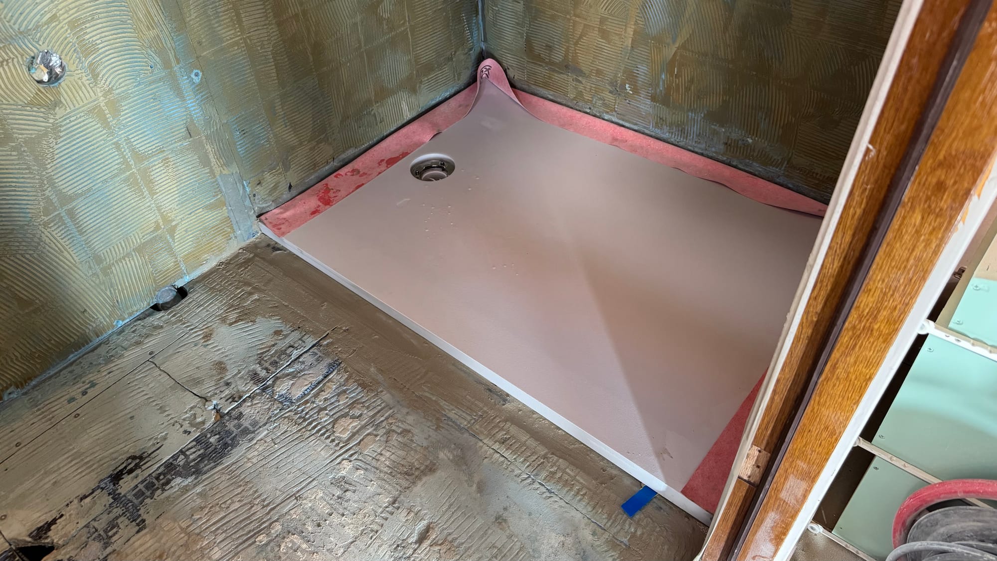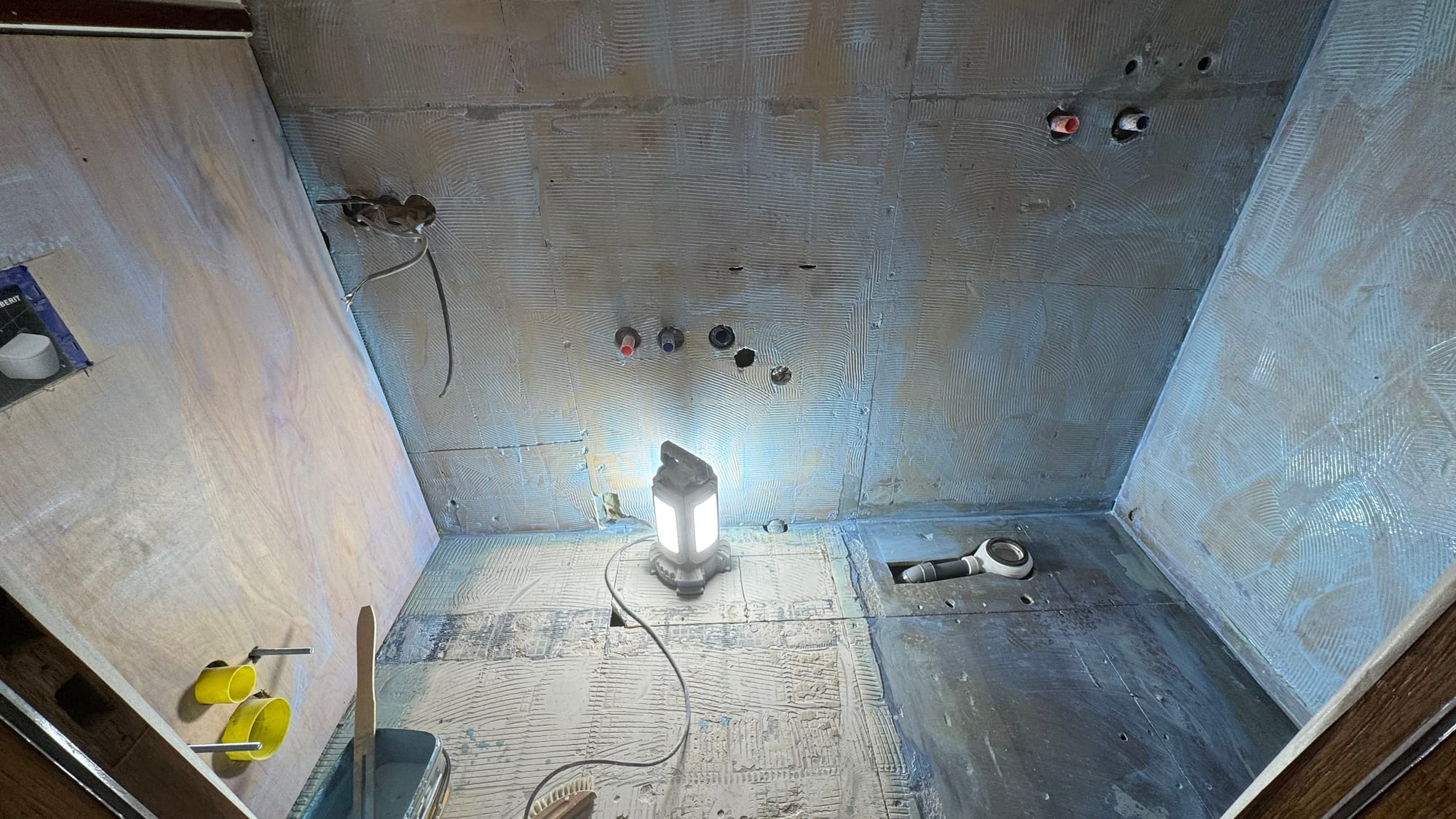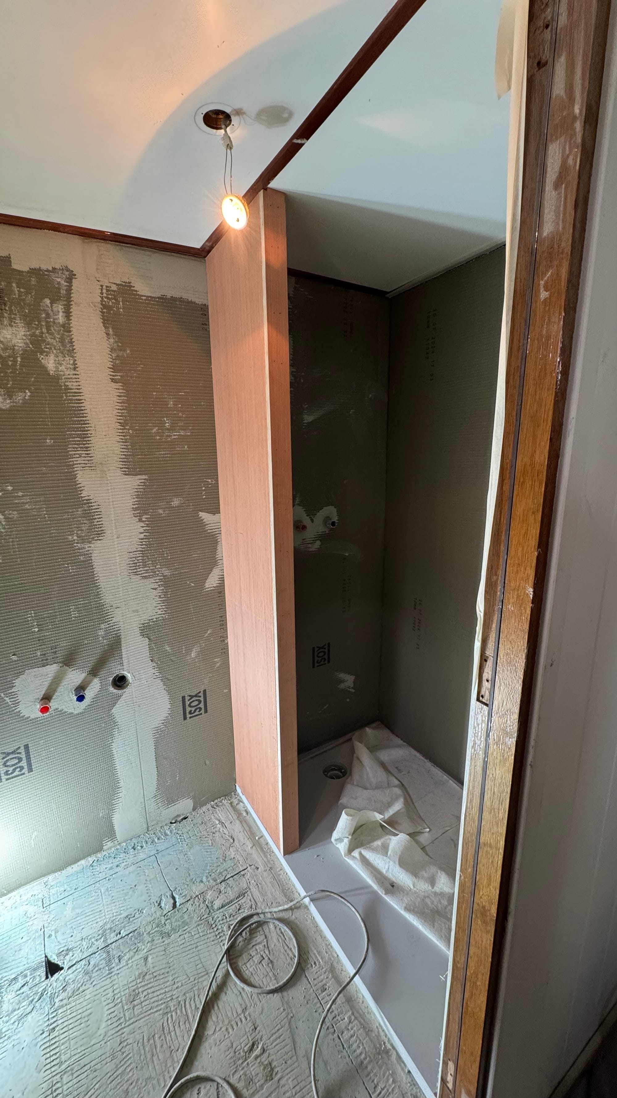 Tuesday, the bathroom specialists started. It's a different dynamic having people working on Delfine every day, and it's terrific to (literally) turn the corner and see something new that you didn't do yourself! The bathrooms are a very involved process: waterproofing layers, seals, fibreglass board, more waterproofing, more seals and so on. We'll end up with a finish called "Forcrete" (similar to another brand, Mortex), which is a micro-concrete finish in a rusty pinkish colour (similar to Karina's childhood bedroom from the '80s!).