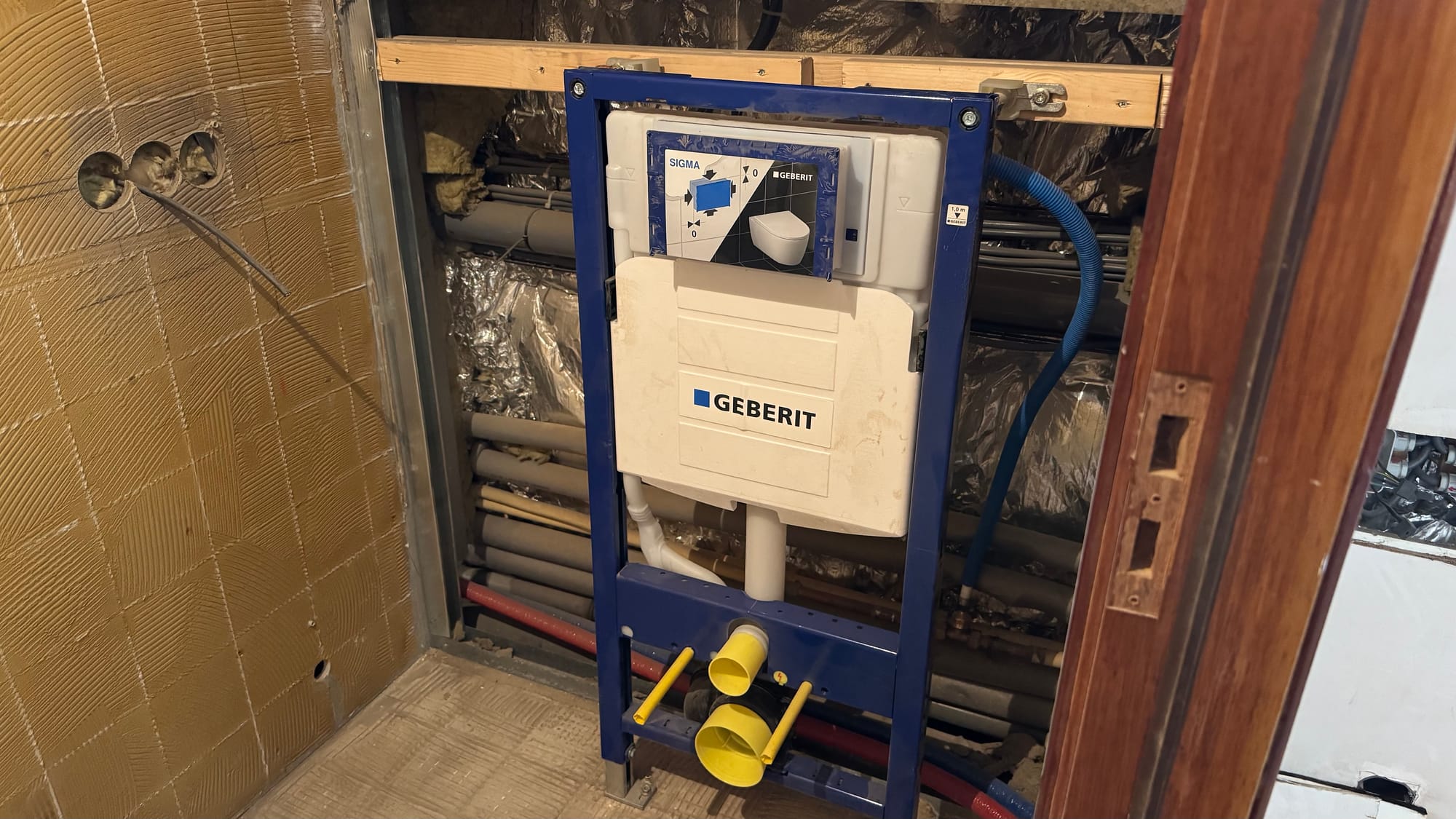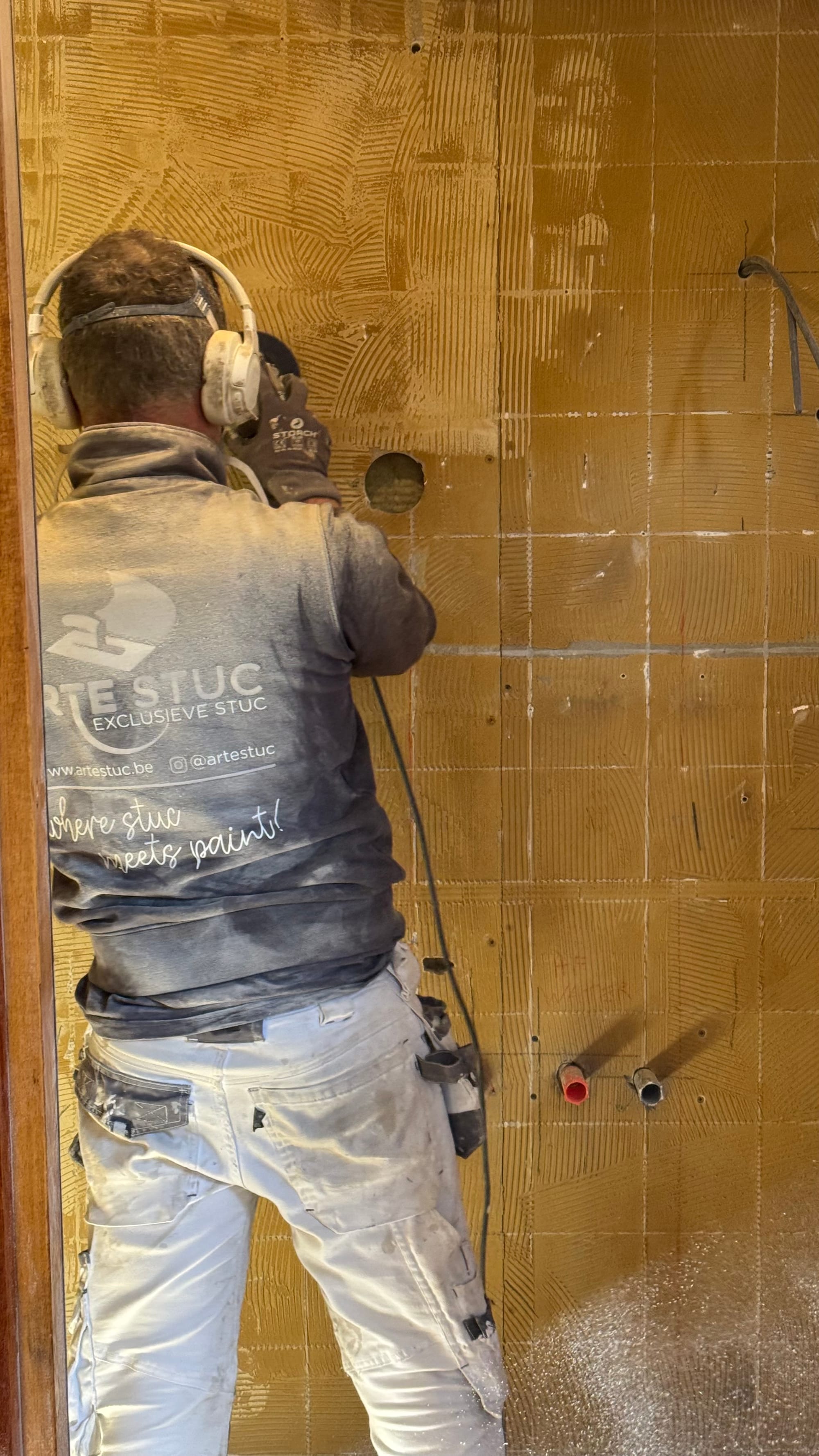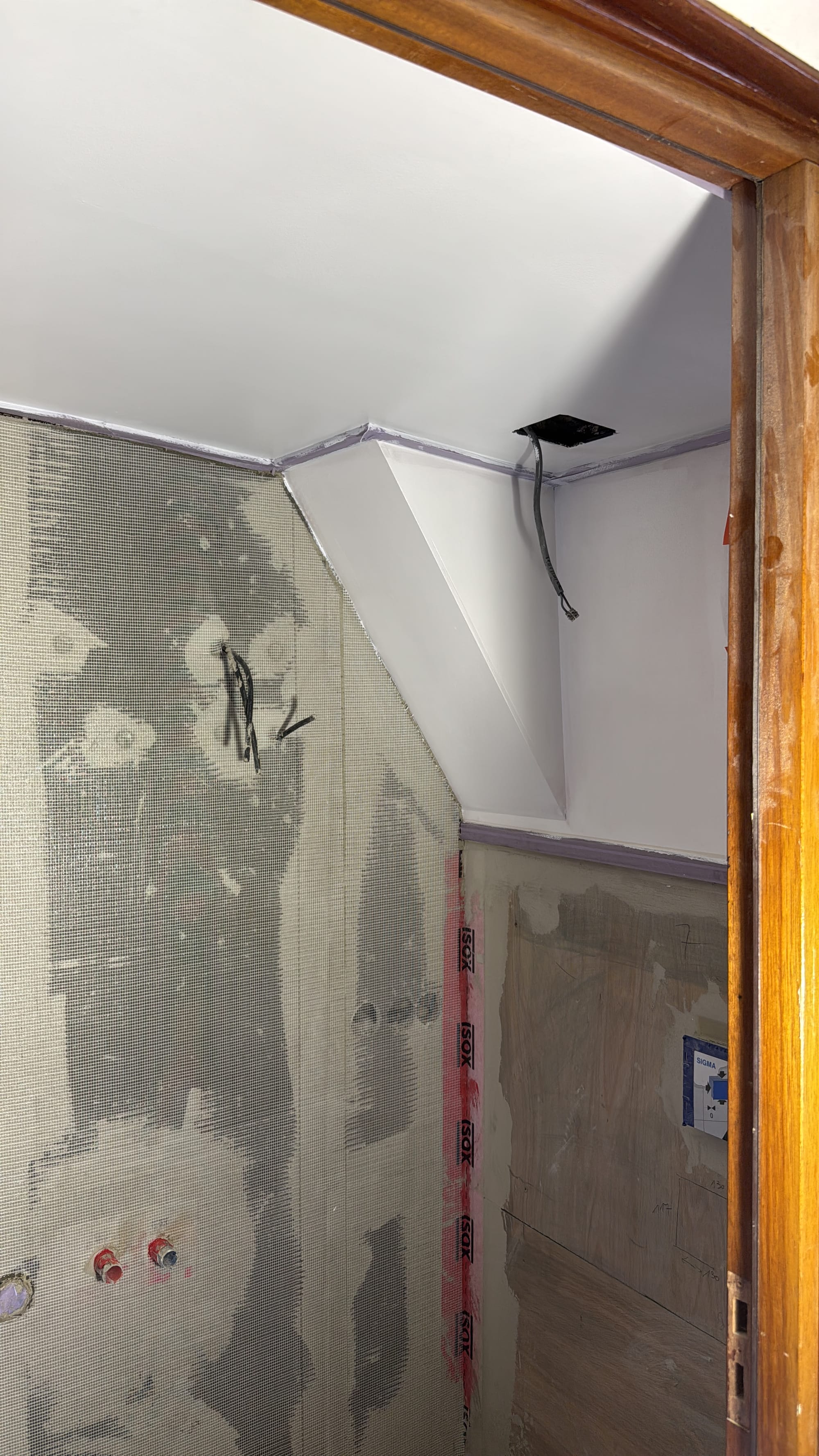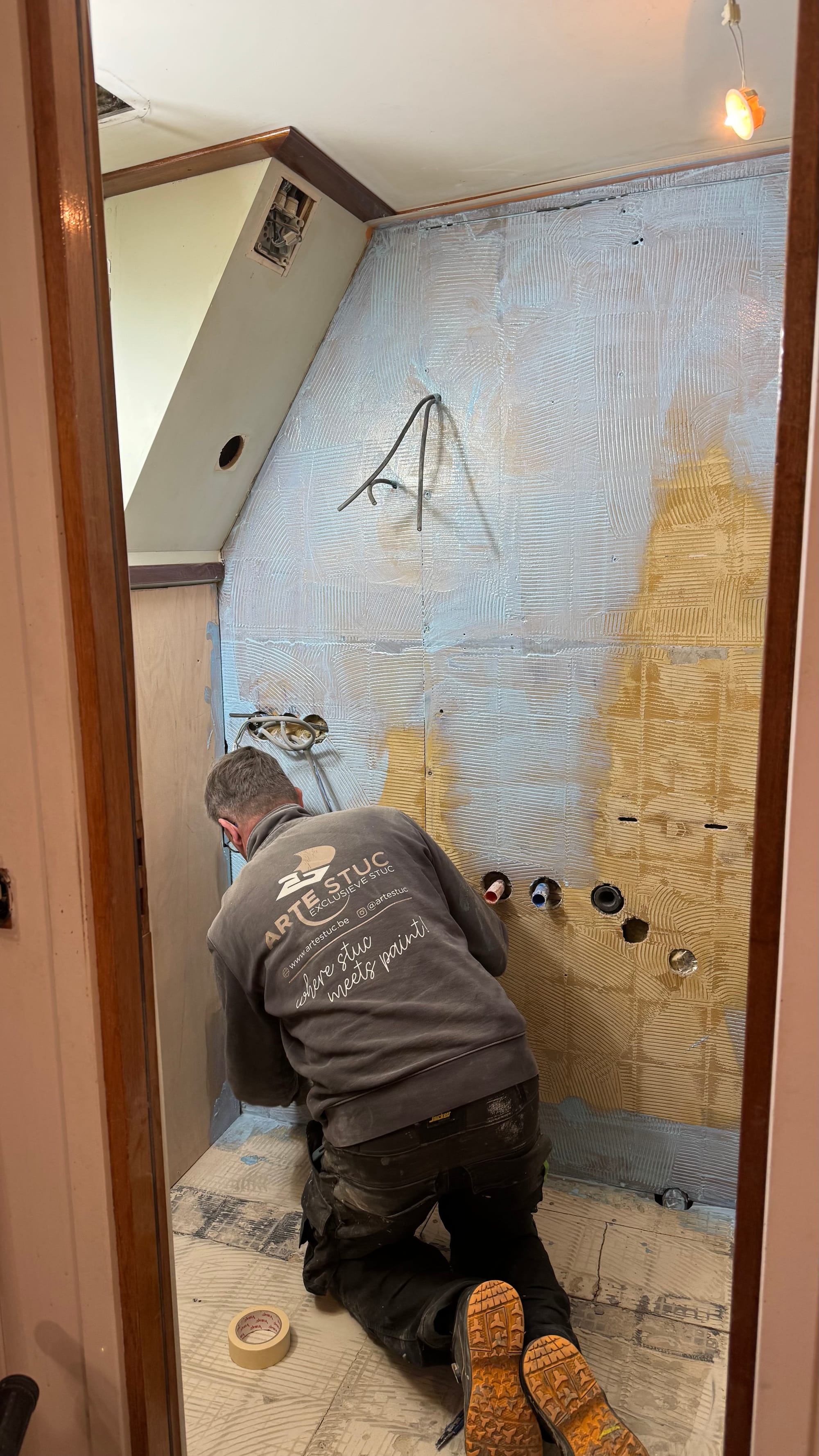 This is good because the focus has turned full speed to building things back up again! I arrived early on Monday to finish filling in the bathroom walls. Then, in the afternoon, we met with Kristof, our project manager, and the architects to go over all the final lighting positions. It was then that I discovered that I also needed to fill in the wall behind the toilets (I'd thought someone else was doing that!), so we had to go purchase the wood I needed for that job.