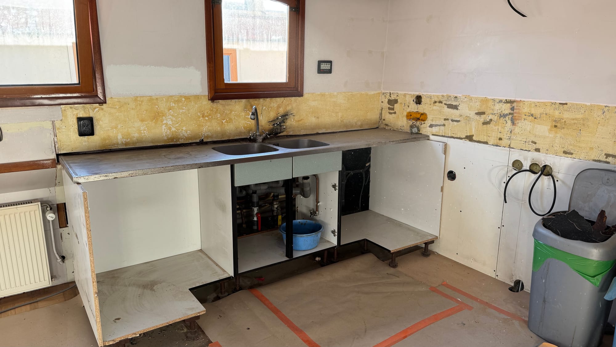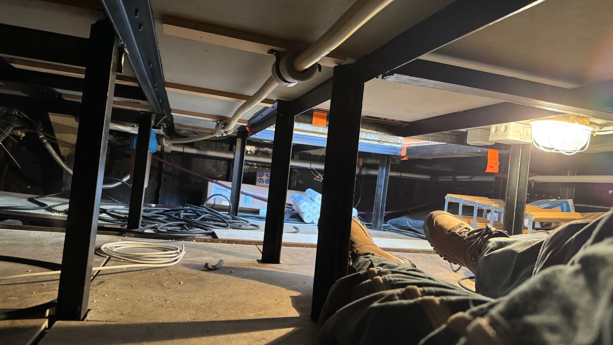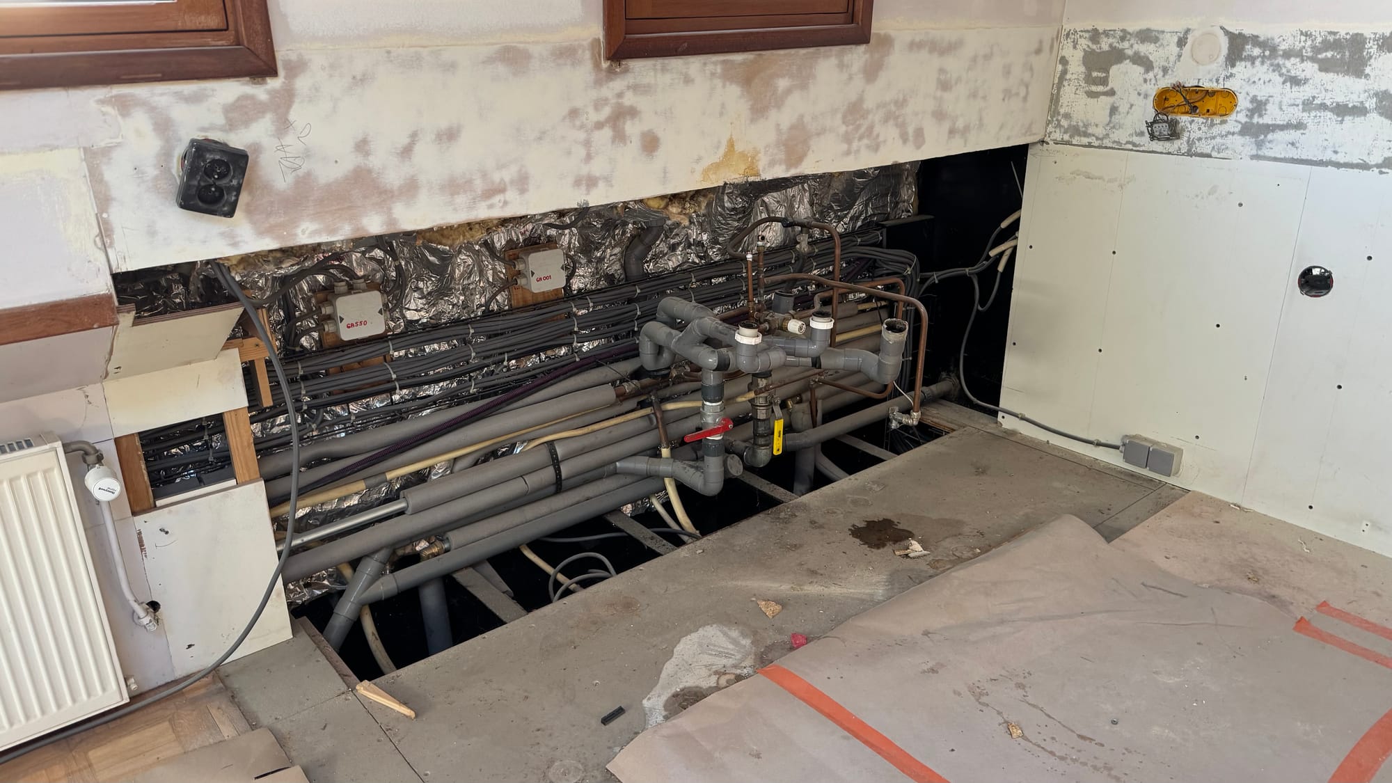 Demolishing the kitchen. I went under the floor to pull out the old LPG sensor (it's a pet hate, if unavoidable sometimes, old wires left around that don't do anything anymore).