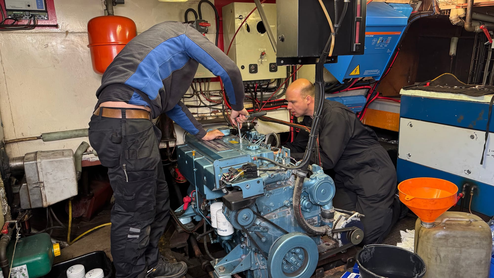 They went over everything with a fine tooth comb and unlike the engineer we had back in France, were able to actually find the air filter! They adjusted the valve timing, checked all the belts and hoses, and wrote a report. Overall, the engines are in excellent condition, and we're safe to operate them for the year, but a few items should be replaced. These are primarily hoses that have been sitting and baking in high temps for a few years, are getting stiff, and should be replaced. The generator and motor were also checked, and received fresh oil and filters. There were no real issues, but we need a new belt.