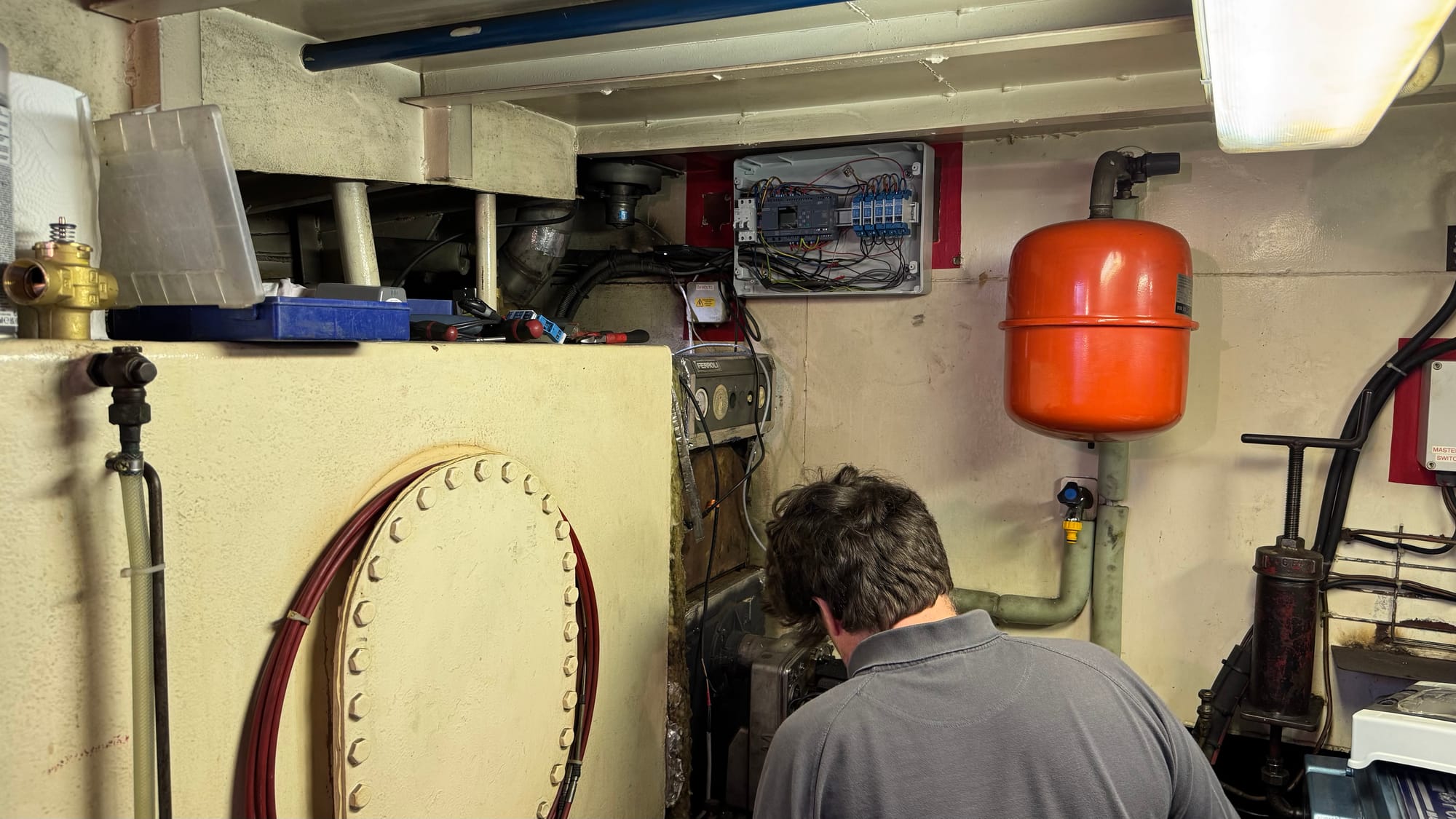 Bart installing the new heating computer, new sensors and fixing the leak on the circulation pump I failed to install properly weeks ago.