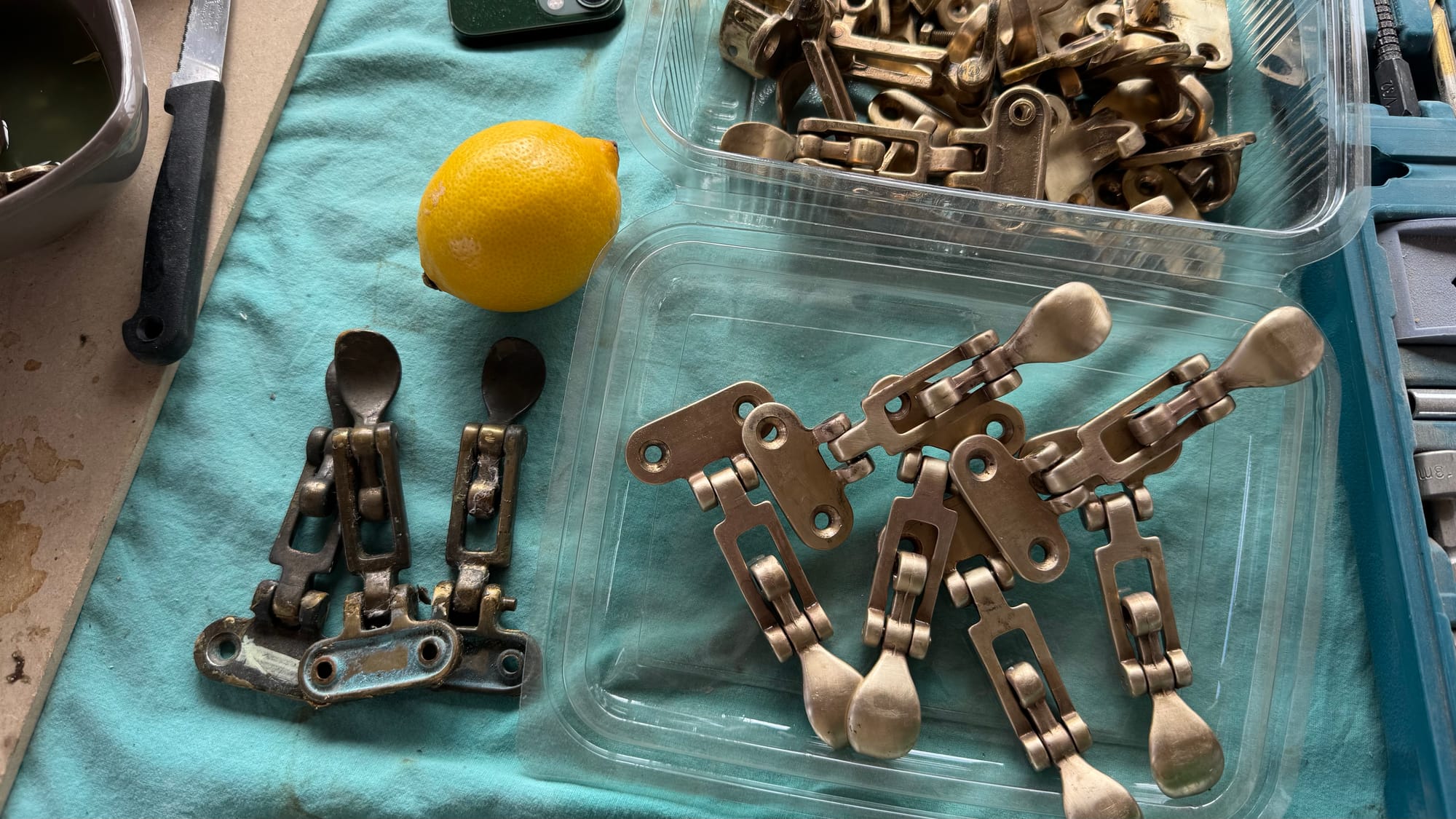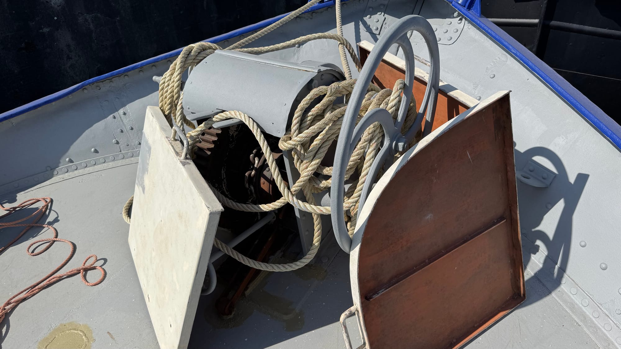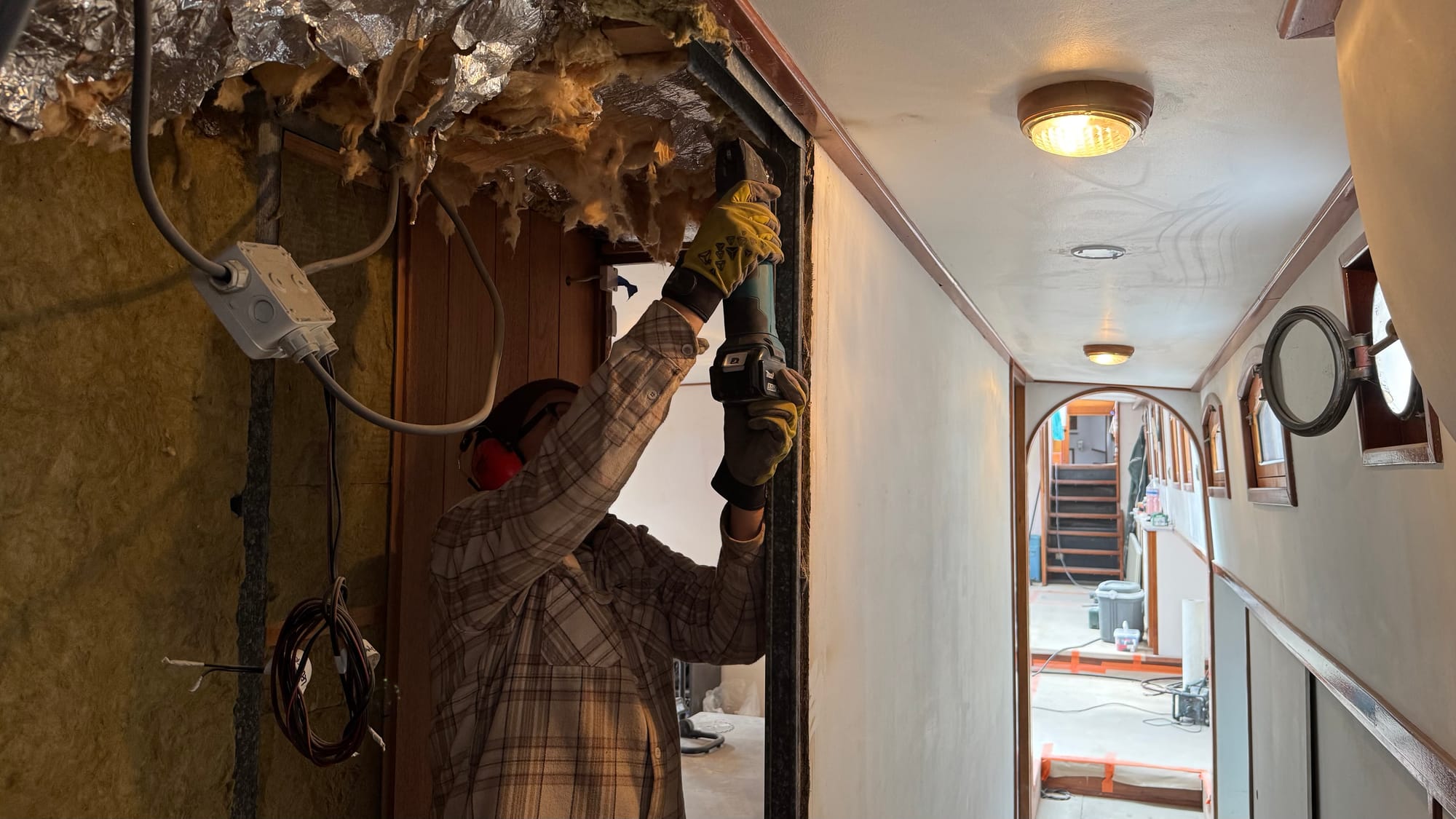 Karina kept busy ordering the lights, chasing people for information on colours for the bathroom specialists, and sanding the wheelhouse. She rode an hour to pick up a new support bracket for a fire extinguisher and kept everything moving. She removed the remaining hardware from the wheelhouse roof and then polished it all, ready for me to start putting it back with Simon next week. She also has far more energy than I do for long conversations with the architects and builders about the location of power outlets.