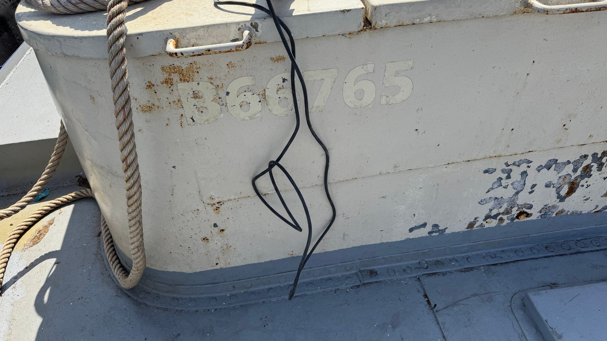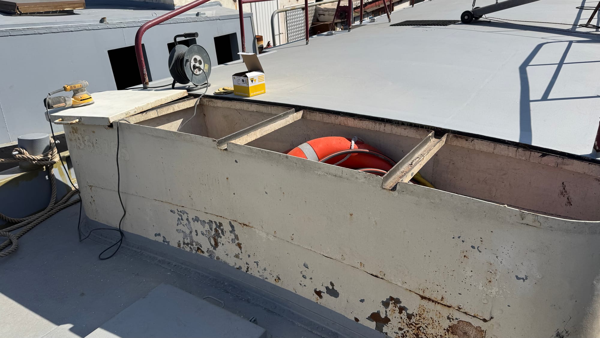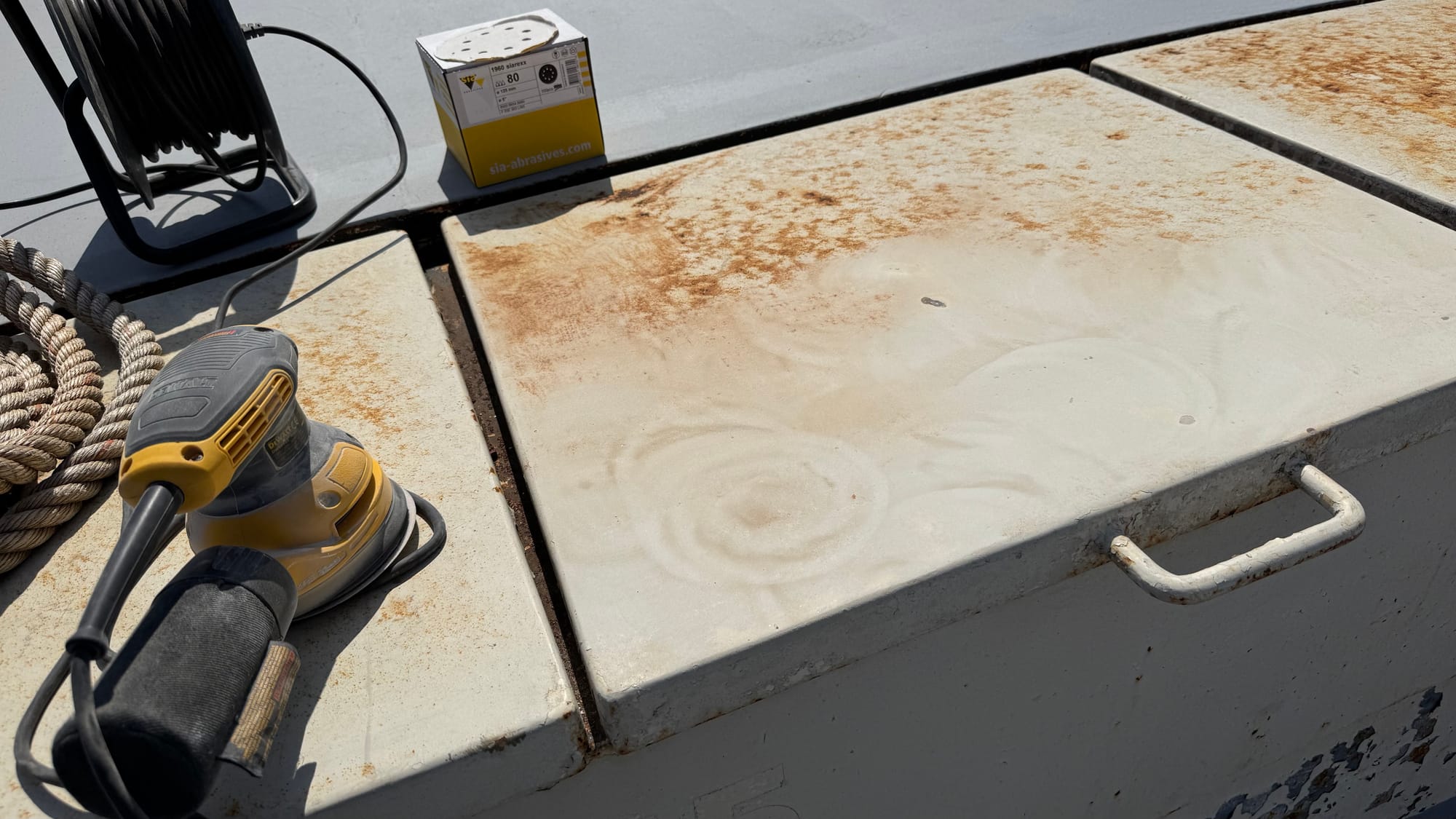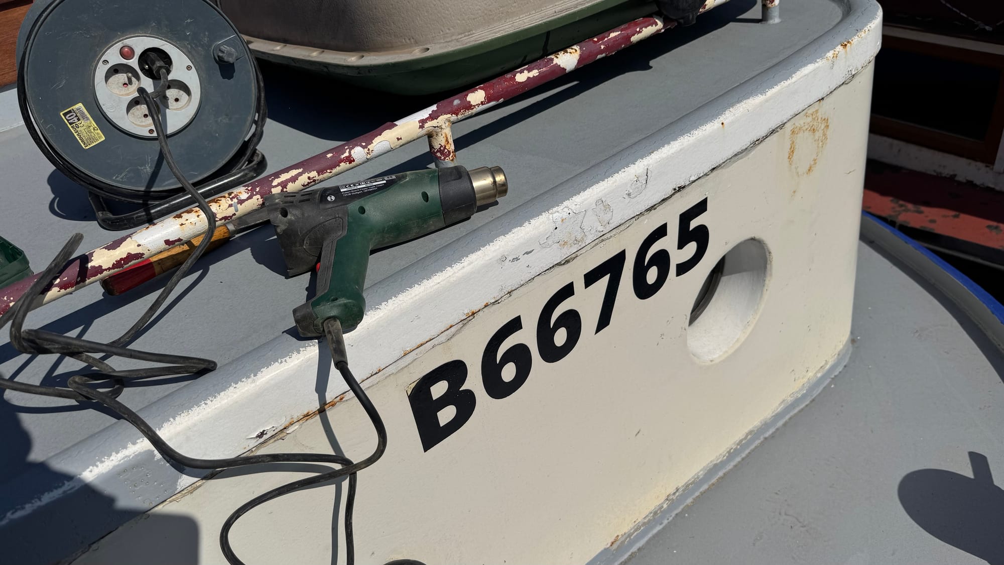 With that in mind, I took advantage of the weather and moved outside Delfine, starting the sanding process in preparation for painting. Not all the outside (yet), but I am very focused on the critical parts needed to complete the survey—the front and stern, where we will put the names and numbers to meet that requirement.
