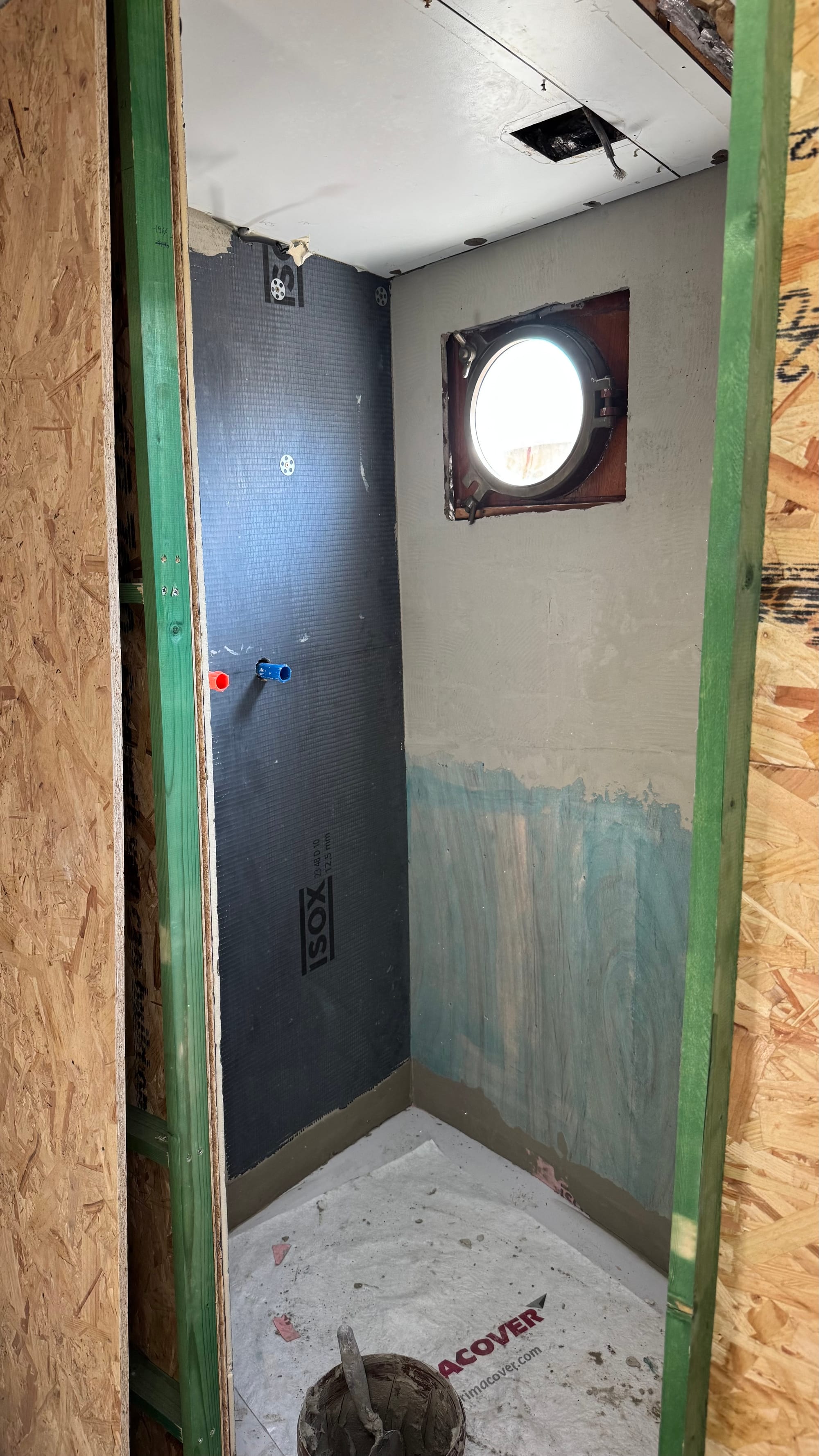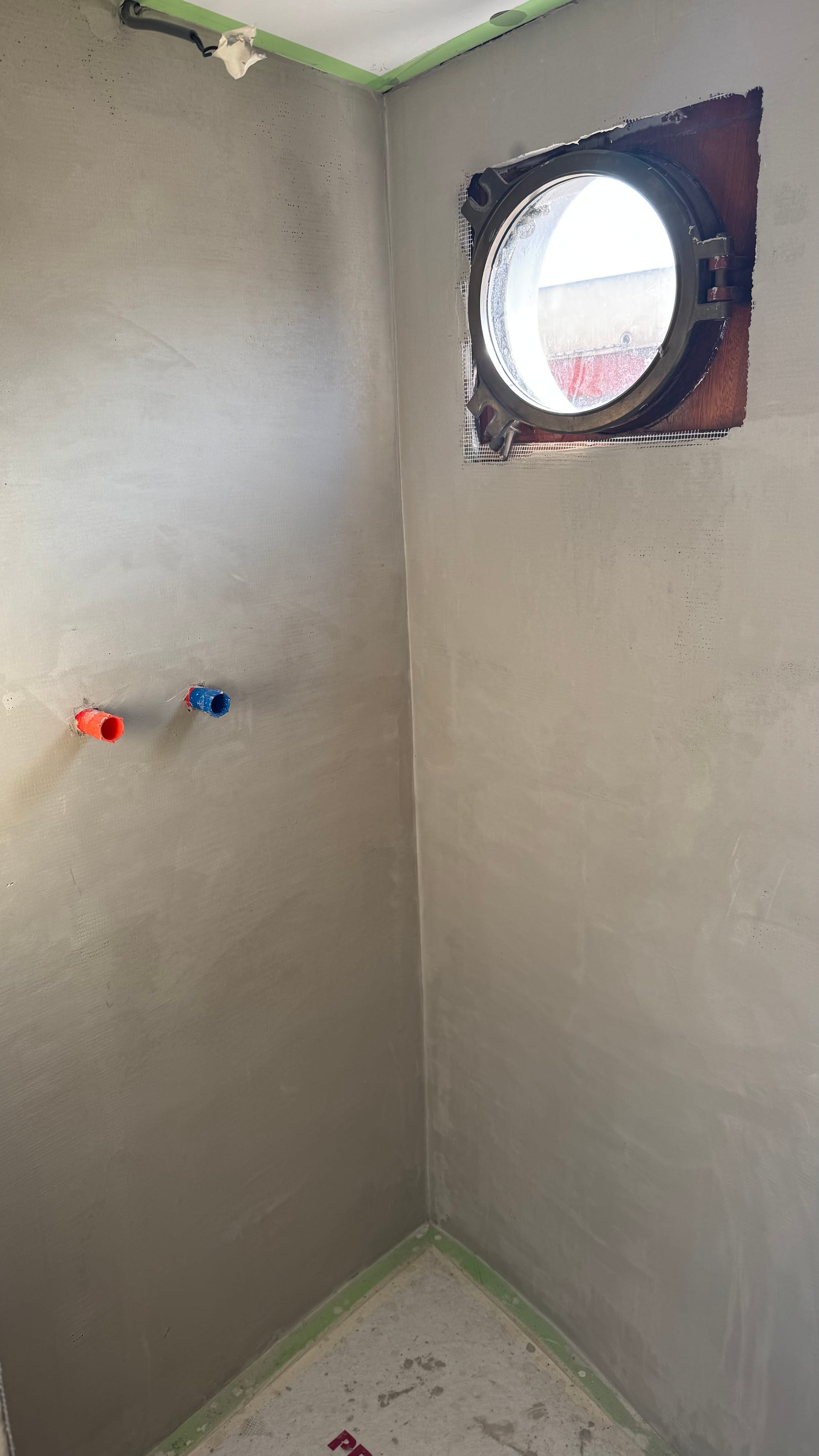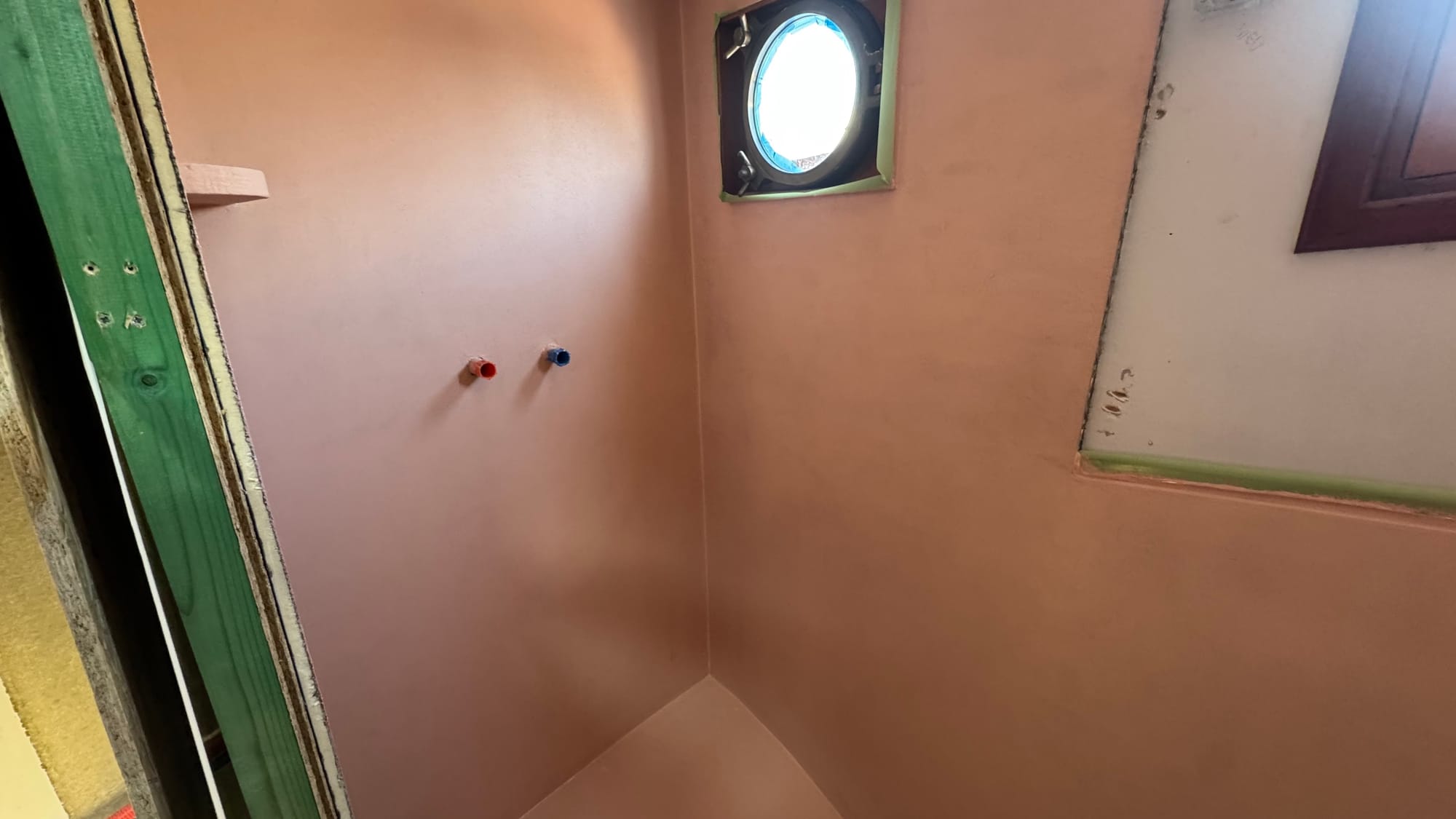 The new stern cabin. It's hard to see, but the green around the portal is where I put the new trim (it's been taped up to protect it here)