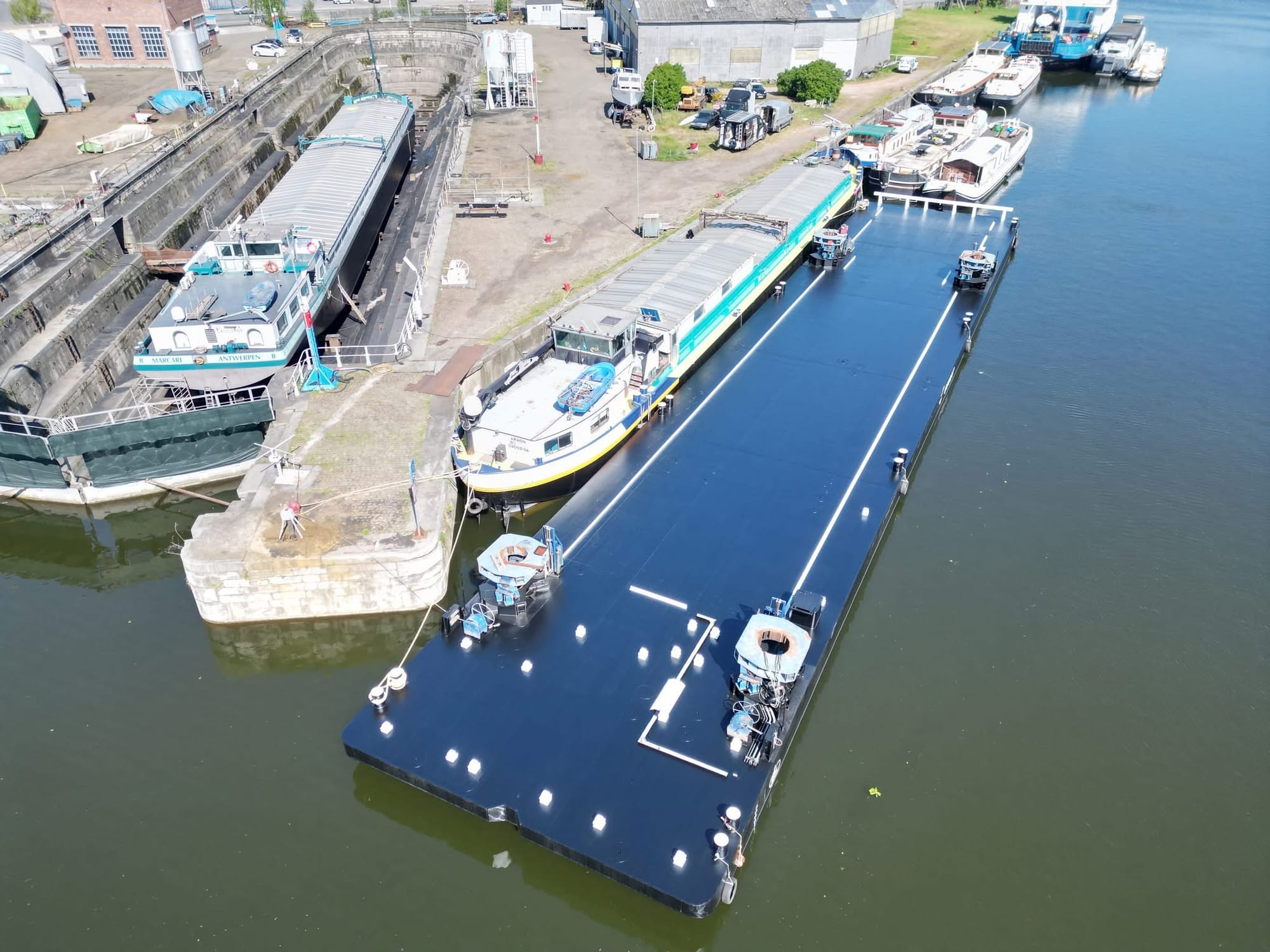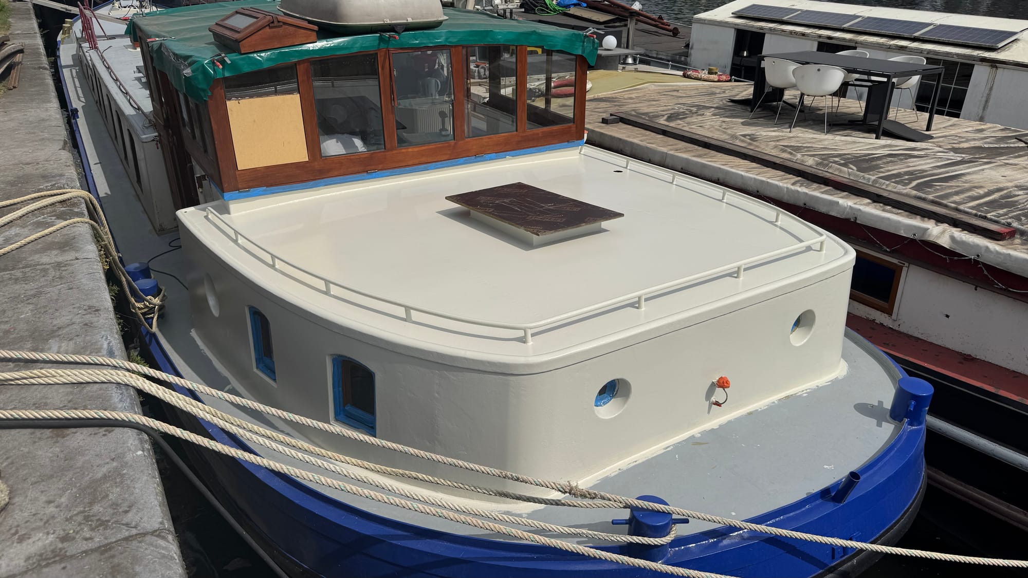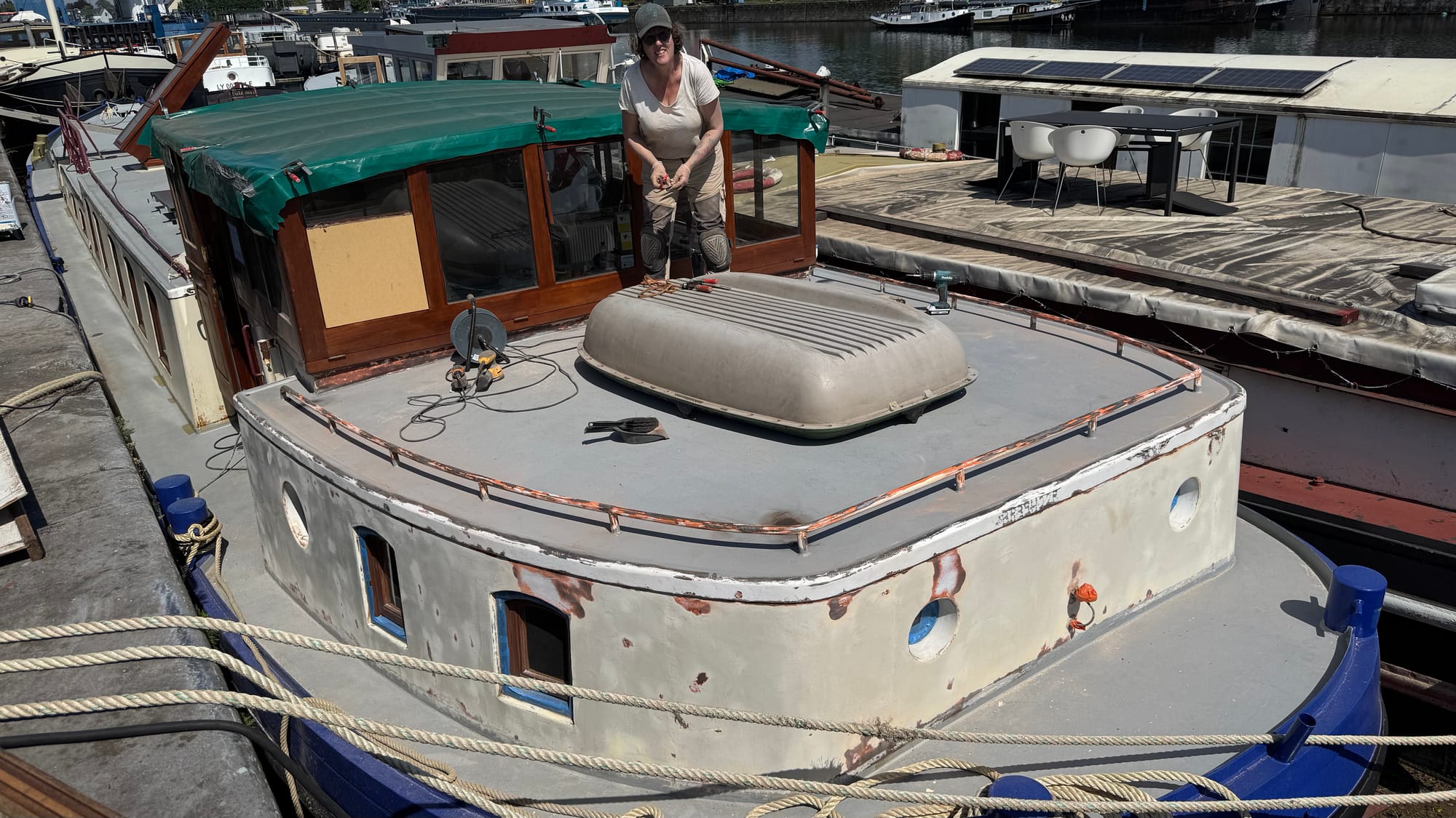 The weather was hot this week, 28 - 30 degrees, a scorcher for Belgium, and frankly quite humid and sticky on the canal with no breeze. We worked hard on the stern, Karina did a lot of sanding out there, and it was ready for painting by Thursday.