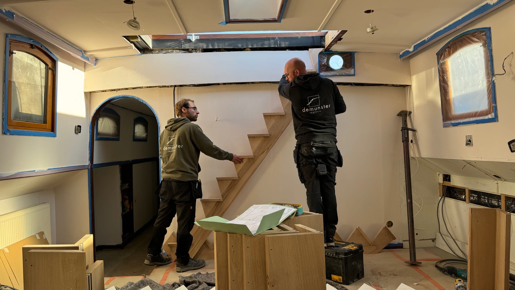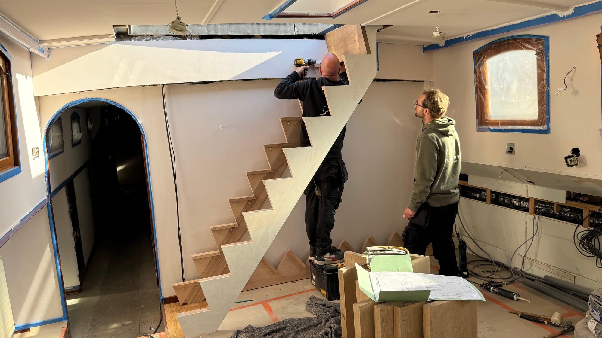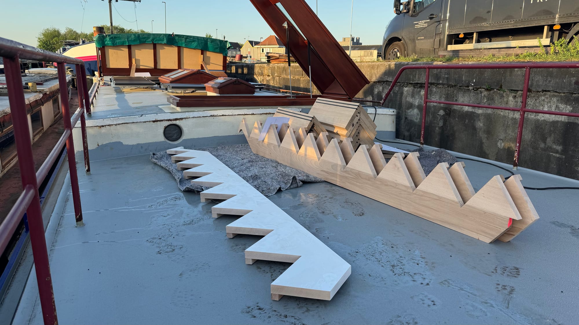 The stairs are in! And what a milestone. This is the first real piece of construction on Delfine, a big step up (pun intended) towards her new layout as a hotel barge. It feels like such a long process. It's taken 30 weeks – over 6 months – to complete just this piece of the puzzle.
