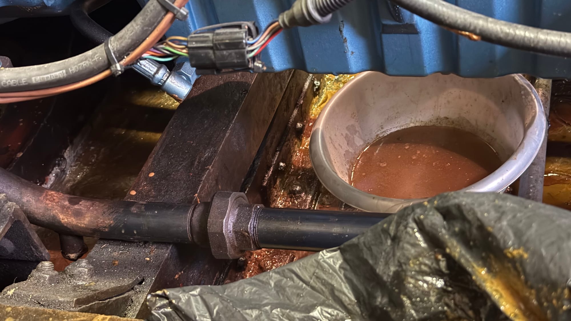 Fortunately, there's little danger of rust; there's such a thick layer of grease under there that it's all sealed up well, but I still wanted the water gone to monitor things better. It's a lesson I've learned over the years – if things are clean, it's easy to spot leaks early. "I'll just pump it out," I thought. But before long, I was down on hands and knees, with sponges squeezing out the water, then rags wiping up the excess grease. It's mostly clean now. But it took a lot longer than I expected and left me filthy by the end of it!