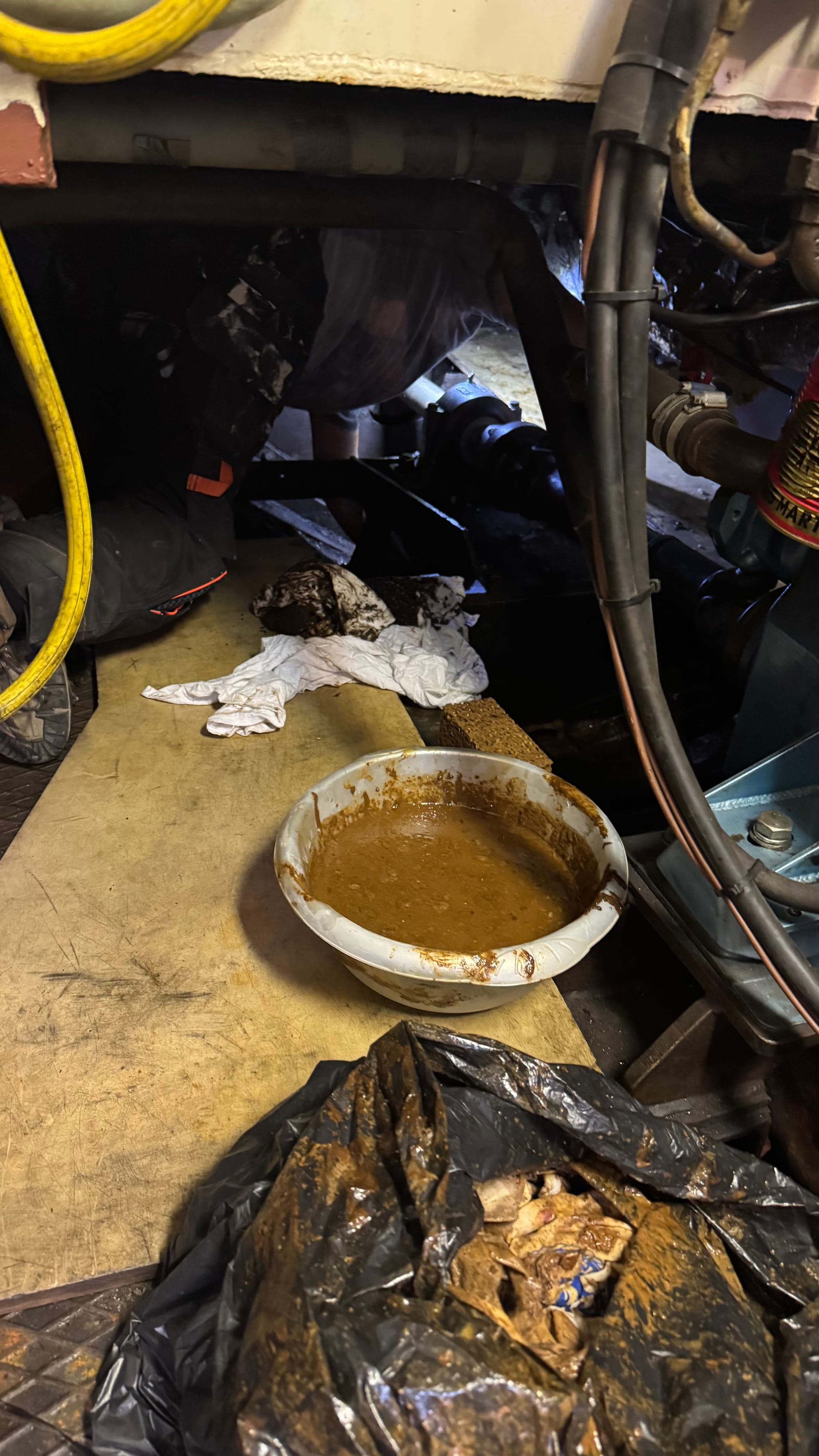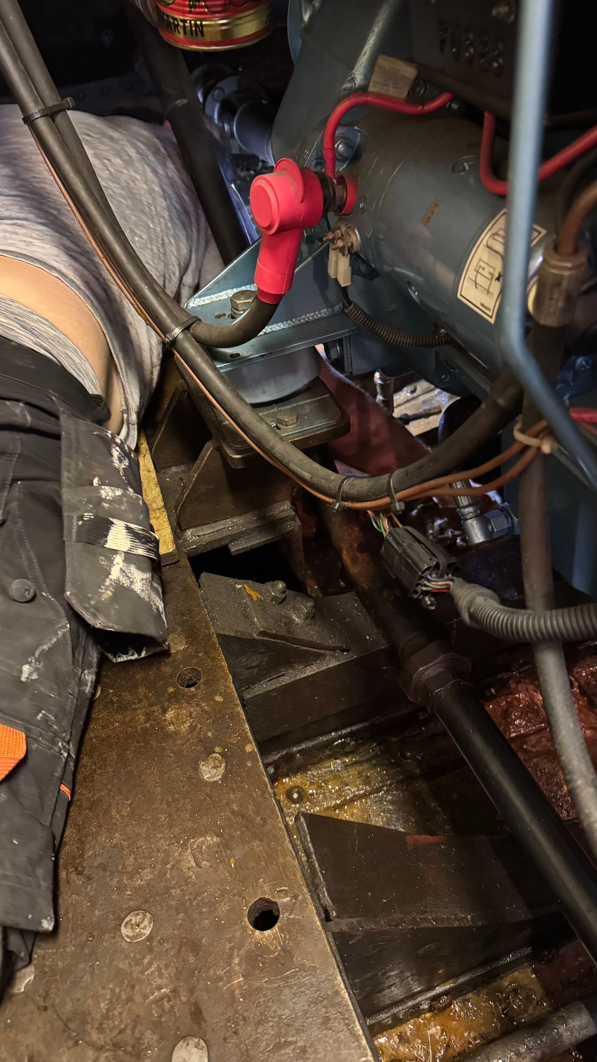 Delfine doesn't leak. But the bilge under the engine bay was full of water. Mostly this has come from the heating system, which has spilt water on several occasions as it's been maintained, as I've screwed things up, etc. It's possible that the old prop shaft leaked a small amount of water as it was operating too.