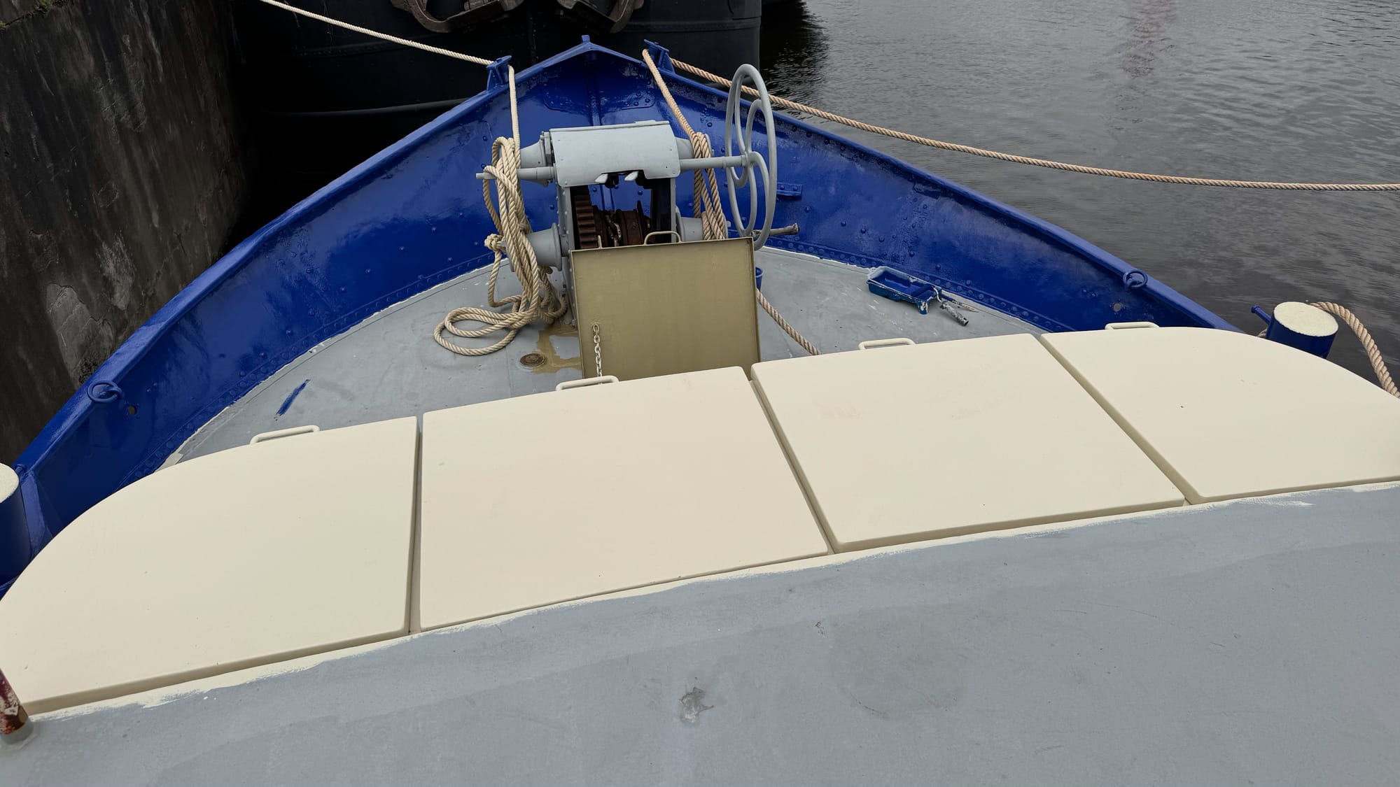 Wanting to keep pressing ahead, I went out last Sunday to paint the wheelhouse and finish the black, only to find that the tin of supposedly black paint was a fetching shade of grey. Of course, the paint store was closed on Sunday afternoon, so instead, I applied a final coat of blue to the inside of the bow, taking advantage of the weather. When I returned the paint on Monday, they replaced it free of charge – someone had mixed it using the wrong base.