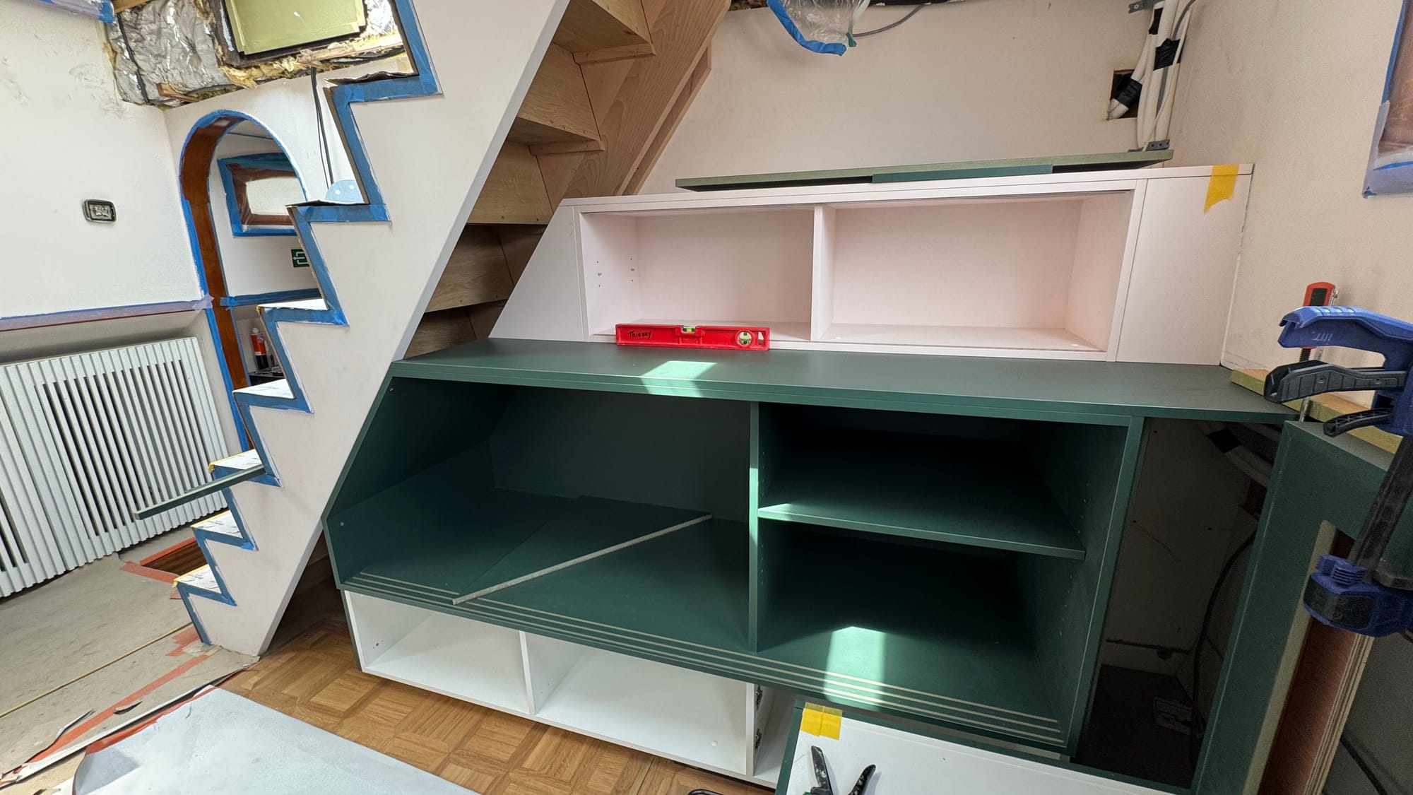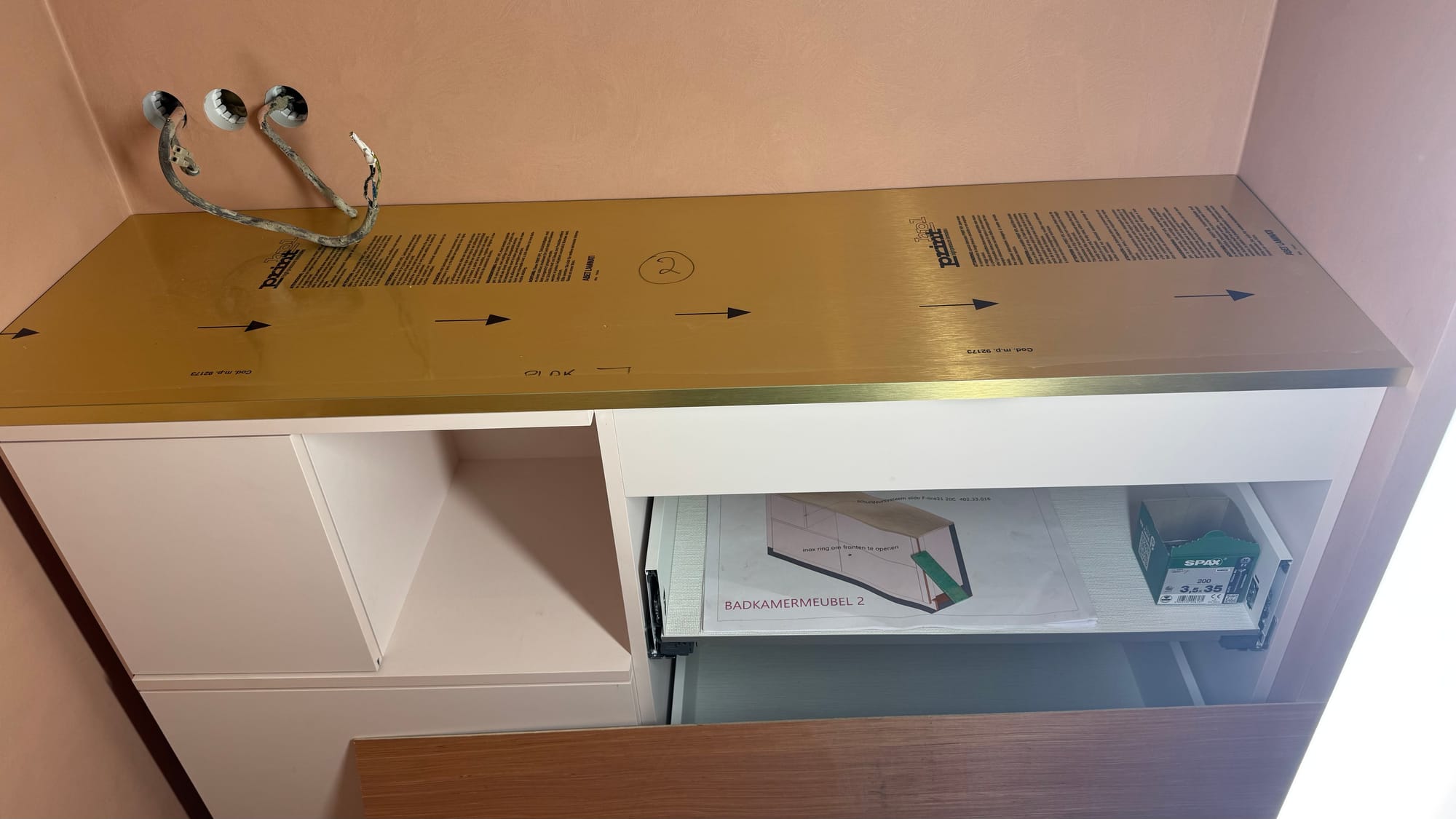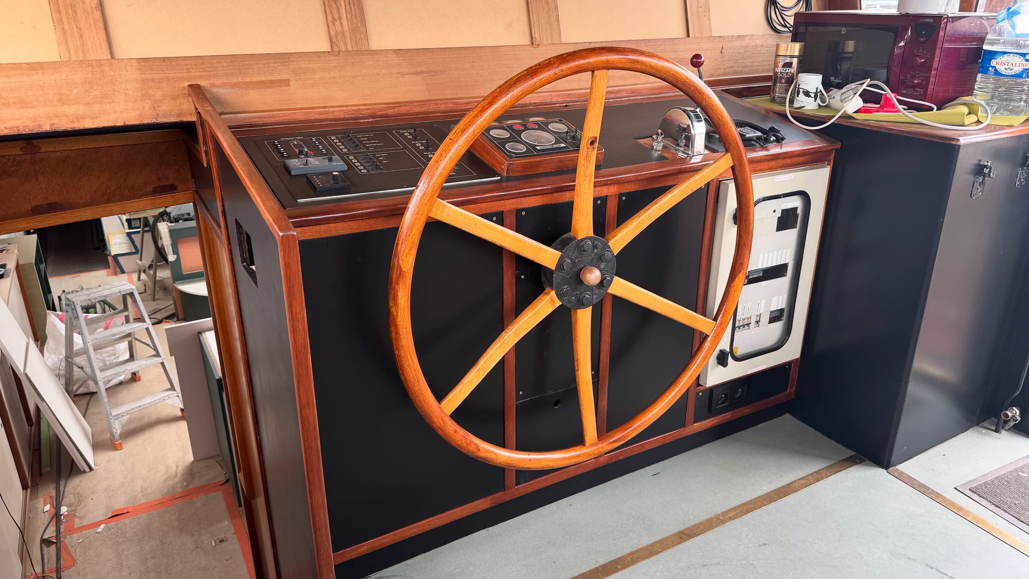 The desk in the crew cabin. The wash basin goes on the right. The brass countertops in the bathrooms. Cabinets under the stairs (the large cabinet is for the TV).