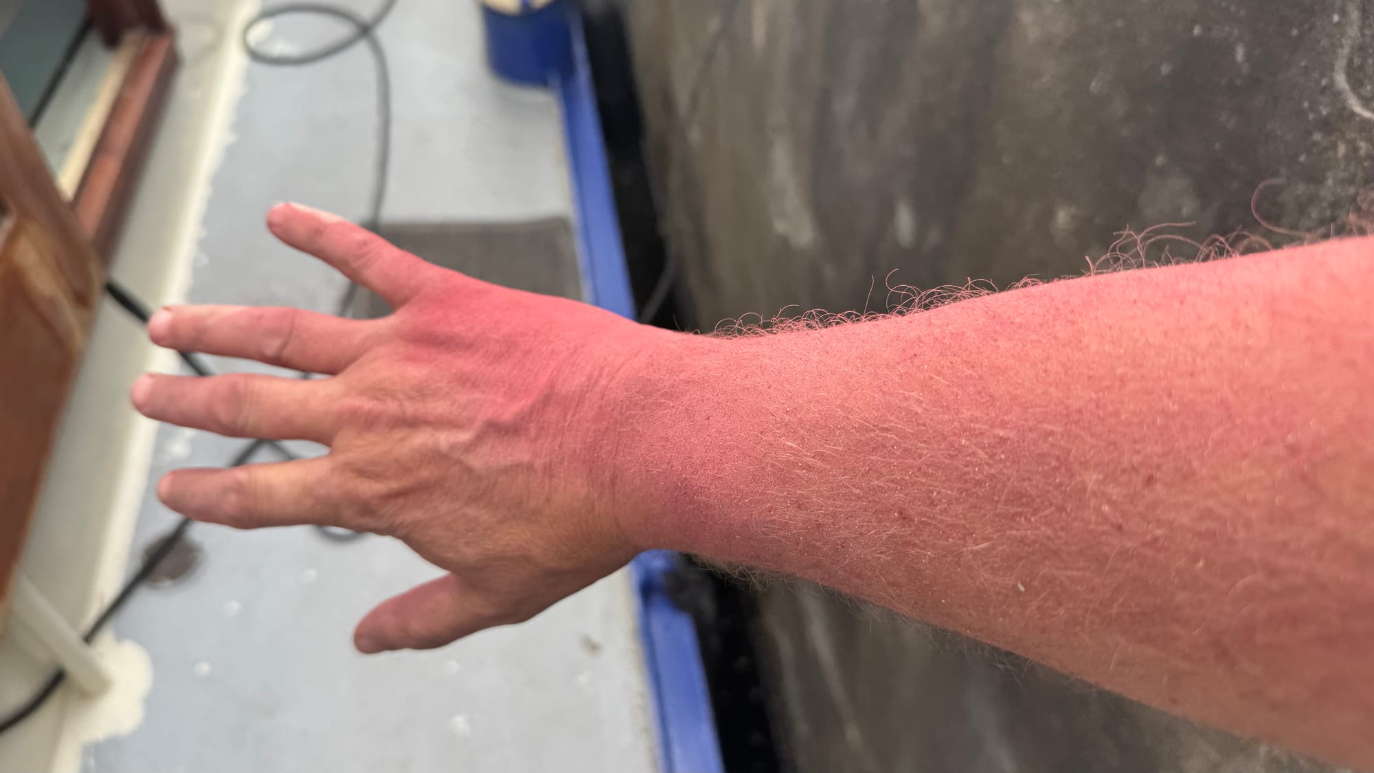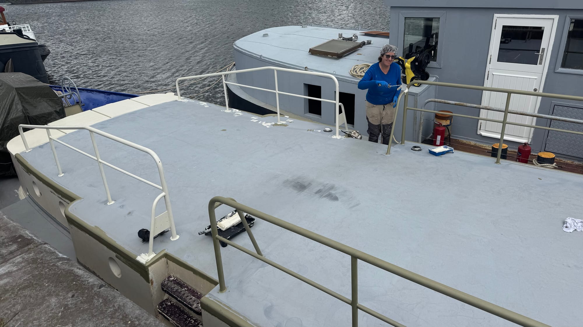 With the prep on the foredeck completed, we were able to get the between layer on, ready to put a final coat on this coming week. We're hopeful that the weather (which has been very wet) improves enough for us to apply two coats by Tuesday, so that we can let it harden a week before setting up the deck furniture in preparation for Ella, Inge, and Gro's visit.