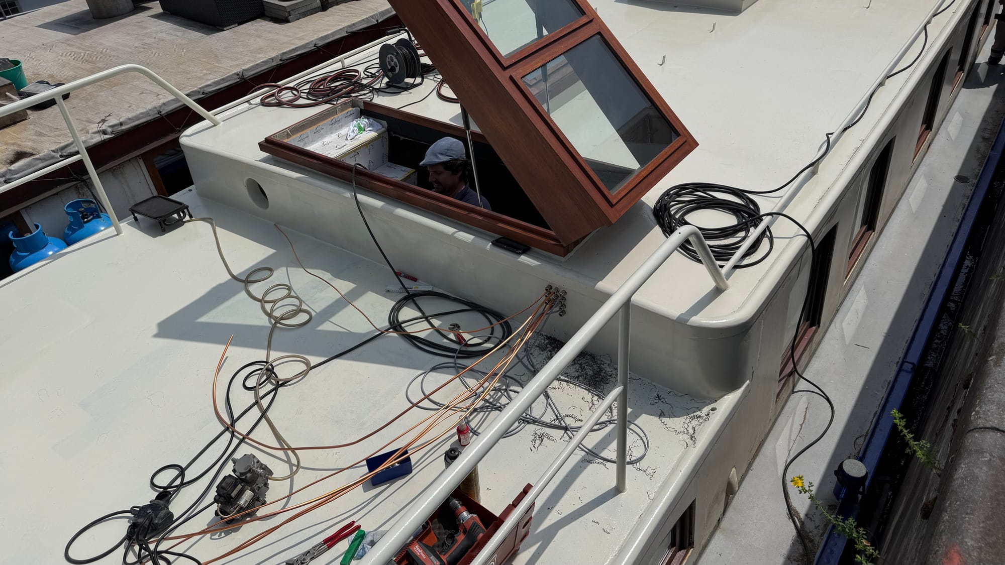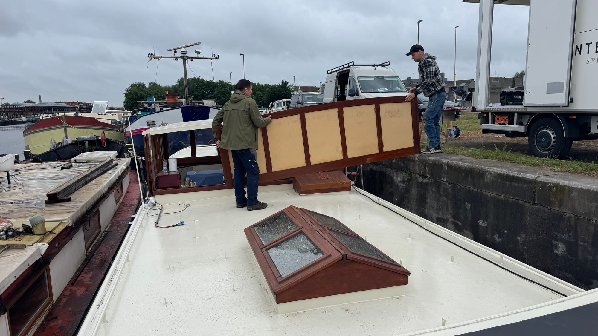 Simon, Jonas and an apprentice came to Delfine on Wednesday to start working on the ceiling in the wheelhouse. It's a very involved installation, but it's coming together well. A couple of coats of paint and that job will be completed. Unfortunately, there's a delay on the glass for the front of the wheelhouse – the company manufacturing it says it's complicated because it's hardened glass and they won't have it completed until August! We'll probably put Perspex back in the short term, so that we can move the boat.