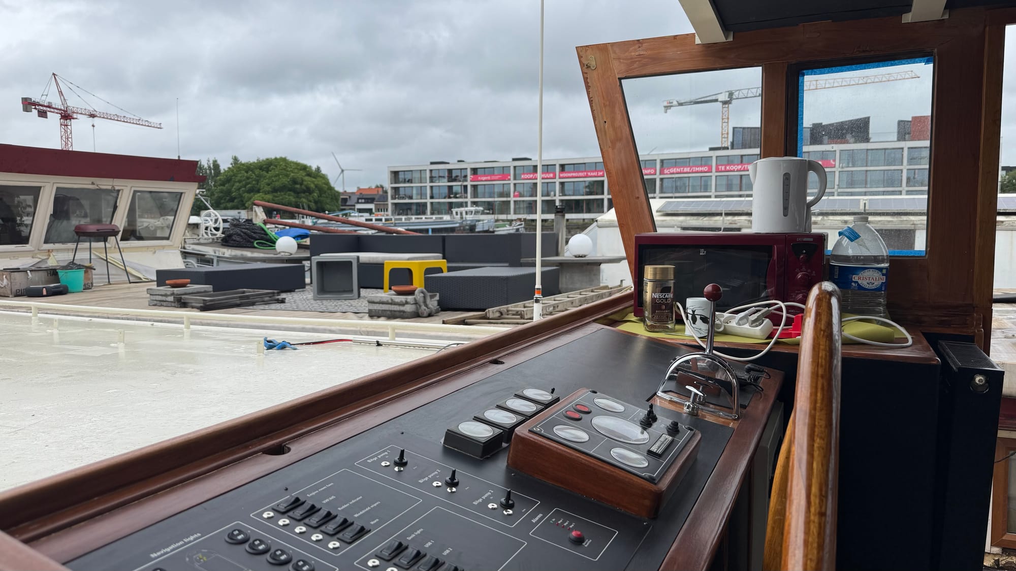 Our ES-TRIN requires a Class A AIS installation. Martin helped find someone to do it. They are located in Terneuzen (Netherlands), which is only 35 minutes from here by car, but they are so busy, they can't get anyone to install the system for months. They said that if we can bring the boat to them and park outside their office, they'll be able to do it on short notice (basically, the technician who mans the phones will do it in between calls). Of course, we're unable to move the boat at the moment because we're covered in builders and we can't see out the wheelhouse! At least there is a clear next step. Most likely, we'll let the builders finish up here this week and next, then take a week off with Ella and Inge before heading to Terneuzen for the installation. We came to Gent without AIS, so I guess it's not a significant issue. I asked them, and they advised that if any water authorities question us, we say we were heading there for the install, and it would be fine.