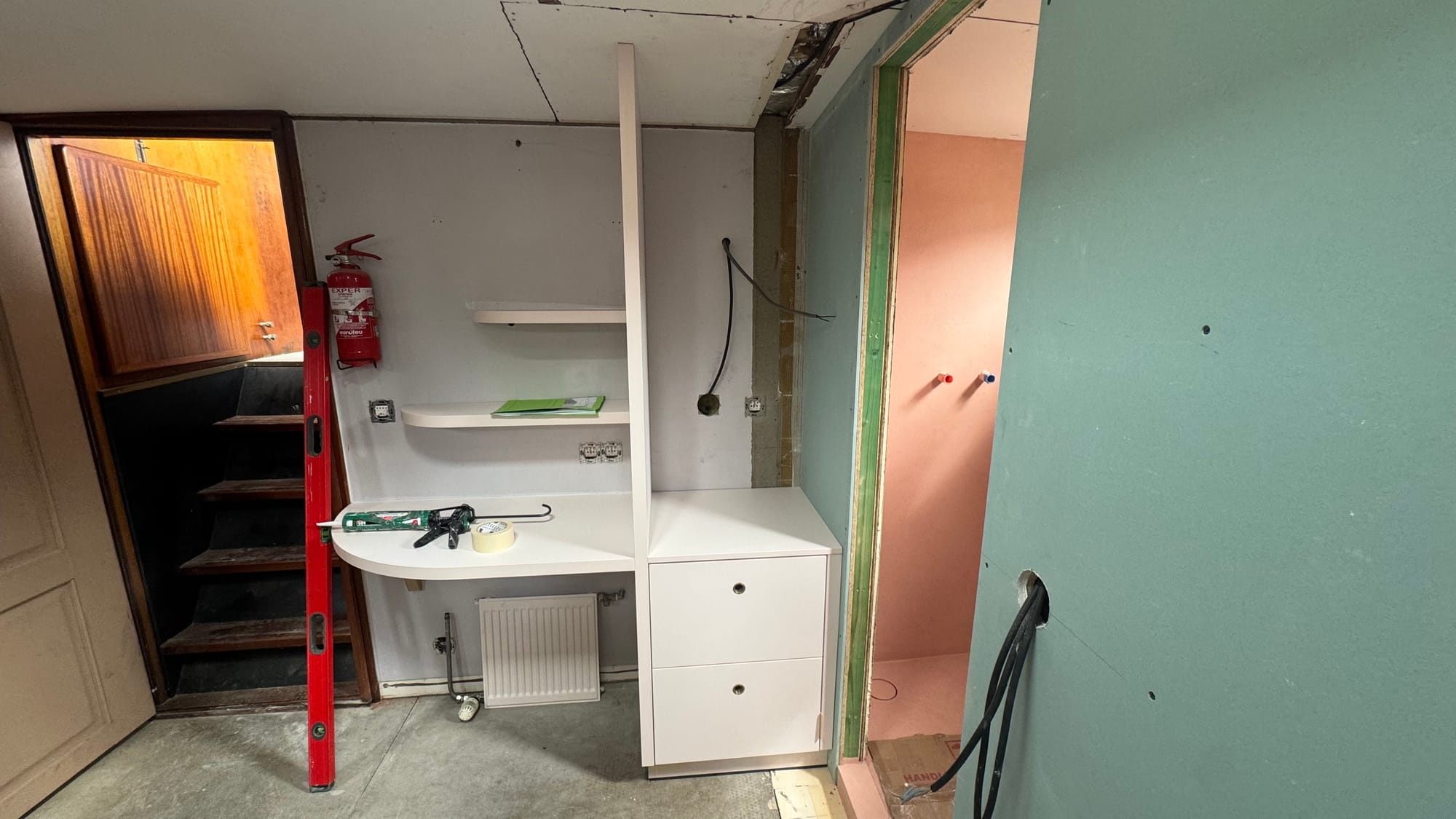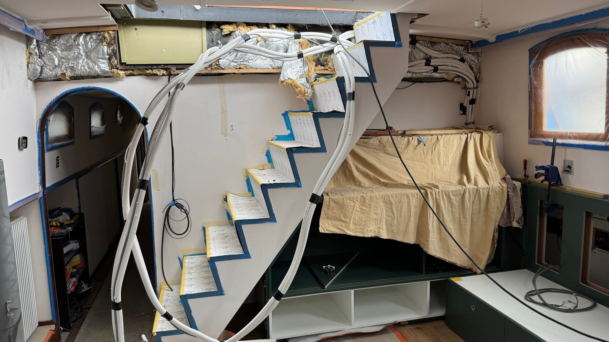 Air conditioning installation - we have to patch (i.e., replace) the wall behind the stairs, but then we're done.
