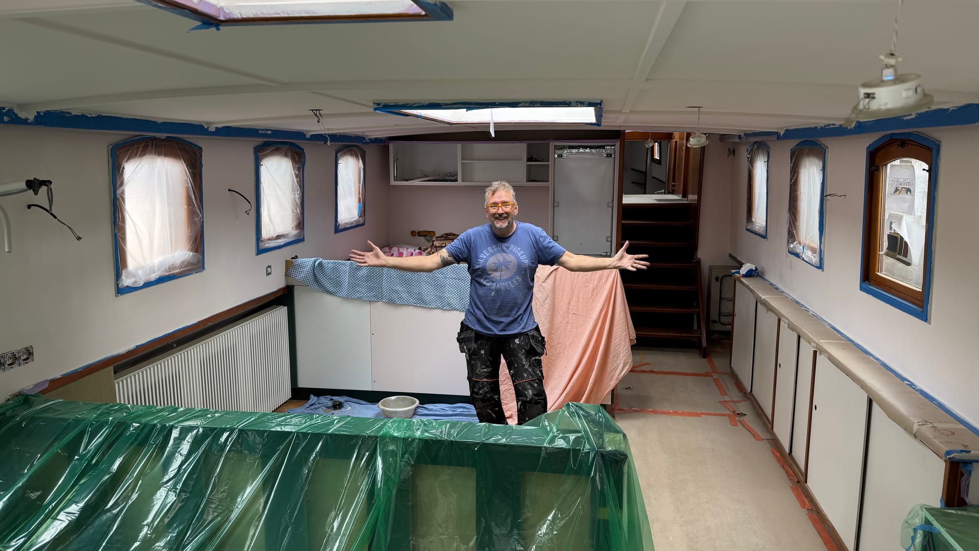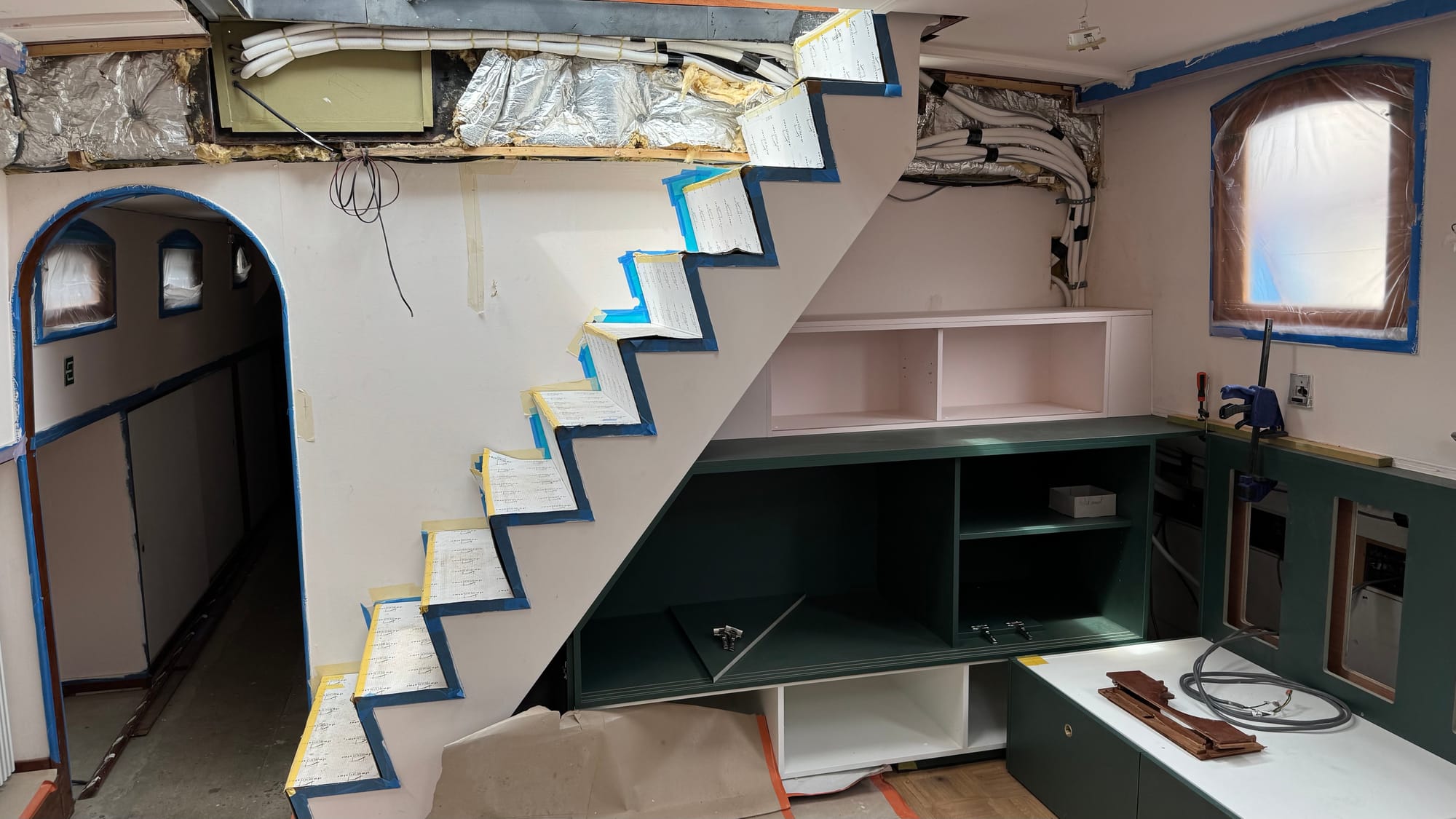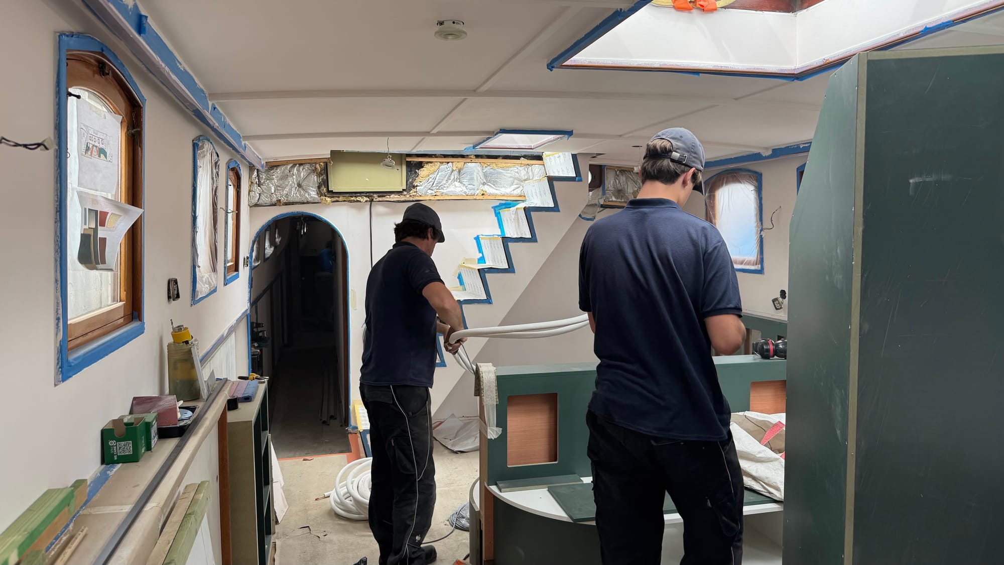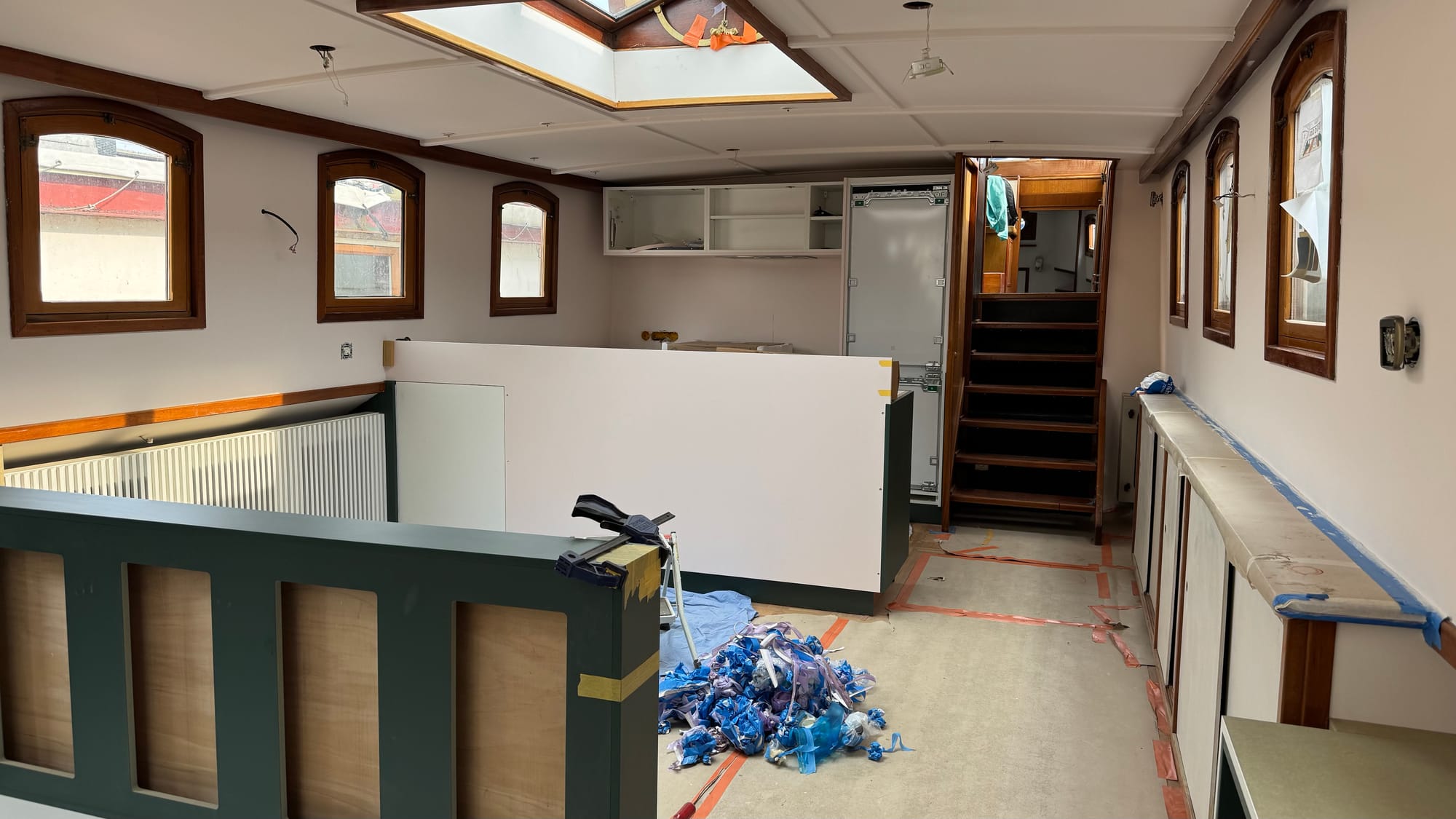 Saturdays have become one of our favourite times on Delfine now. With all the builders and contractors off the boat, we get her to ourselves, which means tackling some inside jobs. We decided it was time to push forward with the final coat of paint on the interior. The lighting is all roughed in, so we should be good to proceed. If we need to touch up a spot later, so be it. It makes sense to push ahead because once the upholstery is installed, the floor coverings are removed, and the carpets are down, it will be more challenging to paint.
