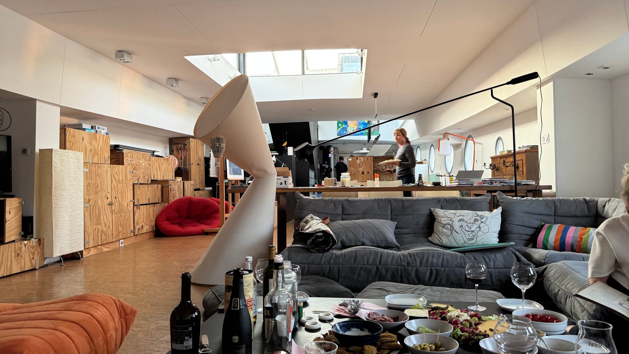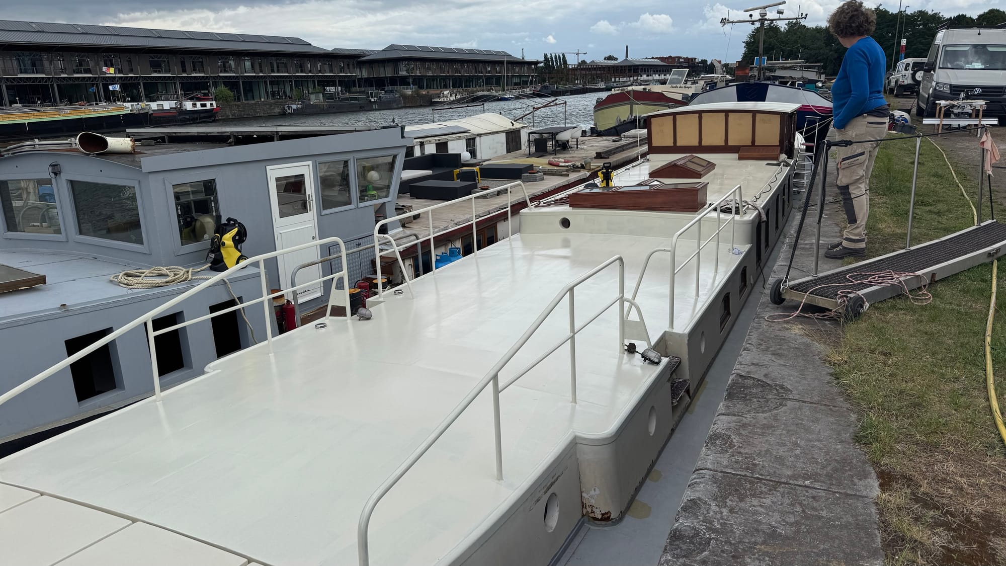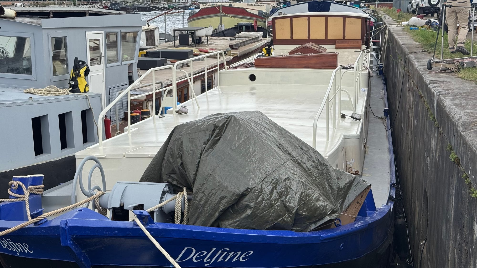 On Wednesday night, we went to Alex's boat with Peter and Sophie (from the shipyard) for drinks and dinner. We had a great time, enjoying their huge barge (40 m and 6.8 m wide), chatting in three different languages: French, Dutch, and English! Peter and Sophie were the most fluent across all three, so they translated on occasion when we got stuck, but we all did okay. Peter said the most challenging part was hearing us English speakers chat in French and the French speakers talk in English! We drank far too much – it took us the best part of the rest of the week to recover.