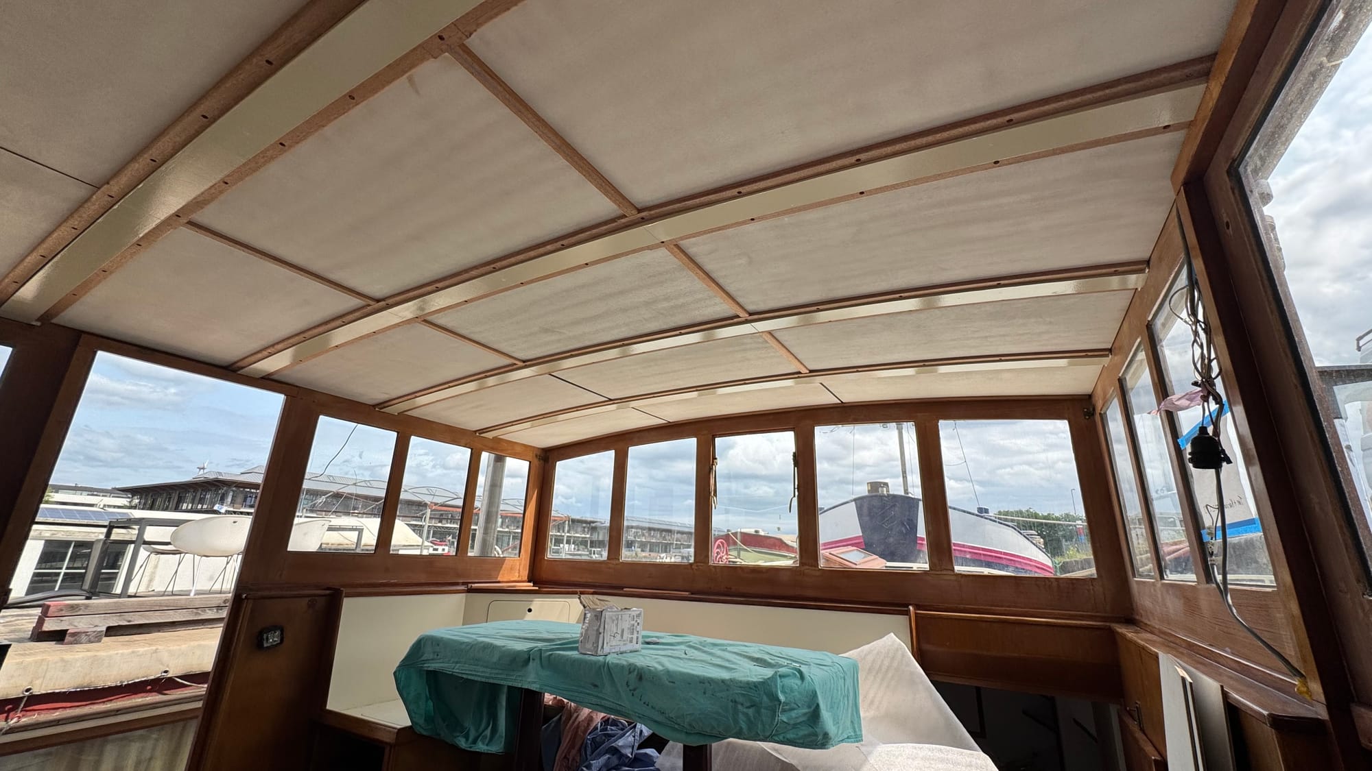 We can see out the front! The interior of the wheelhouse roof is now all insulated and lined with wood. We've got some holes to fill with wooden plugs, and it's ready for painting.
