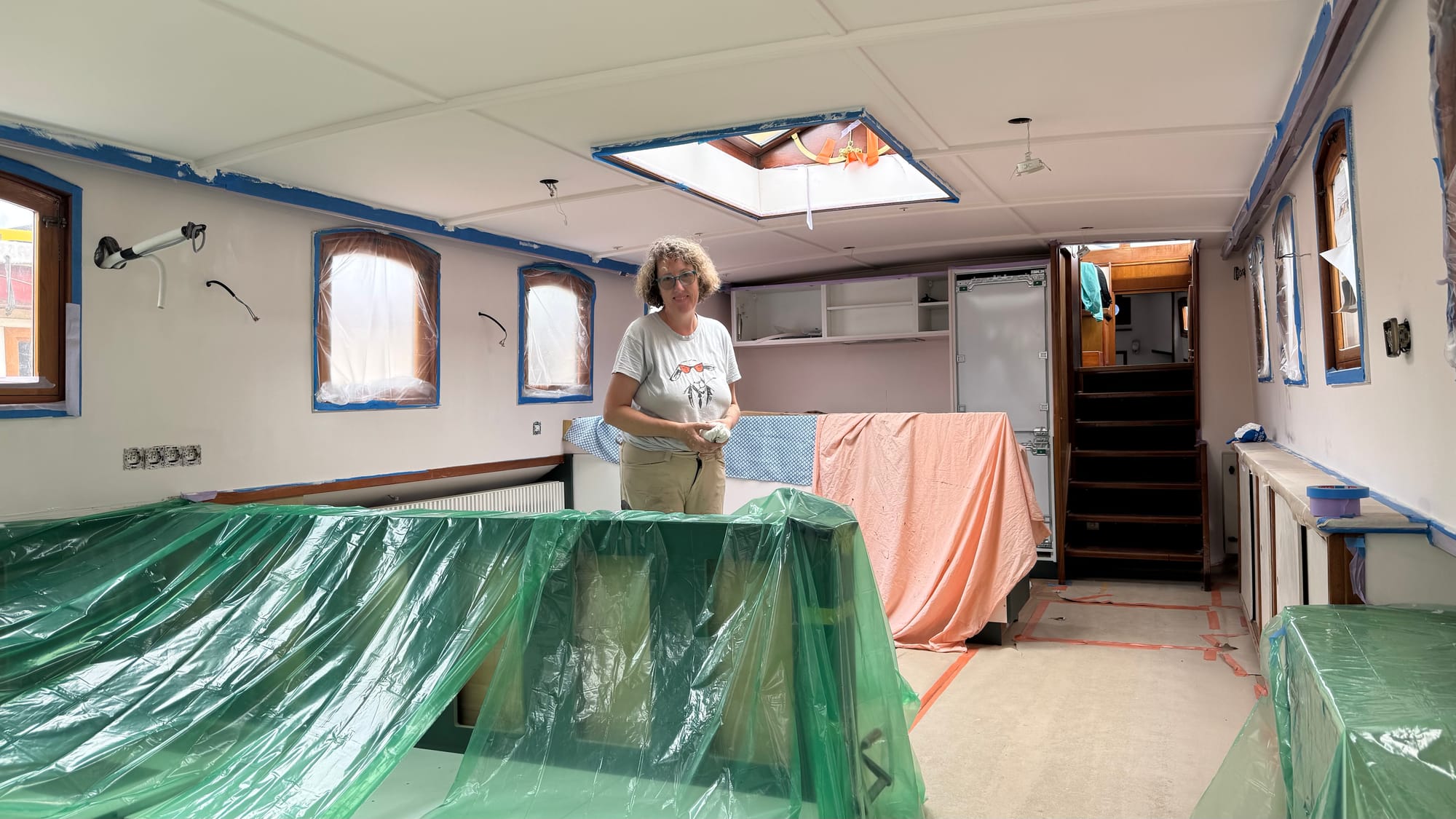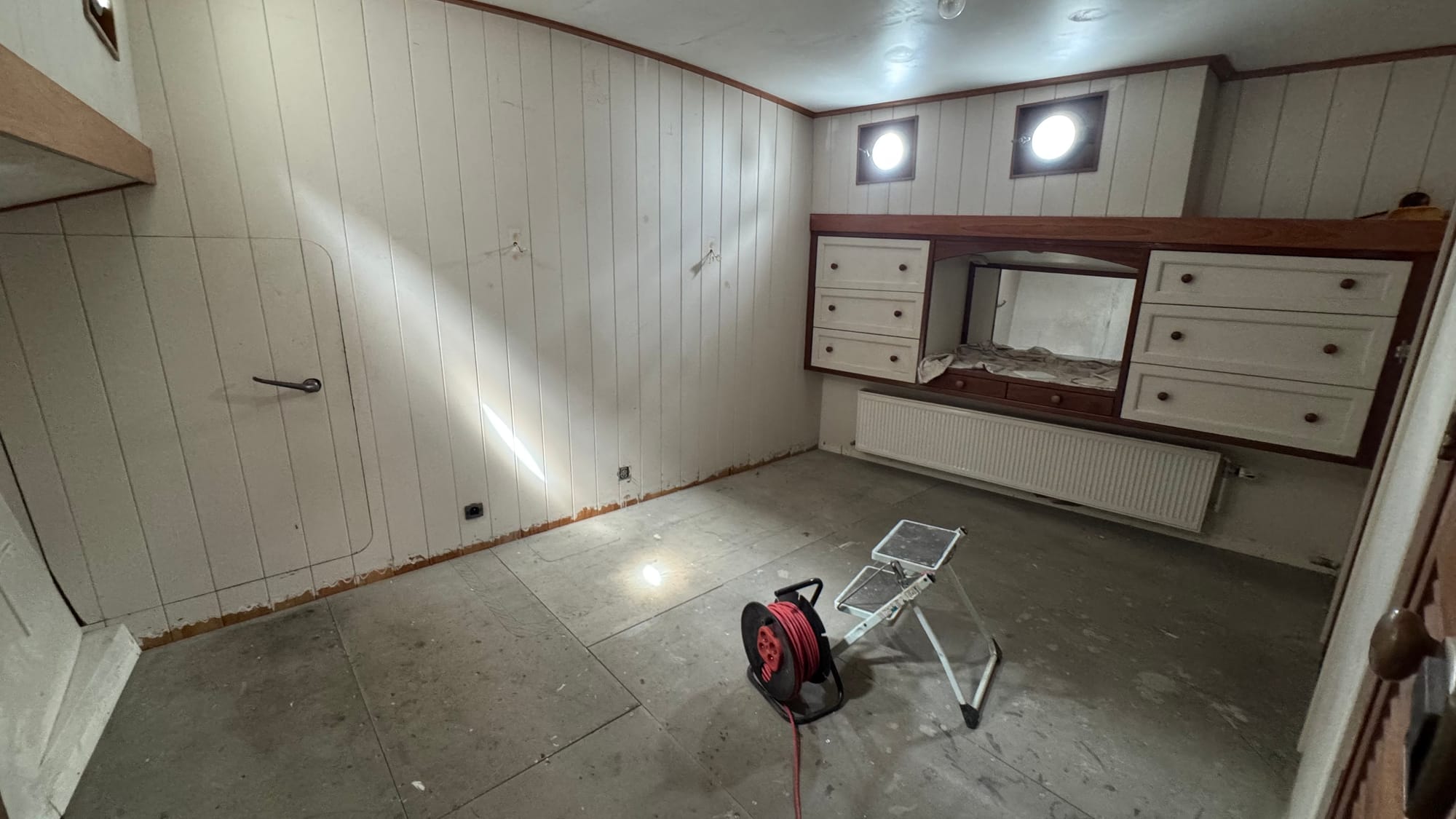 We've been using the Albert cabin as storage for rubbish. With the rapid progress everywhere else on the boat, we decided it was time to condense our belongings back into the forepeak and clean it out, ready for the builders. Friday morning, we sorted through everything, emptied some unused items from the forepeak, and made a run to the recycling park. With Albert empty, we're now able to start prepping the walls for painting, and Karina has been hard at work on that.