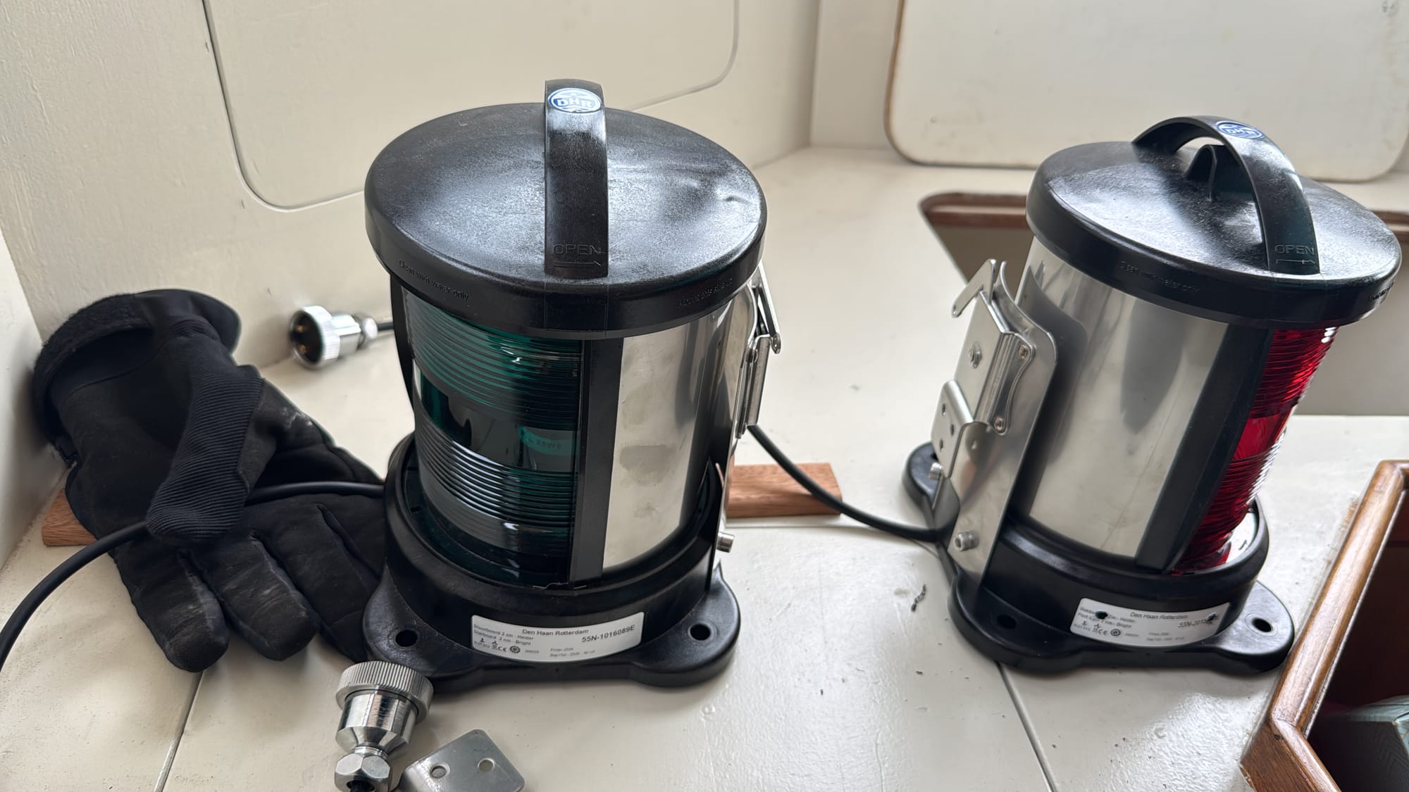 Horn in place. Navigation lights installed. The glove was to hold the metal after I sliced the back of my finger on the mounting bracket!