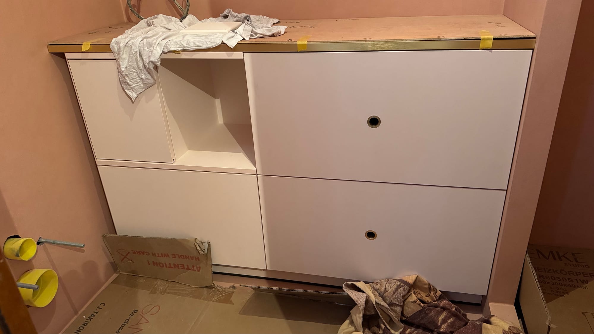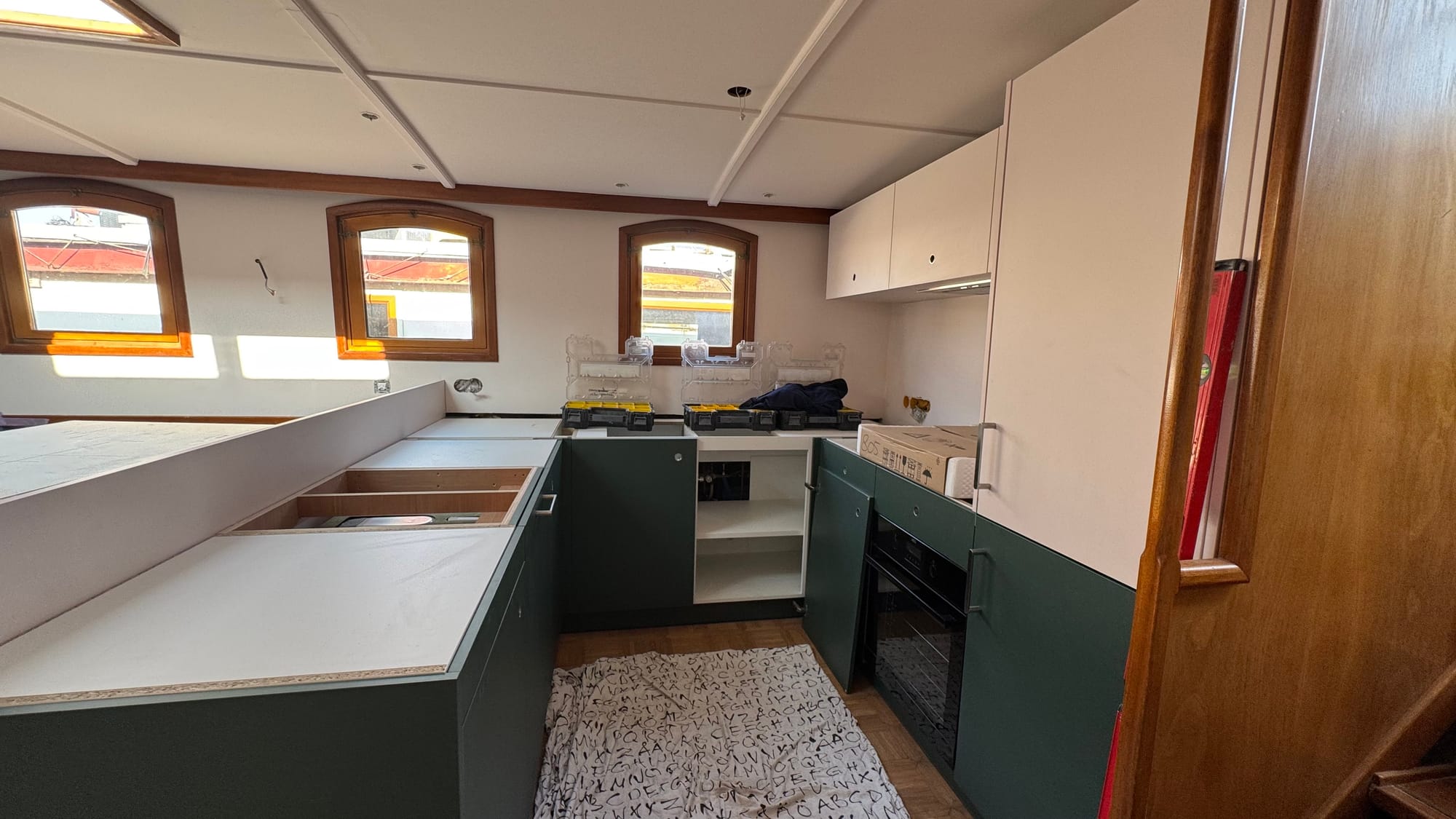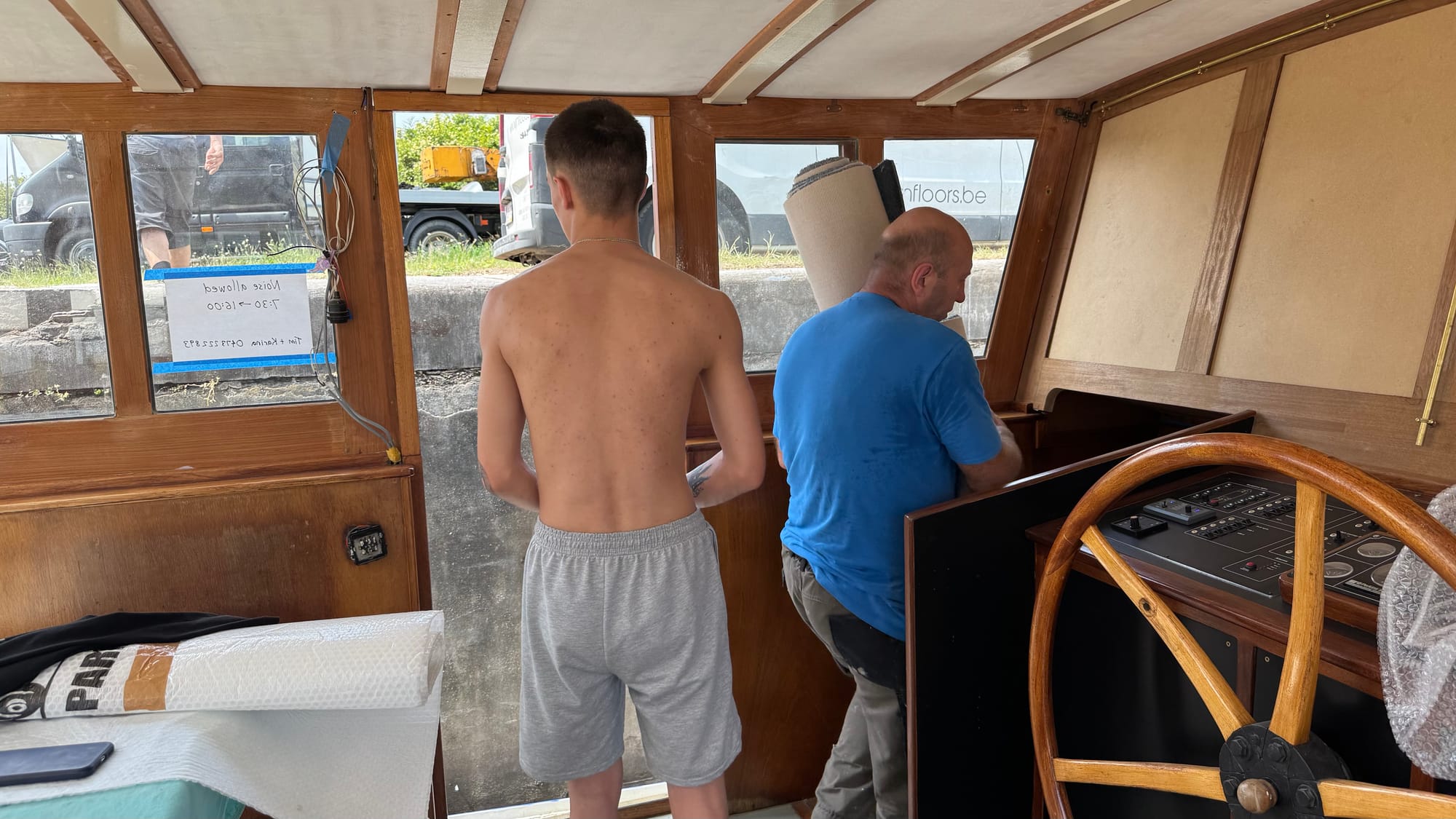 The week started quietly. Monday was a public holiday here in Belgium (Whit Monday / White Monday – the end of the Easter traditions). We headed out to Delfine and spent the day indoors as it was stormy and raining. Karina worked on the final prep for the Albert Cabin as well as some of the patches in Simone and the corridor, while I painted the radiator cabinets and the guest bar area.
