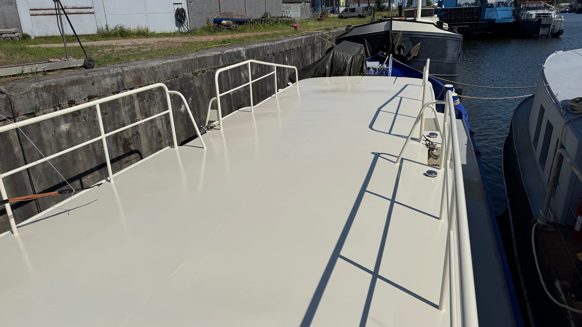 We managed to complete the second finish layer on the guest deck and, on Peter's advice, laid down some inexpensive outdoor carpet to protect it from boots walking over the gangplank with shipyard dirt and stones while it hardens. It takes six days to cure fully, according to the spec sheet – we'll wait until that's done, then put out the outdoor carpets and assemble the deck furniture!