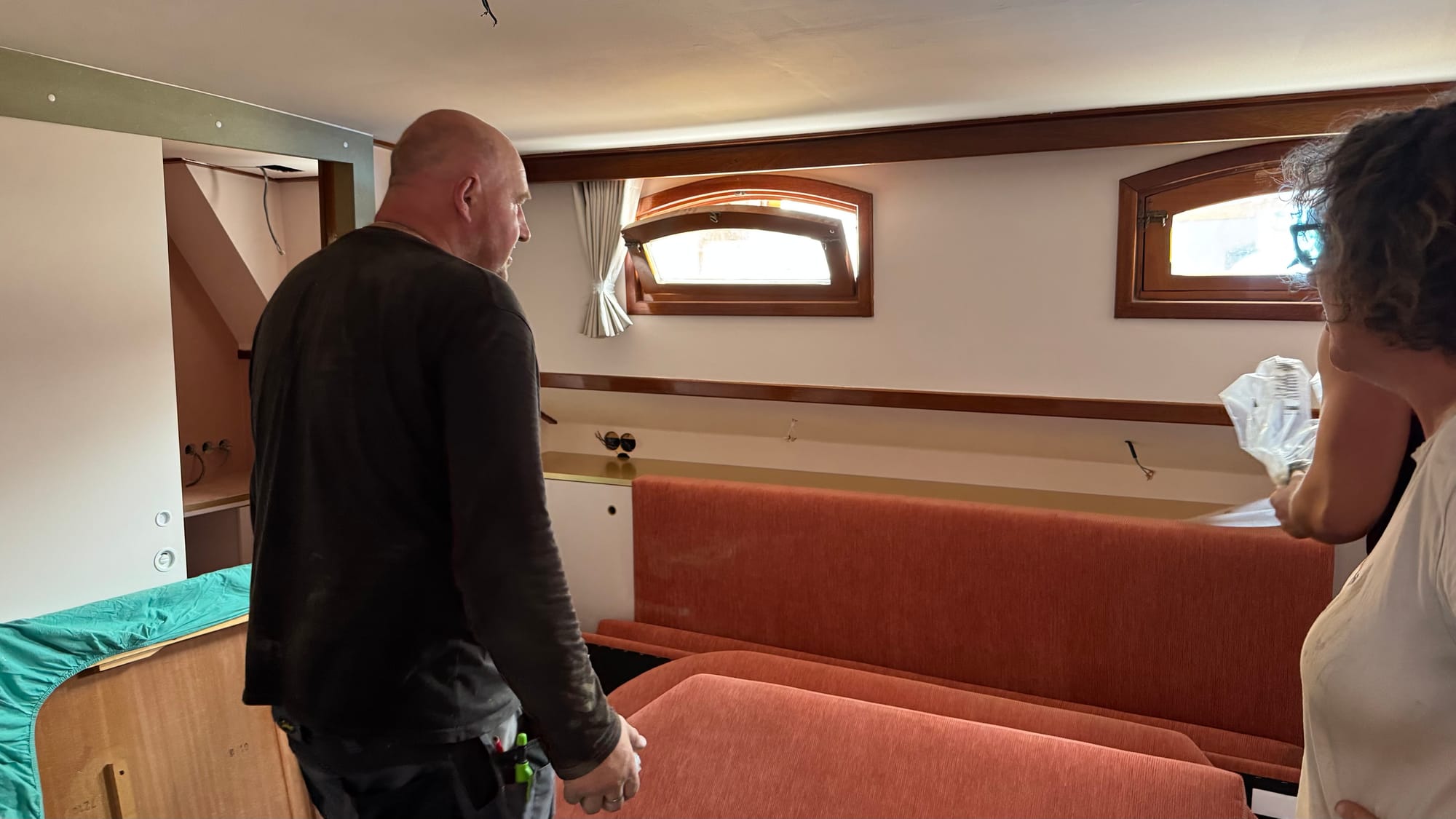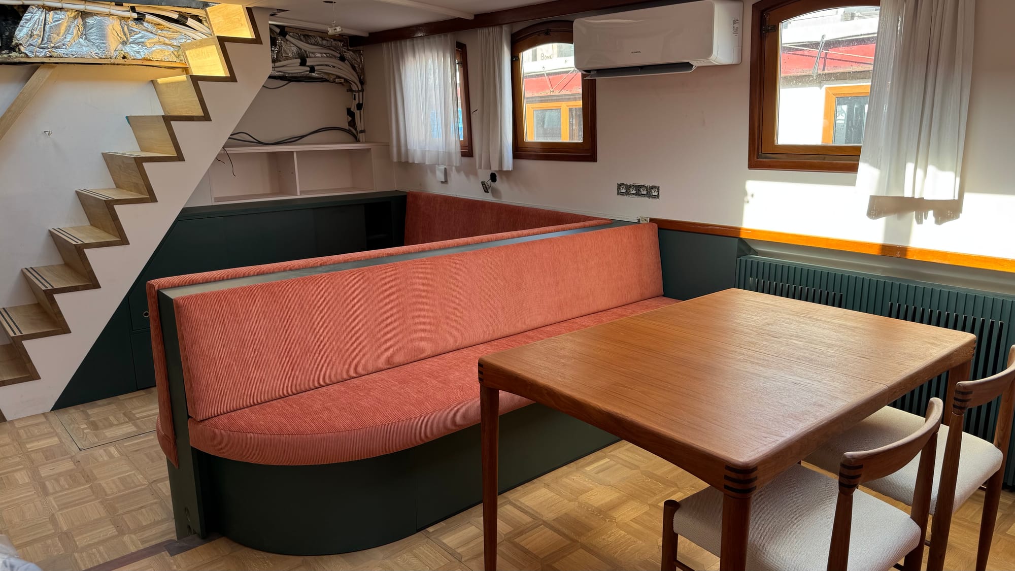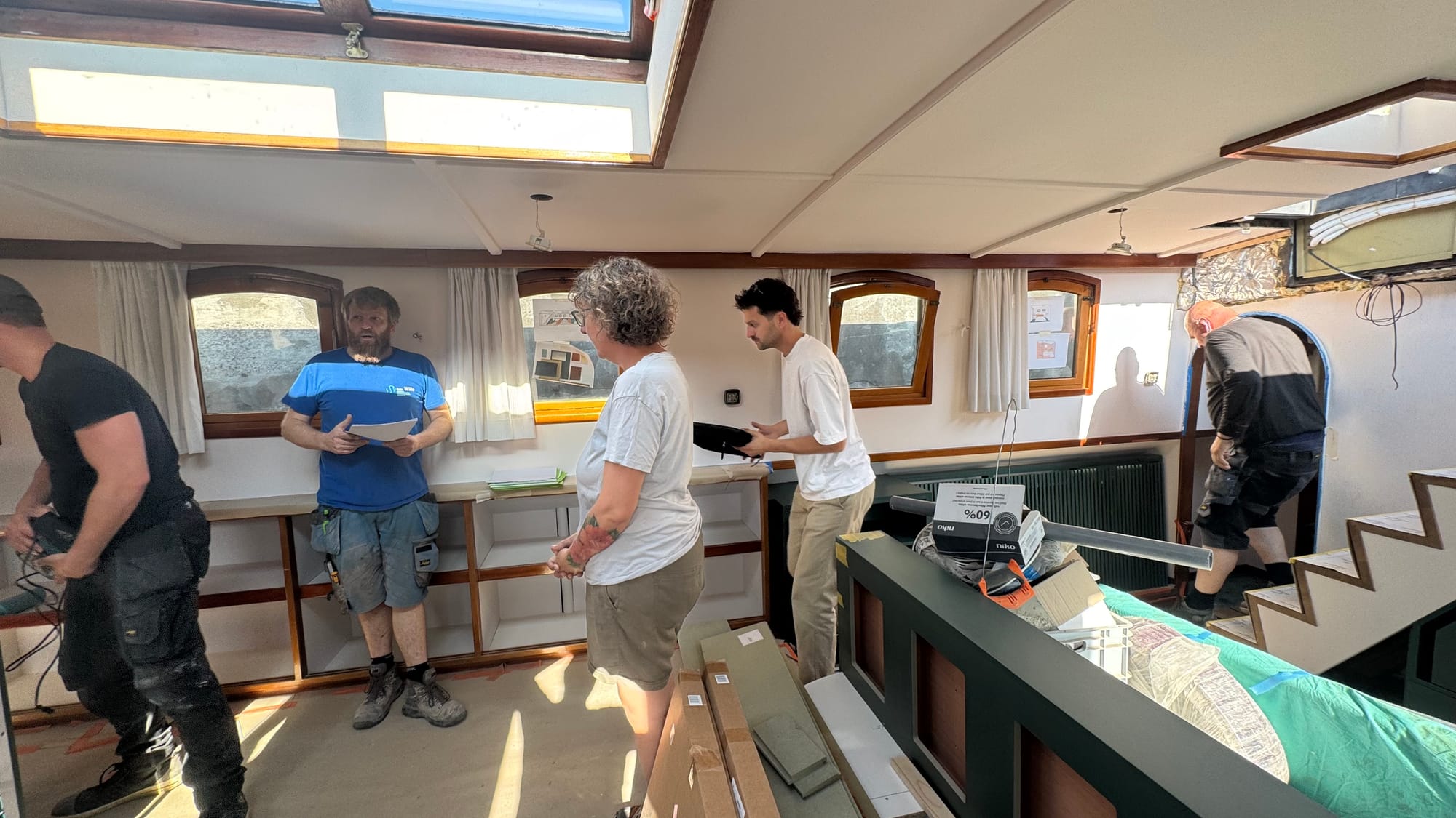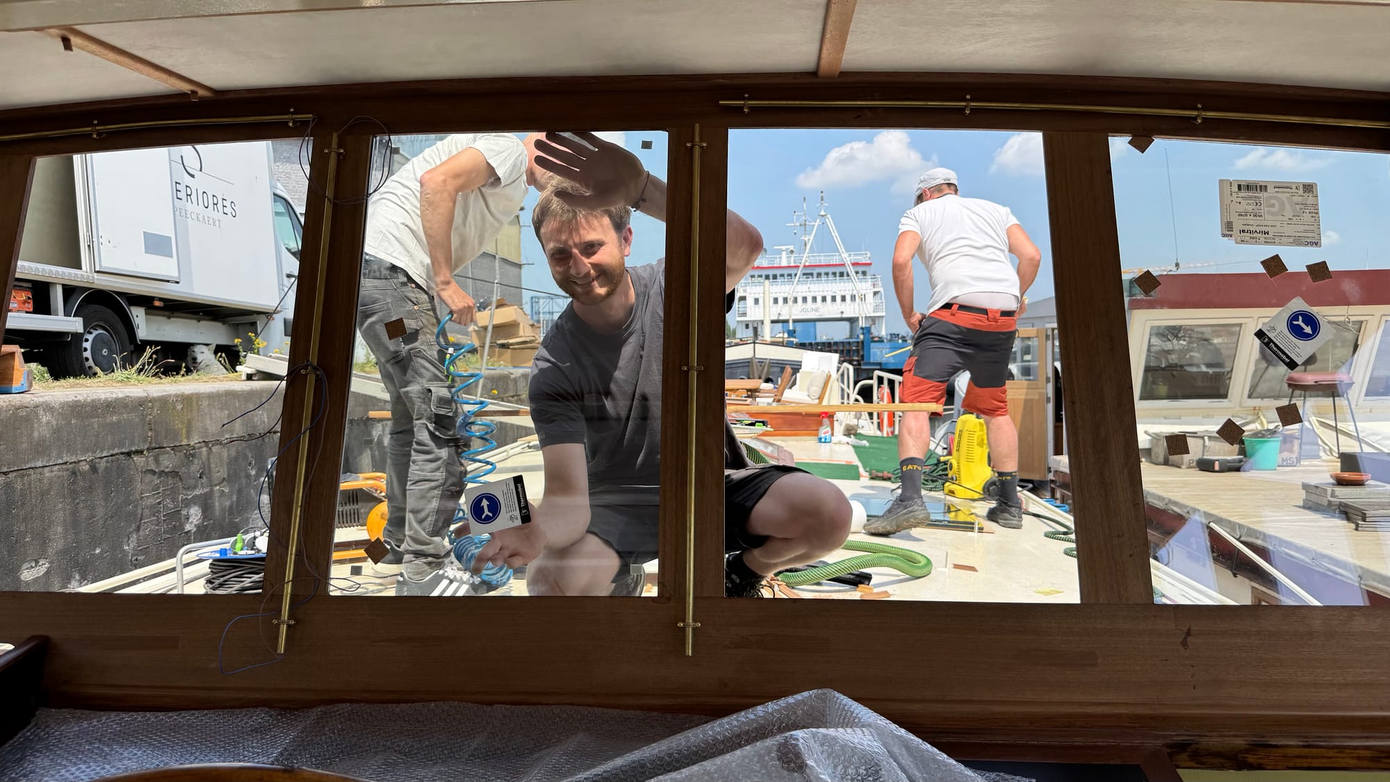 The curtains went in. Karina spray-painted the radiator covers. Endless bits of trim were fitted and finished on the furniture. Simon, Jones and Kaisen returned to complete the interior ceiling in the wheelhouse and fit the windows, as well as doing some additional waterproofing. The electricians were on site. Kristof and Emile were on site. The glass contractors installed the shower glass. Sliding doors were fitted. Jeff came out to do a lot of urgent electrical jobs for the boat (including fixing down the battery compartment and helping me reconnect the solar panels). The seating cushions all arrived and were fitted. Bart came and completed the air-conditioning install (just in time for a 35C day on Saturday).