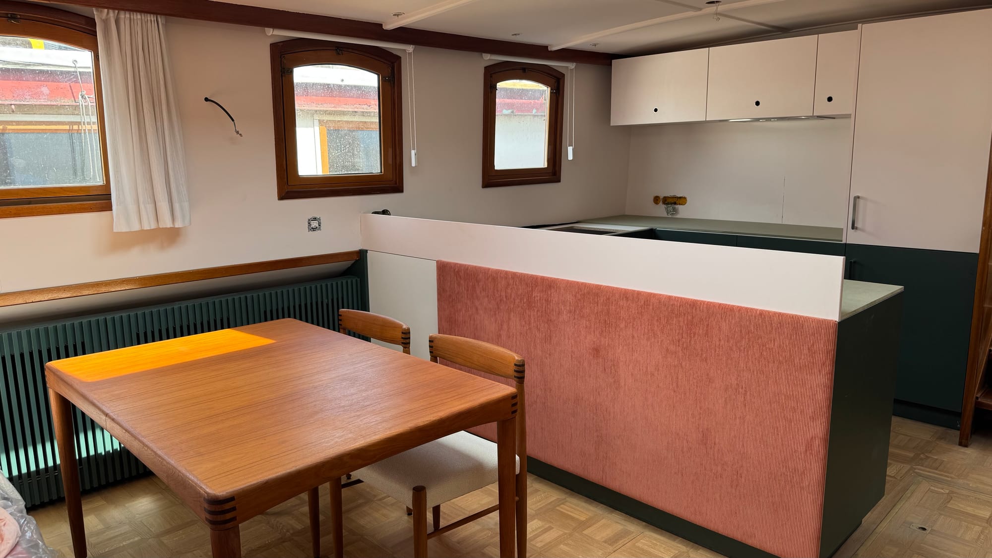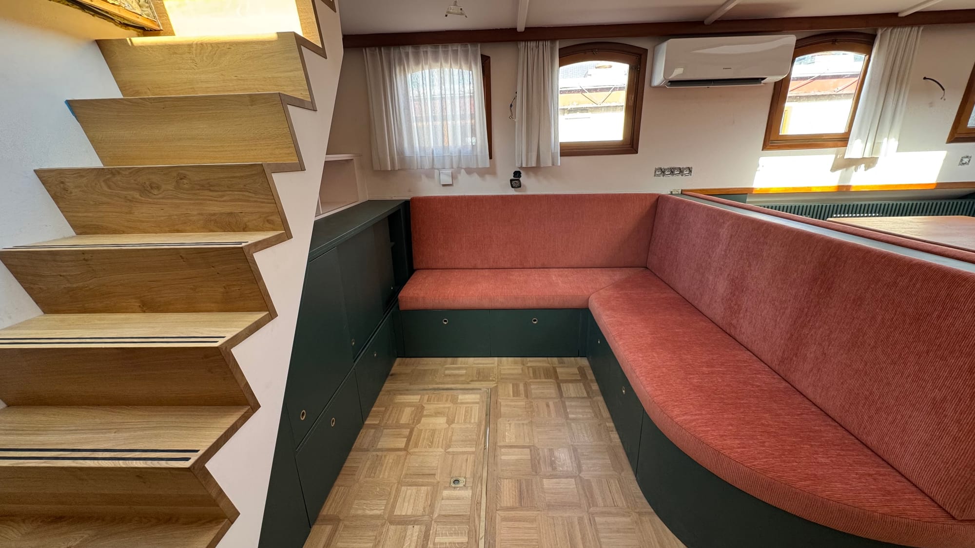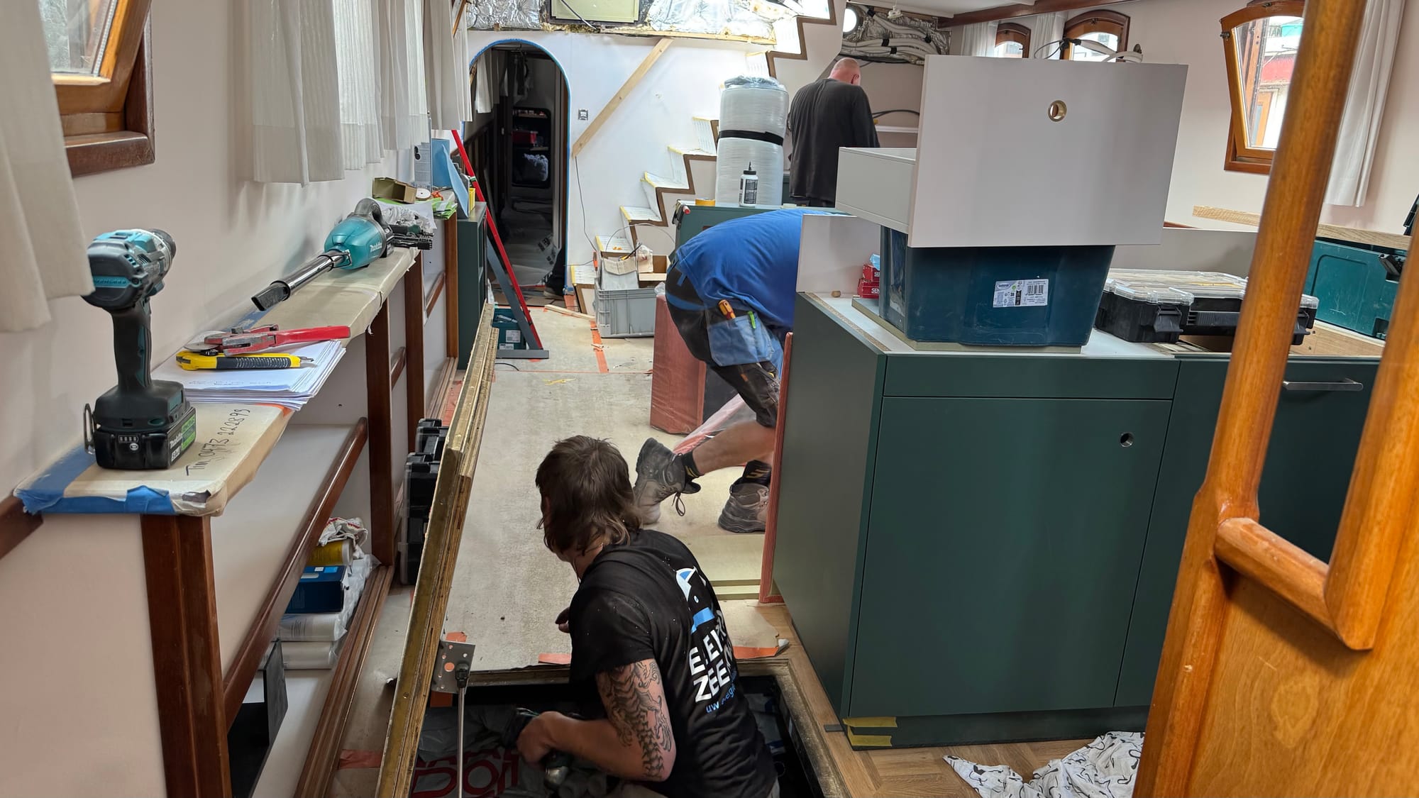 The curtains went in. Karina spray-painted the radiator covers. Endless bits of trim were fitted and finished on the furniture. Simon, Jones and Kaisen returned to complete the interior ceiling in the wheelhouse and fit the windows, as well as doing some additional waterproofing. The electricians were on site. Kristof and Emile were on site. The glass contractors installed the shower glass. Sliding doors were fitted. Jeff came out to do a lot of urgent electrical jobs for the boat (including fixing down the battery compartment and helping me reconnect the solar panels). The seating cushions all arrived and were fitted. Bart came and completed the air-conditioning install (just in time for a 35C day on Saturday).