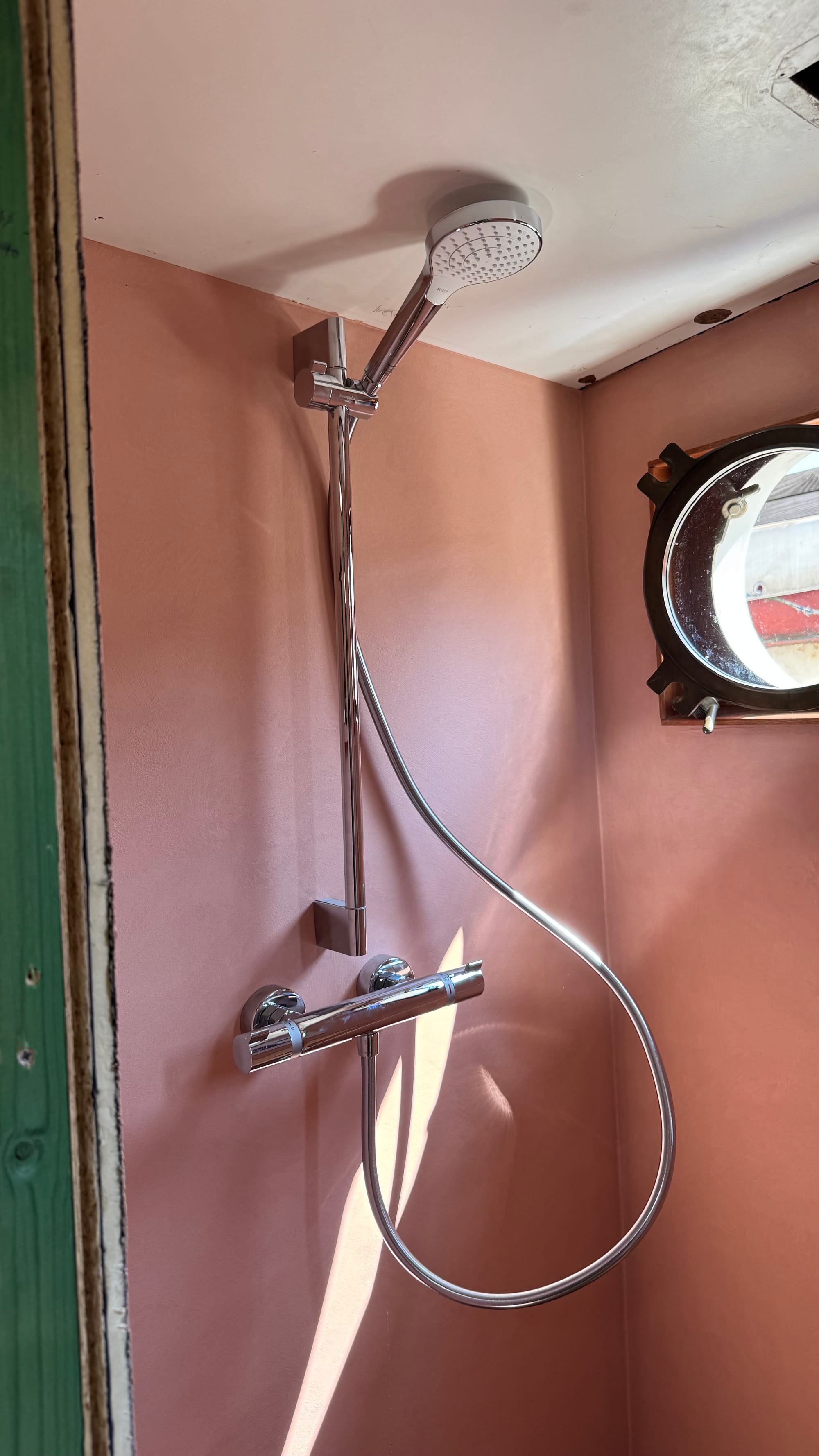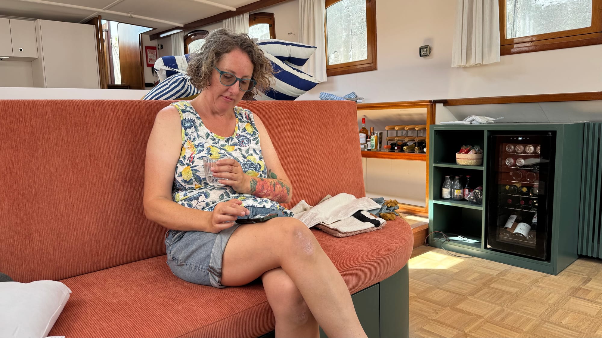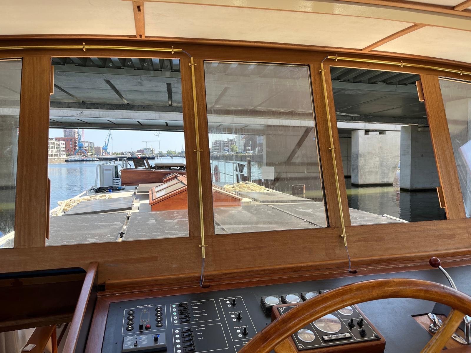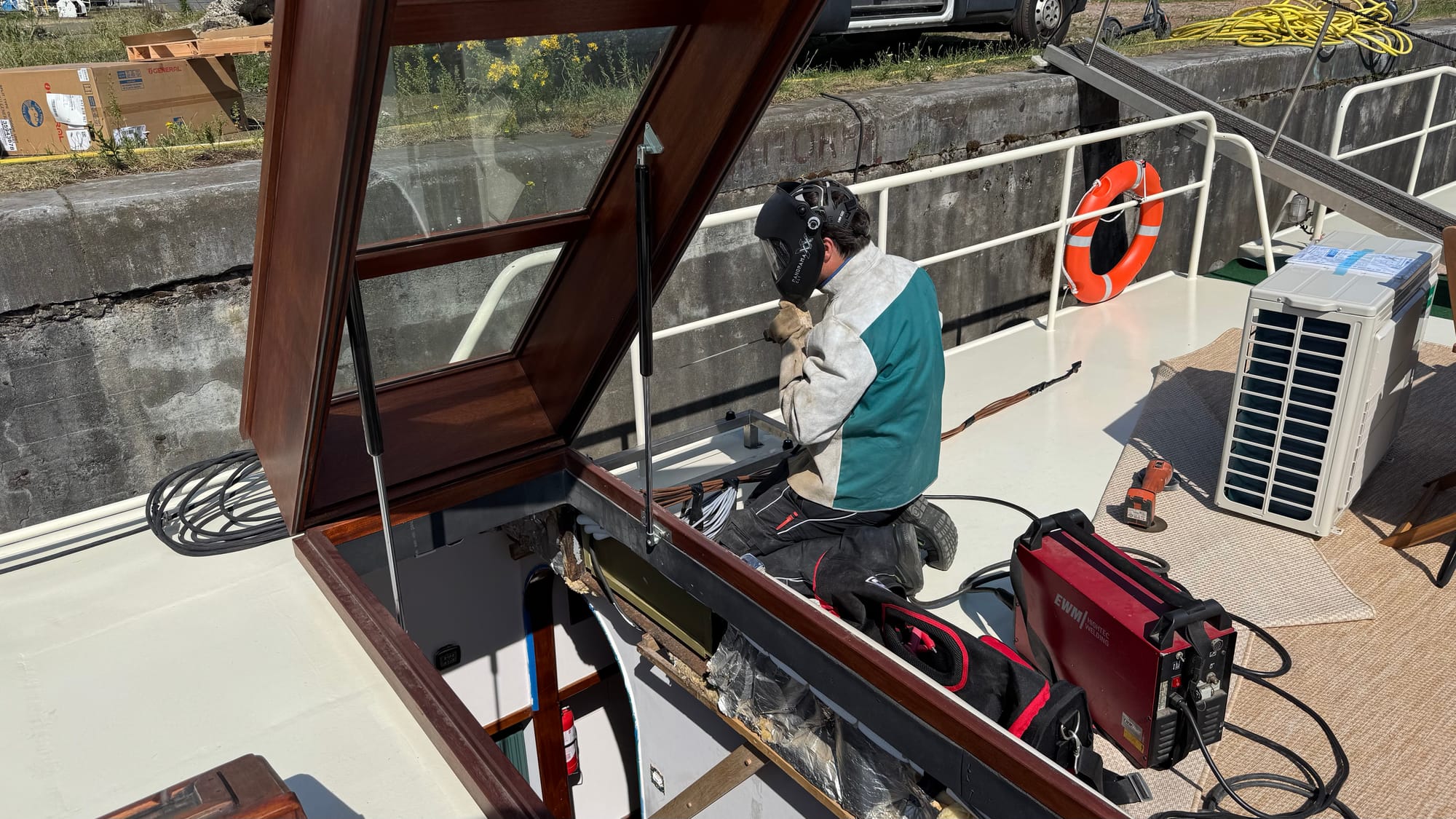 The curtains went in. Karina spray-painted the radiator covers. Endless bits of trim were fitted and finished on the furniture. Simon, Jones and Kaisen returned to complete the interior ceiling in the wheelhouse and fit the windows, as well as doing some additional waterproofing. The electricians were on site. Kristof and Emile were on site. The glass contractors installed the shower glass. Sliding doors were fitted. Jeff came out to do a lot of urgent electrical jobs for the boat (including fixing down the battery compartment and helping me reconnect the solar panels). The seating cushions all arrived and were fitted. Bart came and completed the air-conditioning install (just in time for a 35C day on Saturday).