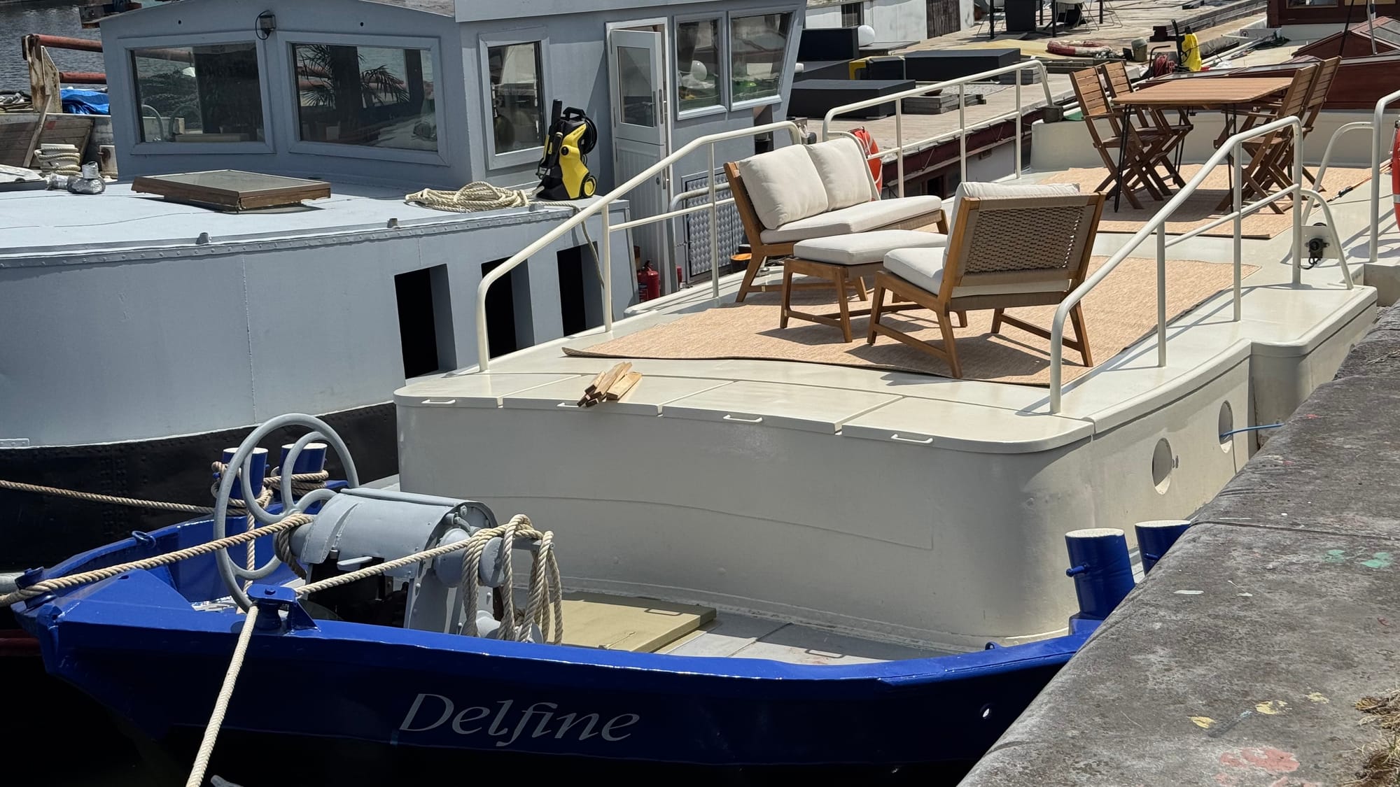 So in 30+ temperatures we hauled the two boats alongside back beside Sophie's boat. Her daughter saw us and helped us with her friends which was hugely appreciated. Next, we dragged Delfine out (after solving a sticking throttle cable first!), and pulled her alongside the boat behind us. Then, with Martin's help, we dragged the first two boats back along side the quay. It took a couple of hours and we were exhausted at the end of it.