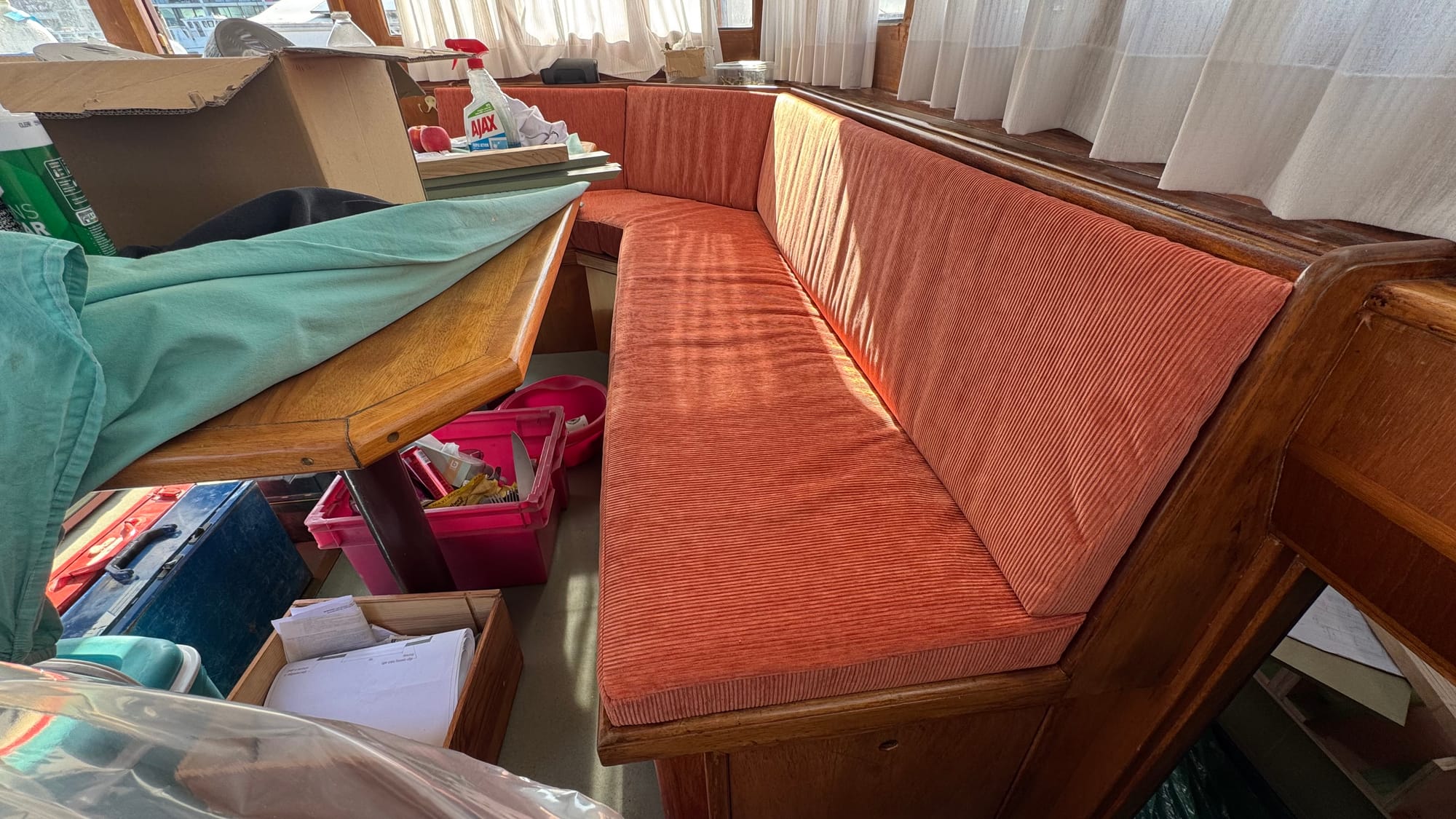 Errors were made. We suspect (but don't know for sure) that when the curtains were installed, a screw was fitted too close to the glass, resulting in two sections of the wheelhouse glass cracking. Some bits of trim will need adjusting. The cushions in the wheelhouse are a touch long. For now, though, we've reached the goal. We can live on Delfine again when we want.