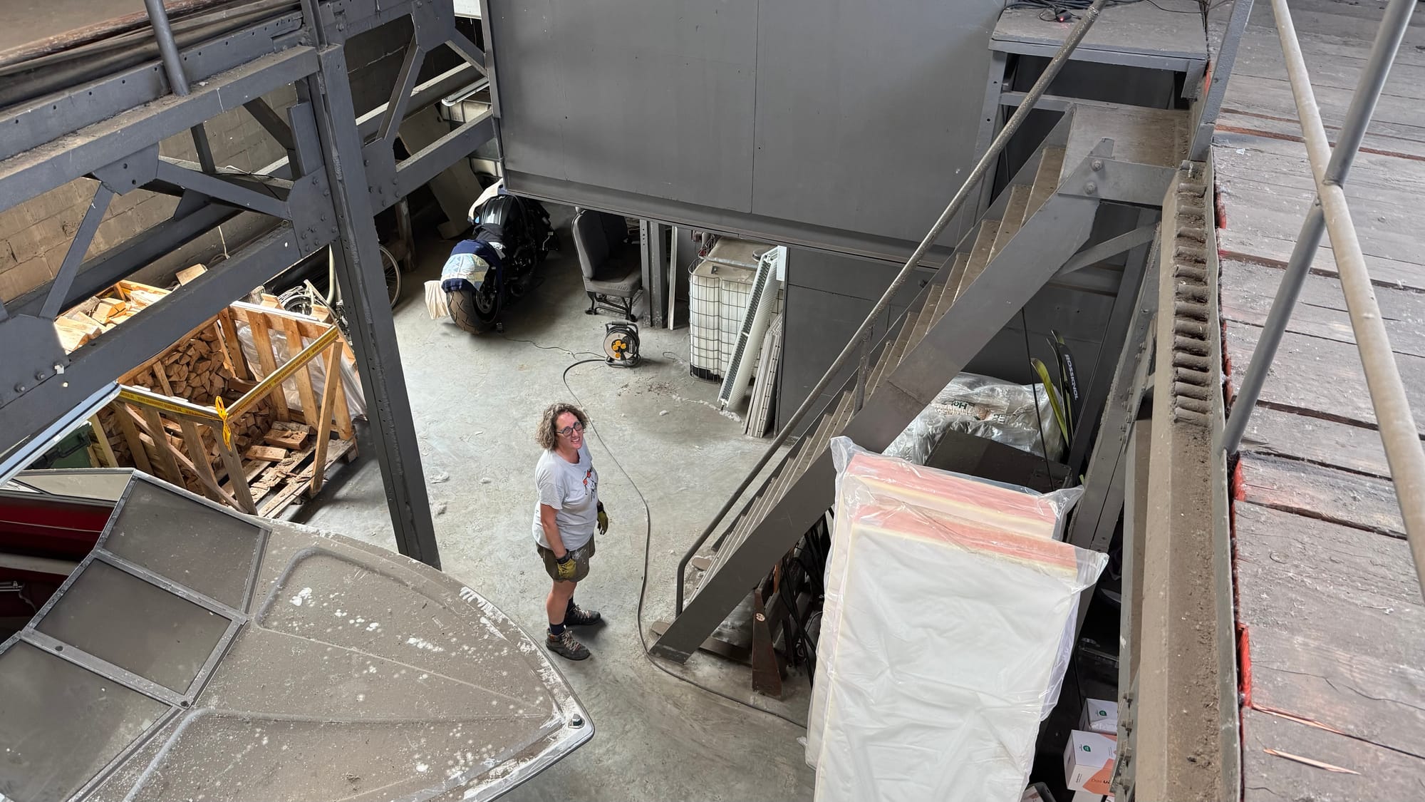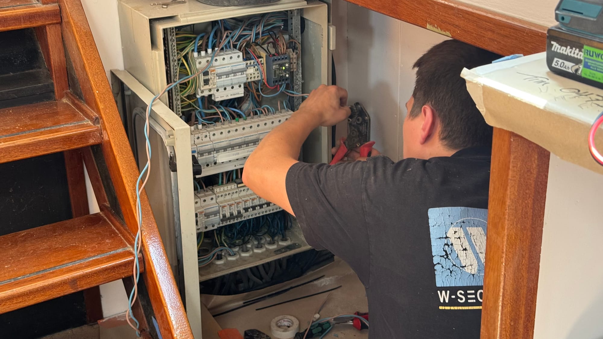 At times last week, up to 11 people were working on board Delfine (including us).