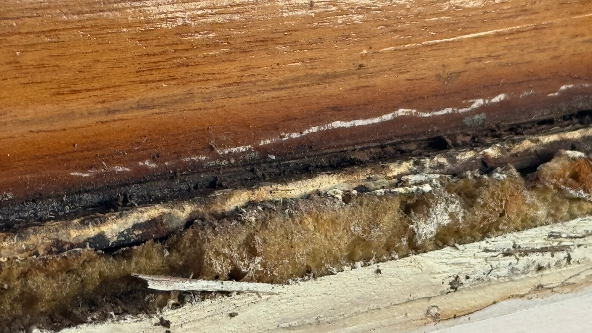It proved to be the right decision. The seal around the frame had all deteriorated, and the patch I'd tried to make wasn't good enough. Underneath the frame was full of water. With the frame removed (and the correct tools and new knowledge), it was trivial to sand it back to bare metal, apply several coats of primer, and this time (unlike the earlier ones), also add the between and finish layers. The window frame is back in place now, and I'm confident that it won't leak anymore. While I was painting the window recess, I also painted the mount for the AC, which looks great now.